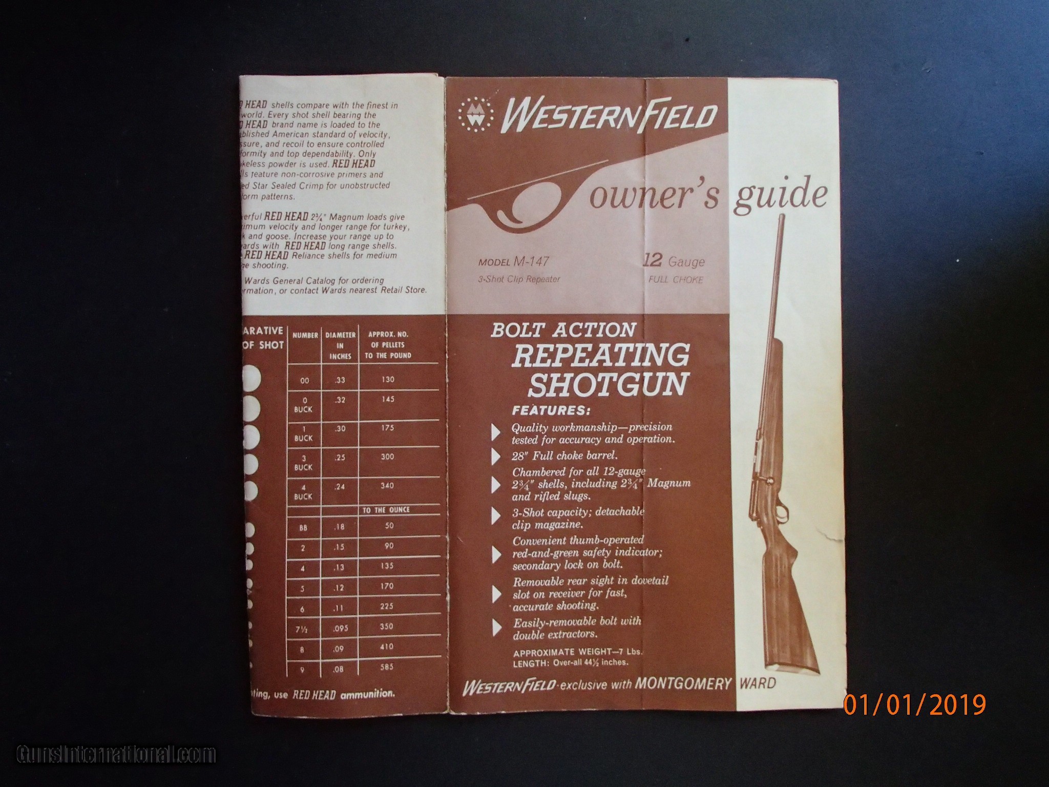 SOLD Curio/Relic: Yes Manufacturer: Westernfield Model: M-l47 3-Shot Clip Repeater Serial Number: NONE Bore: Excellent Condition: Excellent Metal Condition: perfect Wood Condition: Very Good Bore Condition: Excellent Barrel Type: Round Action: Bolt Action Gauge Info: 12 GAUGE Stock: Monte Carlo, Finish: Exceptional wood Chokes: FULL Item Location: LONG ISLAND NY |