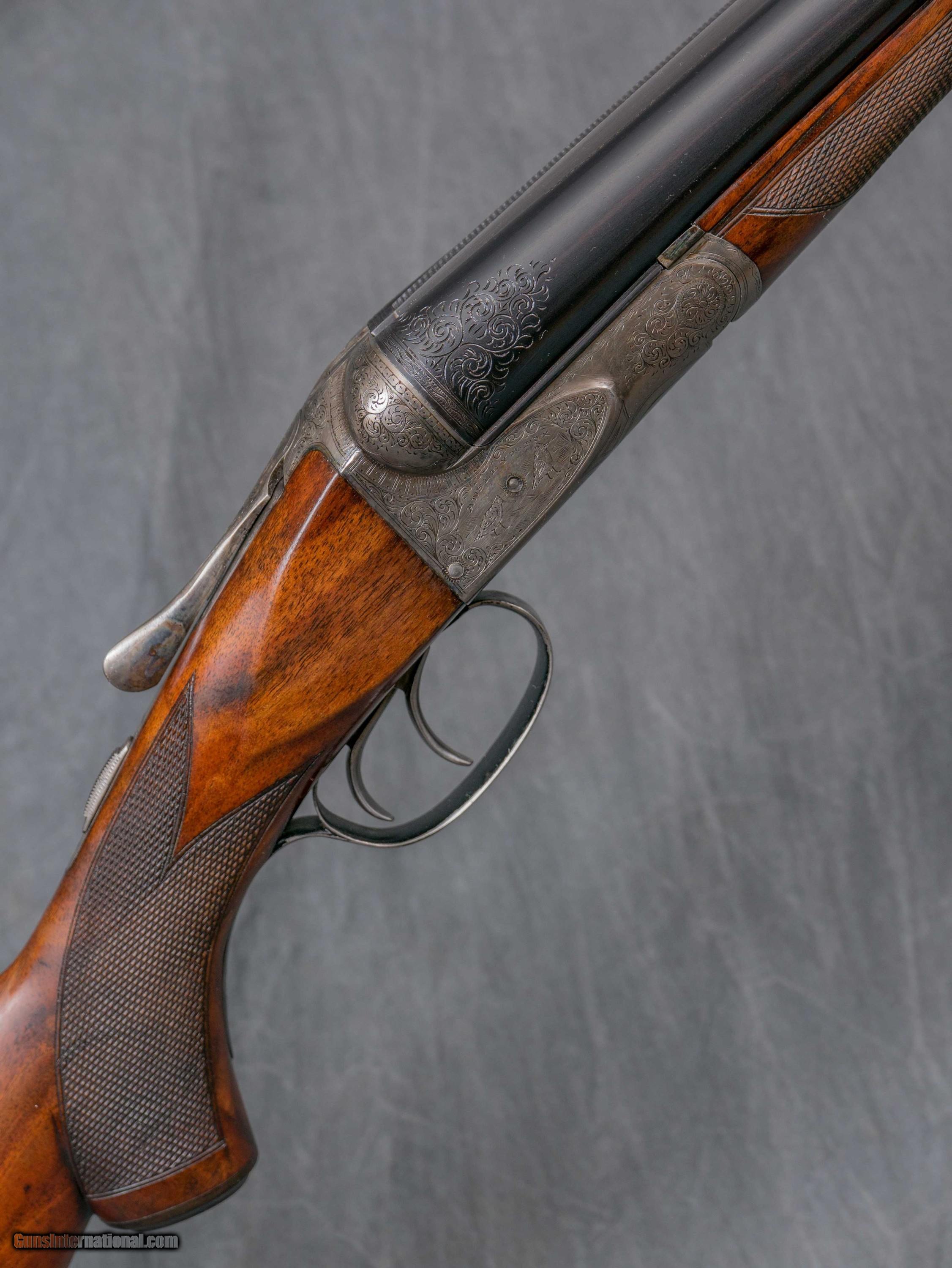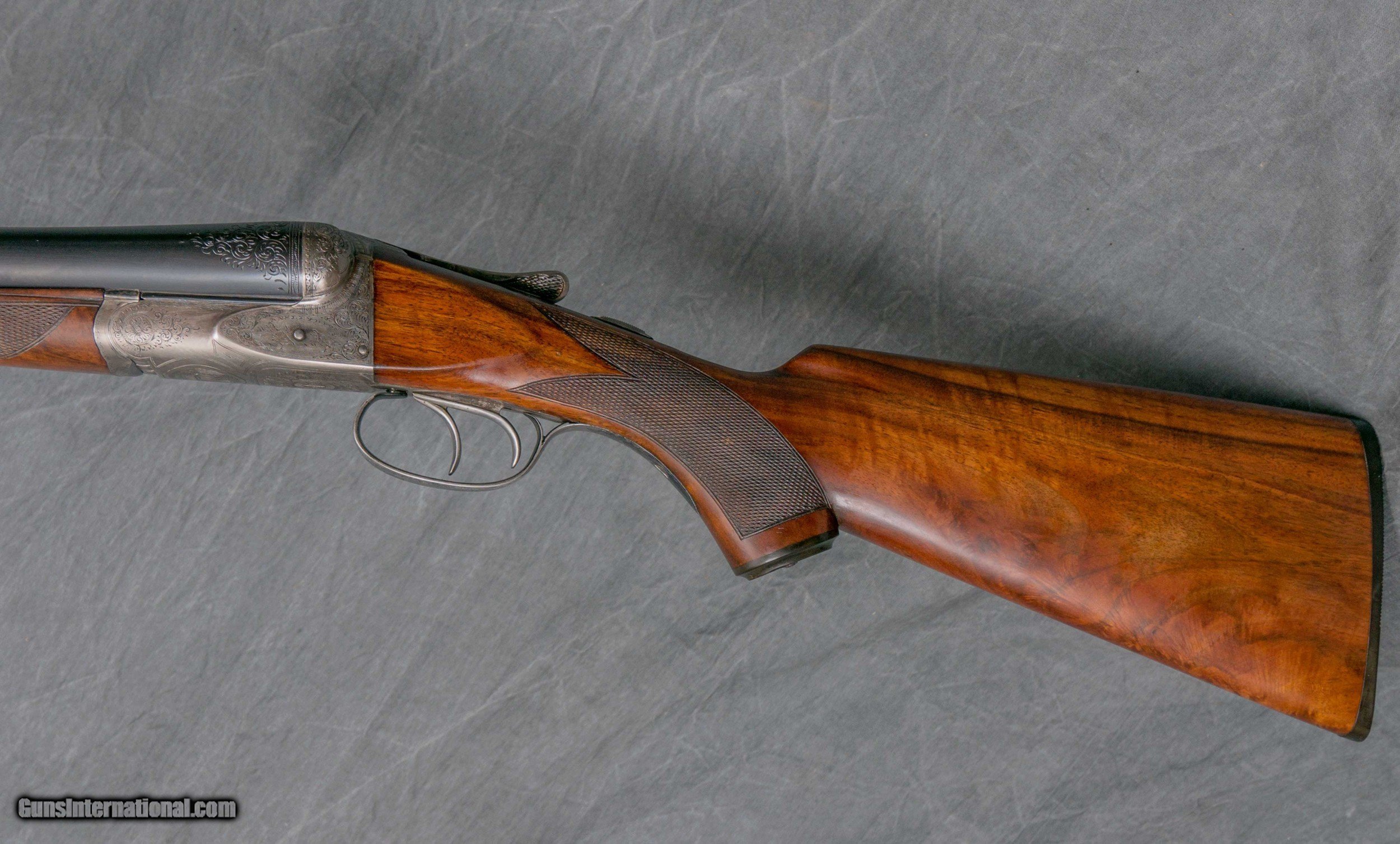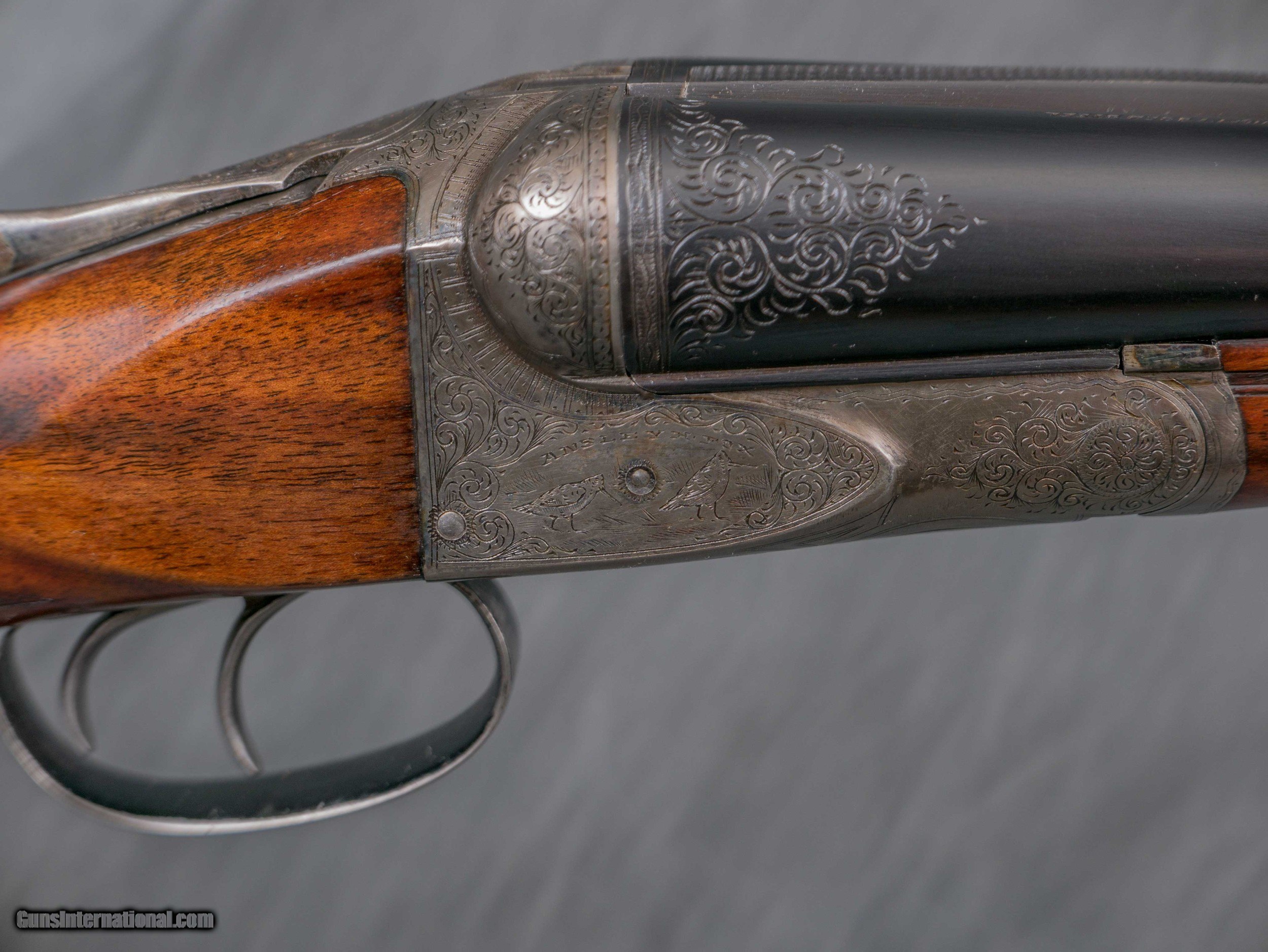 Description: A.H. FOX CE Grade 12 gauge SxS, Game scene engraved color case hardened action, 28" bbls. w/ 2 5/8" chambers, Matted concave rib, Chokes: Right .728 / .020 / M & Left .731 / .044 / F, Double triggers, Automatic ejectors, Automatic safety, Well-figured capped semi-pistol grip stock w/ original butt plate, Ebony-tipped splinter forearm, Stock Dimensions: DC: 1 9/16" x DH: 2 11/16" x Cast: 1/8" OFF at Heel x LOP: 14", Weight: 7 lb., Condition: Excellent, 100% original, Made in Philadelphia, PA circa 1924, Serial #29278 (C8090) FIELDSPORT: $7995. SOLD |