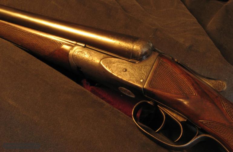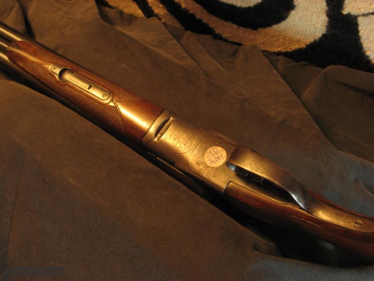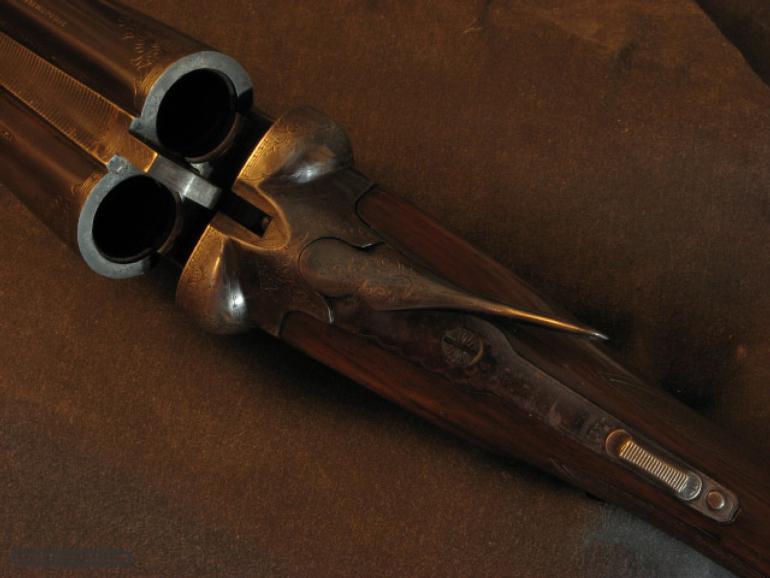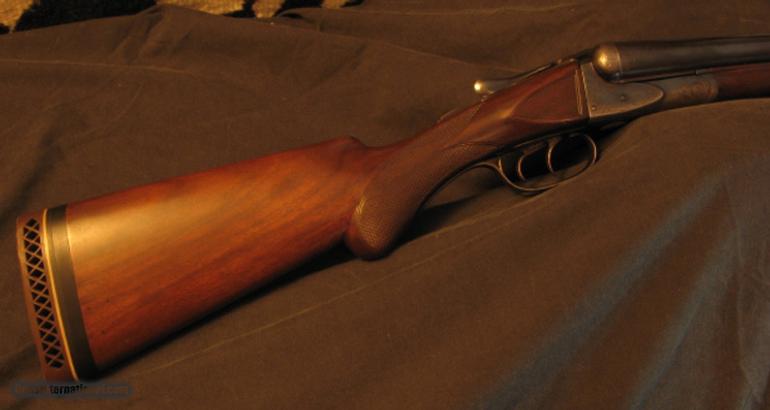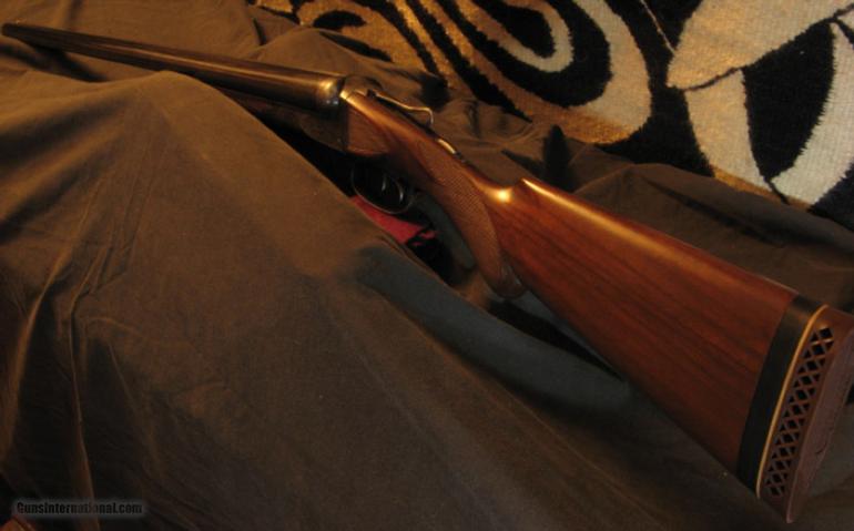 Description: A lightweight (6.5lb) upland gun with rare factory-confirmed #4 26" x 2 3/4" steel bbls. Bore/choke dimensions are L 735/702 (IM) with 3.5" of constriction; R 735/720 (strong IC) with 4" of constriction. Walls L033 R035. Lots of blue on bbls, action retains about half the original colors with some fading, and the balance (mostly underside) silver-brown. Very light pitting on action top tang and bottom/trigger plate. Ejectors work properly. Good screws, timed correctly. Buttstock has been refinished, has Prince of Wales grip and 14" lop through 1/2" black spacer and 3/4" Pachmyr White Line pad. Drops are 1 5/8" and 3", pretty close to neutral cast. Not a cream puff but a very solid and attractive shooter CE grade. SOLD |