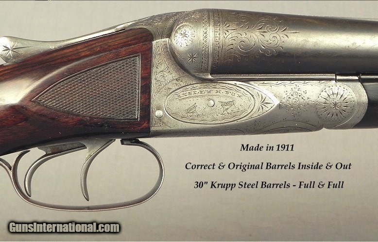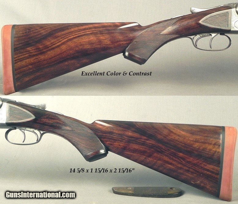 Description: #18297, A. H. Fox Gun Co., Phila, Pa. U.S.A.: A 12 Bore C Grade That Remains in Very Nice Condition with Excellent Wood, It was made in 1911, 30" Extractor Krupp Fluid Steel Barrels, .725 .035 & .035" (Full & Full), 2 3/4" chambers, Correct & Original bore dimensions with correct wall thickness of .036" on the right barrel and .038" on the left, Double triggers, Splinter forend with a Deeley & Edge pull down forend release, Pistol grip stock at 14 5/8 x 1 15/16 x 2 15/16" over a 7/8" Silvers pad with plugs for easy removal as it comes with the original Fox hard buttplate, The grip cap with the company name and address, Checkered side panels back of the frame, 7 lbs. 7 oz., An excellent piece of wood that has been oiled but not sanded as the metal is absolutely not proud in any area, The barrels have 80% original factory blue, Very slight traces of original case colors, The butt and forend with the fresh oil remains at 94%, The checkering is at 98%, The bores and chambers are excellent and totally free of any pits or dings. Here is a genuinely nice and solid A. H. Fox from the Philadelphia era that lasted until 1930 before going to Utica, New York when Savage acquired the company. SOLD Curio/Relic: Yes Shotgun Gauge: 12 Gauge |
