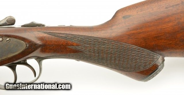 Description: Serial #107333, 12 GA (2 ??" chambers), 29 ?? inch (just slightly shortened) barrels with bright, lightly frosted bores choked about improved cylinder and full. The is the Knickerbocker Hammerless 1905 shotgun manufactured by H&D Folsom Arms marked with the Crescent Firearms proof indicating manufacture at the Norwich, CT factory. The all matching number side by side is in excellent condition with the barrels showing about 85-88% blue toning to a mottled plum-brown with some light scratches, scattered freckling and several very small nicks. The frame, marked "KNICKERBOCKER" on the left side plate and "American Gun Co. / New York" on the right and retains perhaps 85-90% of the original vibrant case color toning to a pleasing smoky grey on the edges and underside. The checkered walnut stock and forearm are in near excellent condition with many old scratches and contusions and several small cracks running with the grain extending about an inch from the edge of the plates on both sides. The LOP is 14" to the original hard rubber Folsom butt plate with drops of 1 7/8 and 2 ?? at the comb and heel respectively. The barrels are slightly off face without the forearm but solid with it in place having the lever just right of center when locked up. Mechanically the triggers, cocking indicators and automatic safety all function properly. A very nice Knickerbocker not often found in this high condition. FFL or C&R SOLD Curio/Relic: Yes |
