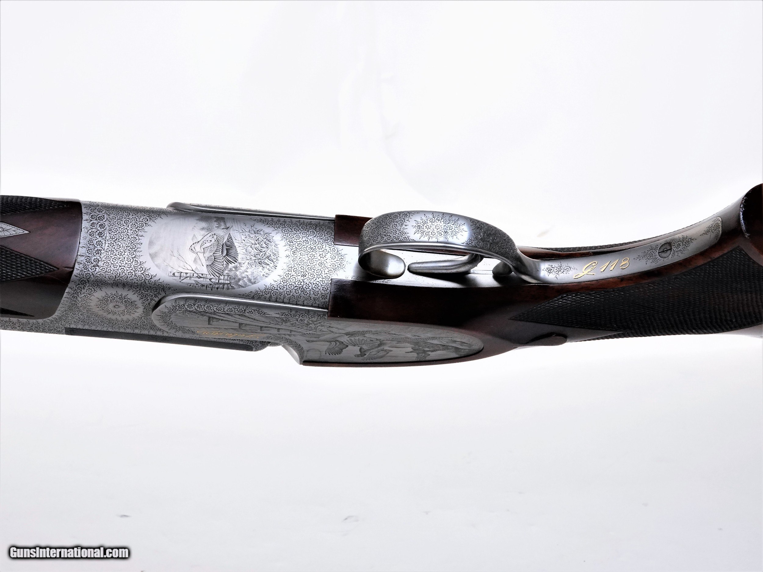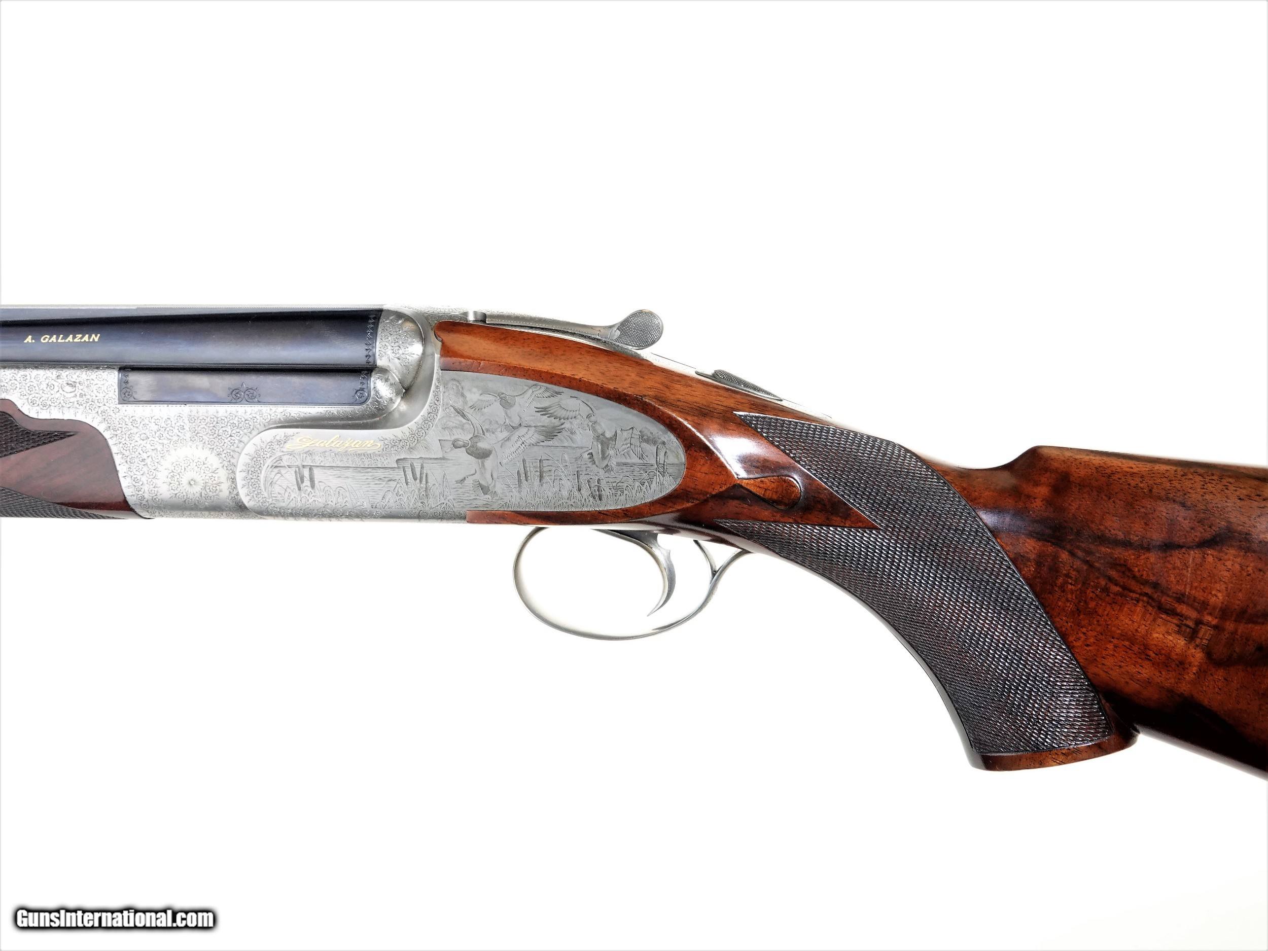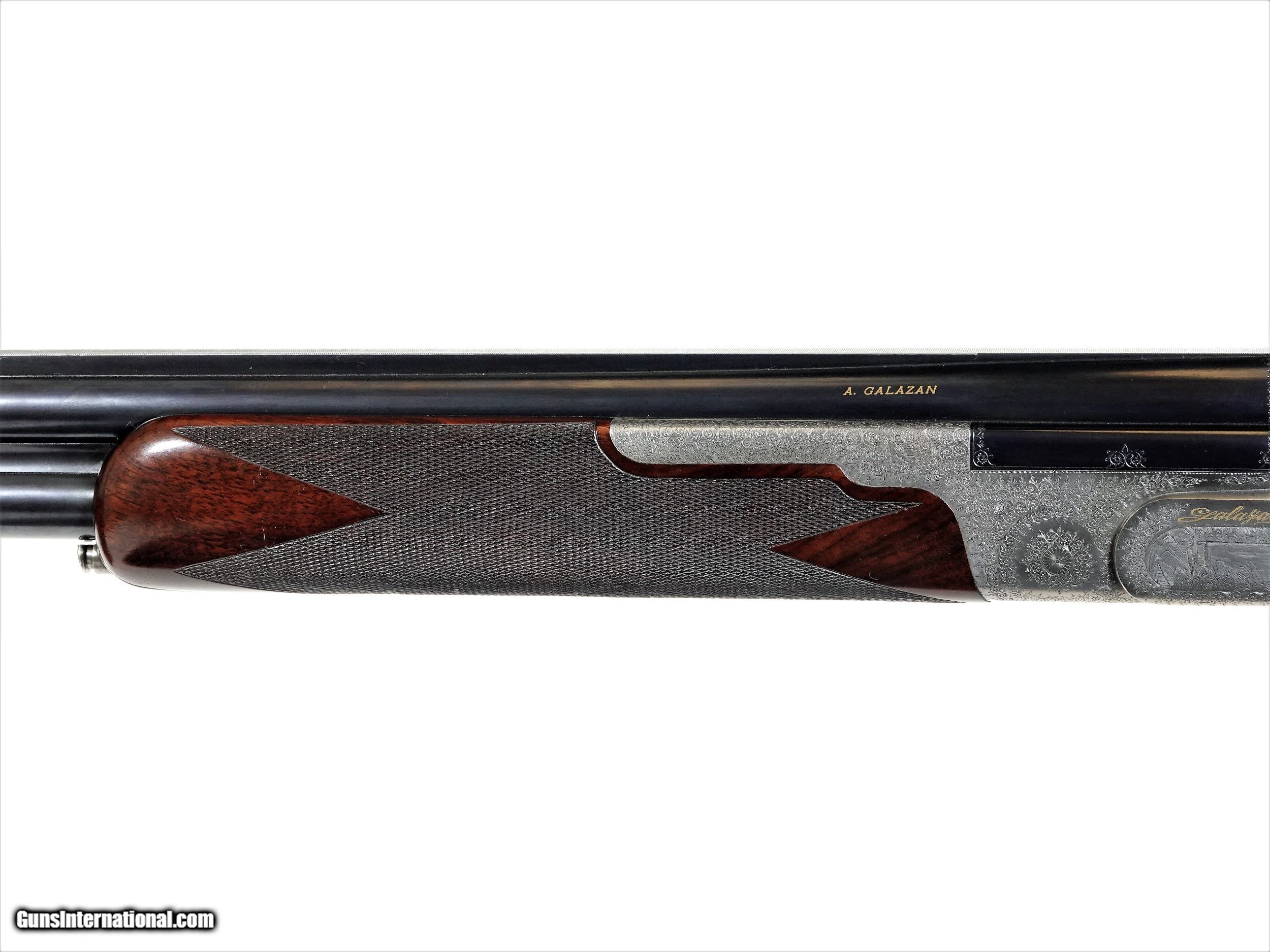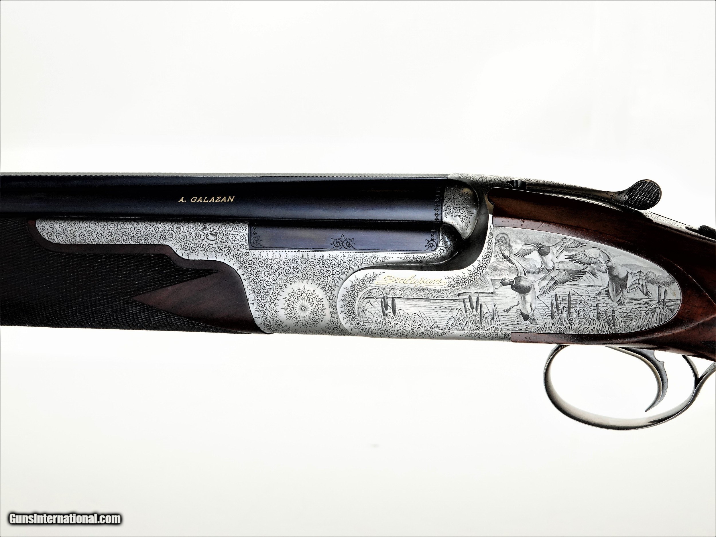 Description: A. Galazan - 12ga. 29” barrels choked Mod/Full, single trigger, pistol grip, leather pad, highly figured Turkish Circassian walnut, Semi-rounded frame, solid rib, London oil finish, pin-less and screw-less sidelock, drop points, incredible bulino engraving featuring highly detailed mallard, pheasant, and woodcock game vignettes engraved by Creative Art, new gun available for immediate delivery. Inv# 42364 14 7/8” x 1 ½” x 2 ¼” 7 lbs. 10 oz. $POR SOLD |
