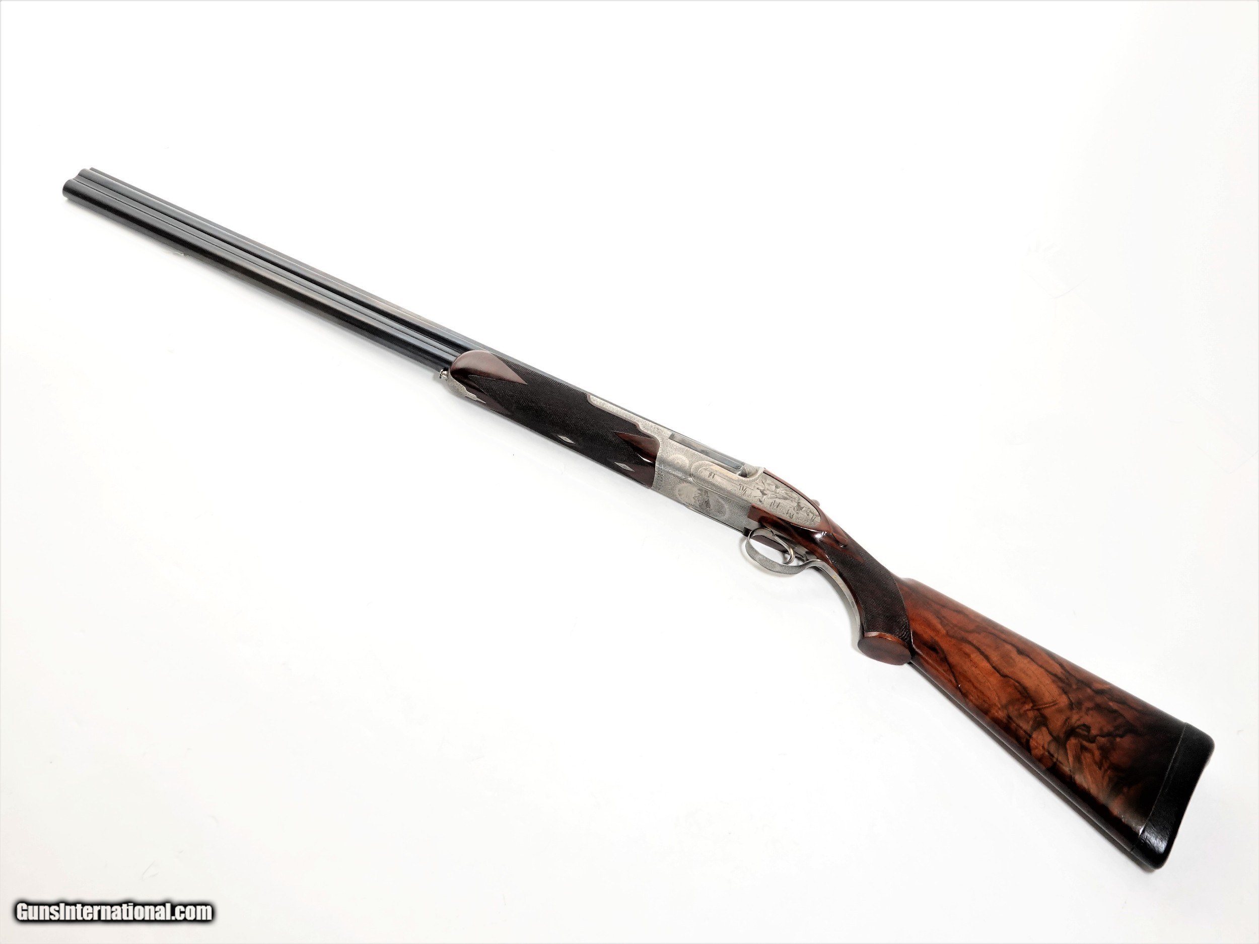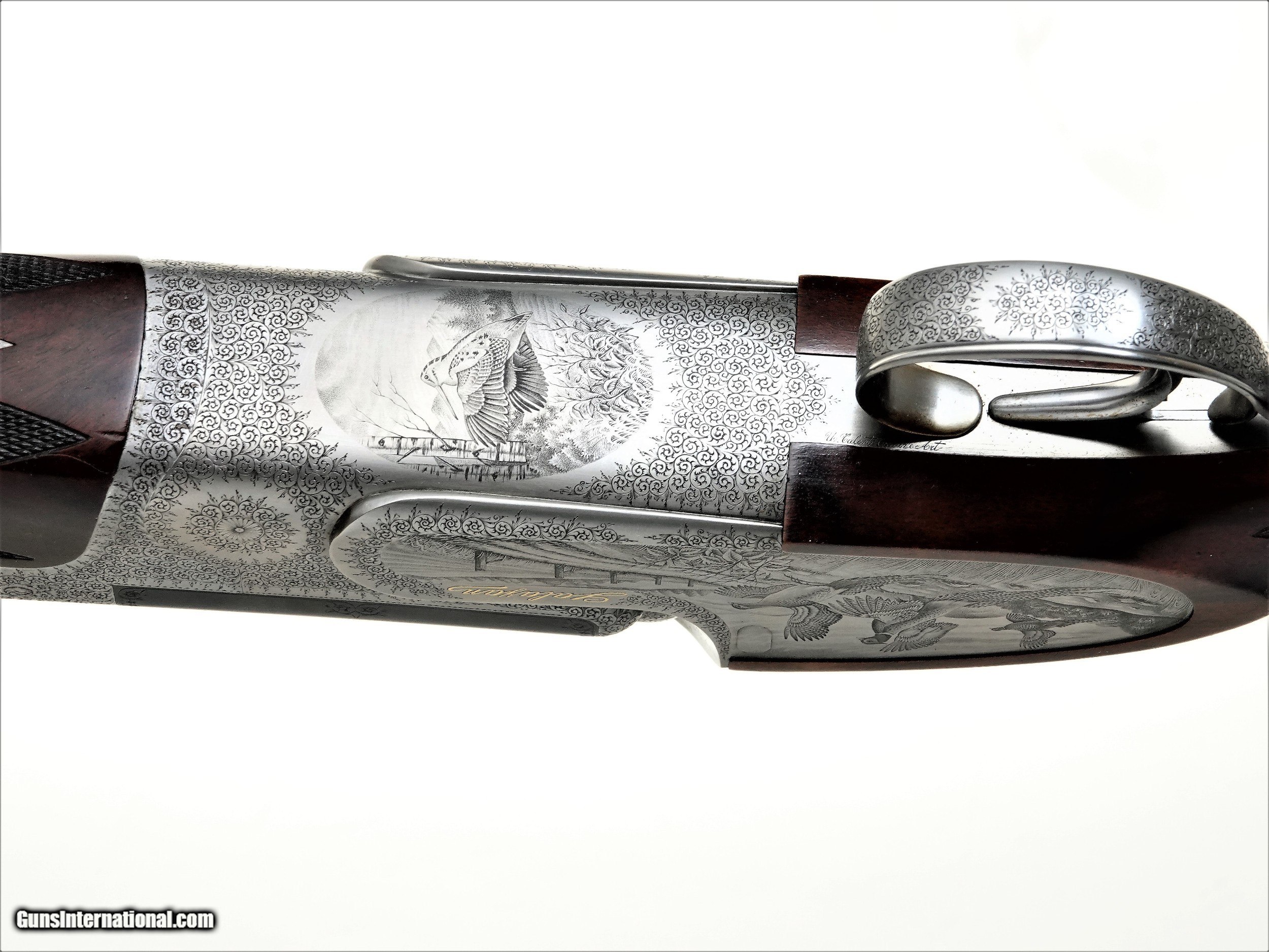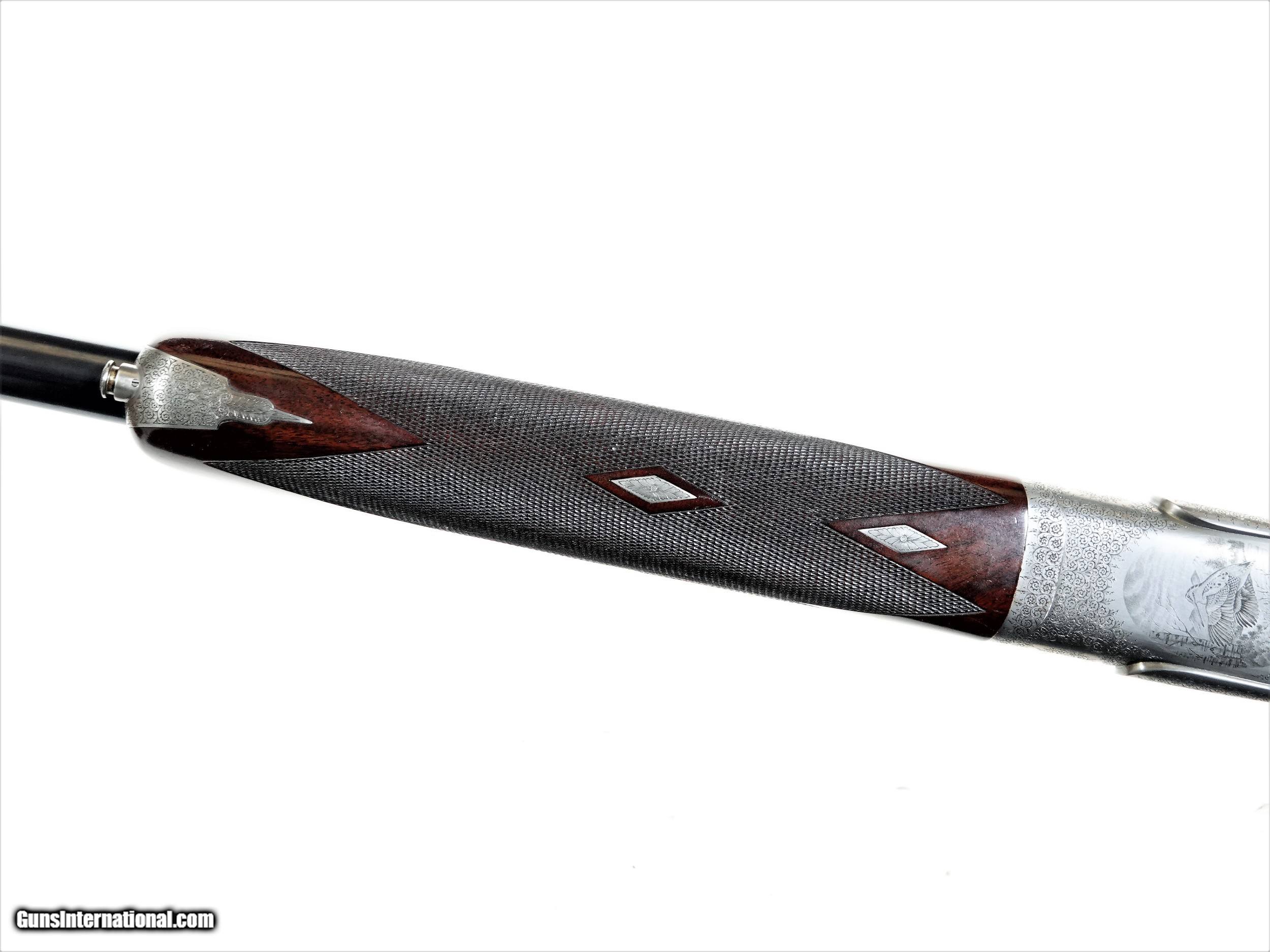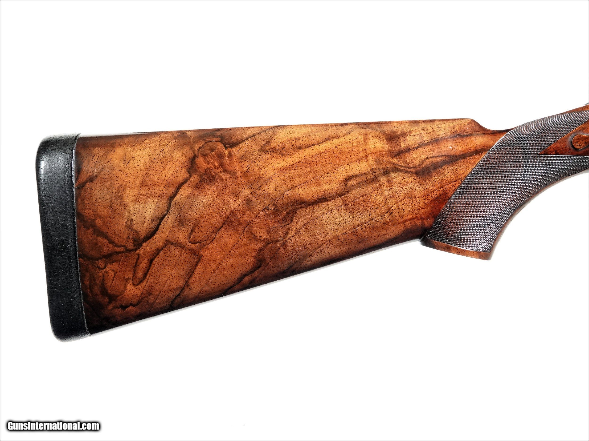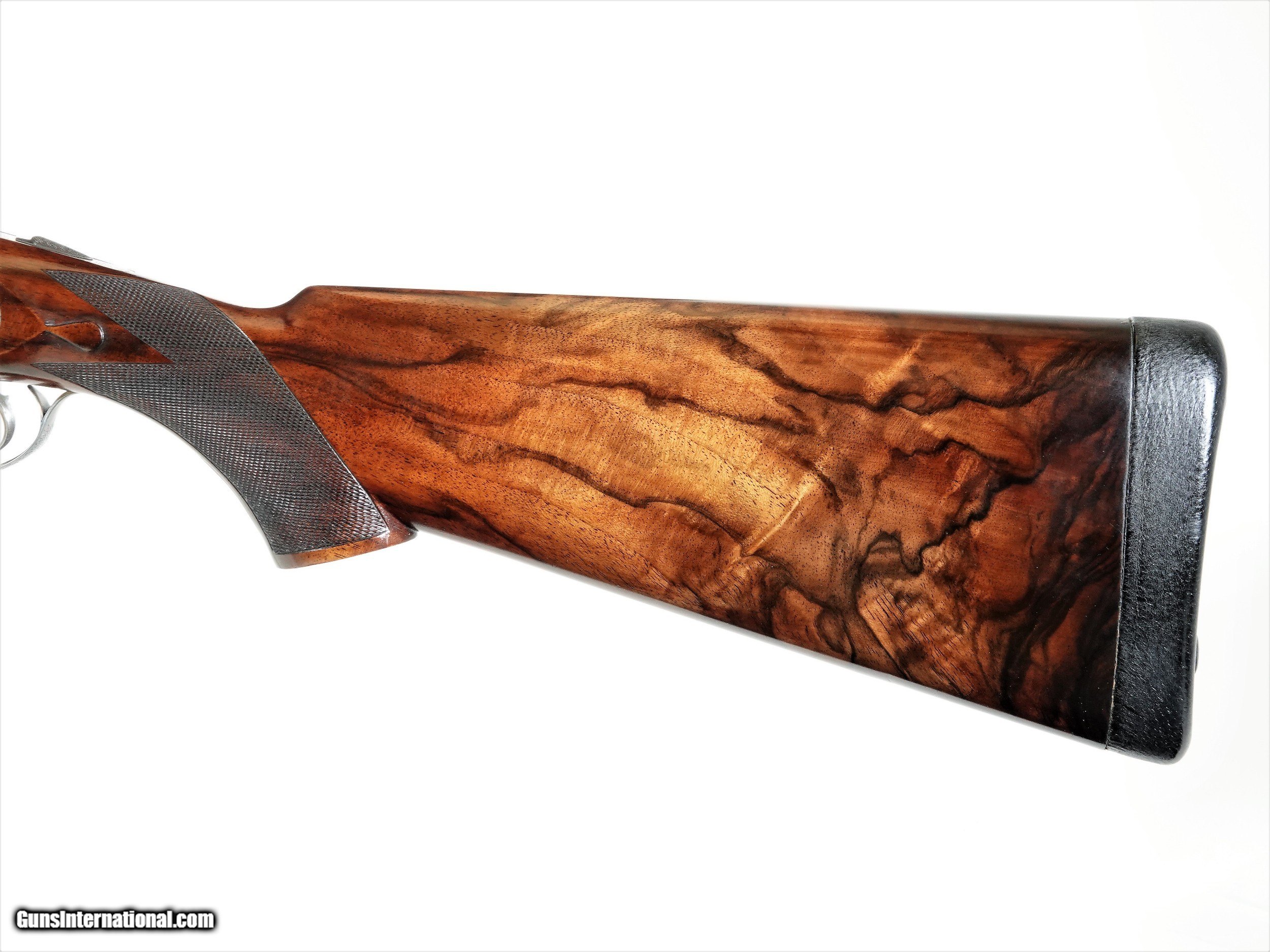 Description: A. Galazan - 12ga. 29” barrels choked Mod/Full, single trigger, pistol grip, leather pad, highly figured Turkish Circassian walnut, Semi-rounded frame, solid rib, London oil finish, pin-less and screw-less sidelock, drop points, incredible bulino engraving featuring highly detailed mallard, pheasant, and woodcock game vignettes engraved by Creative Art, new gun available for immediate delivery. Inv# 42364 14 7/8” x 1 ½” x 2 ¼” 7 lbs. 10 oz. $POR SOLD |