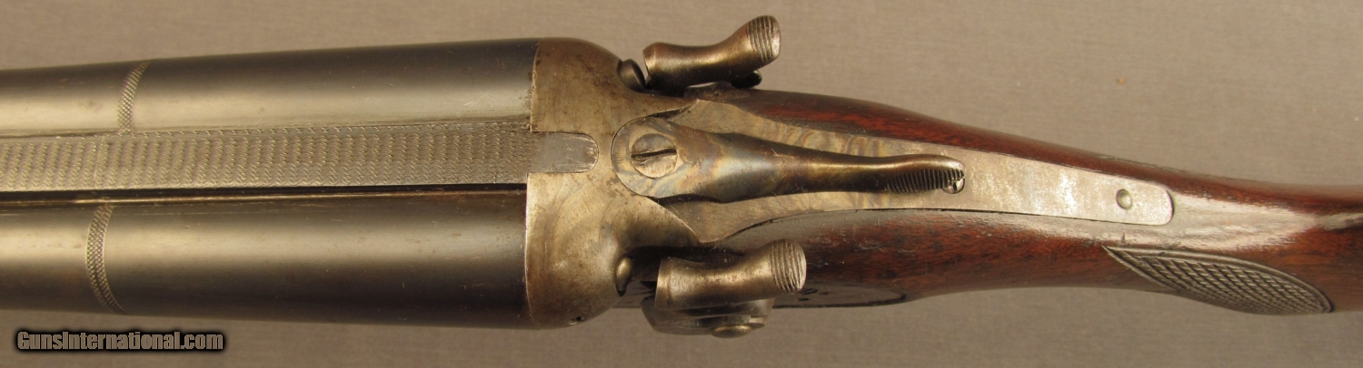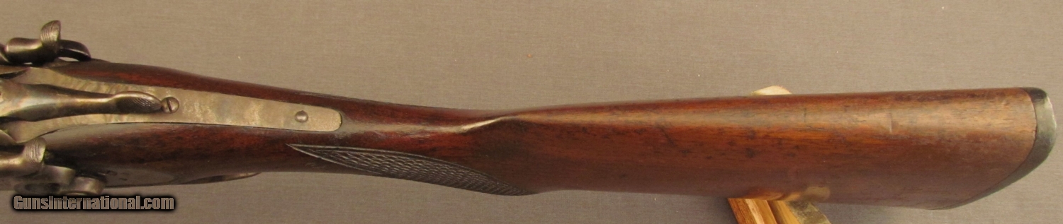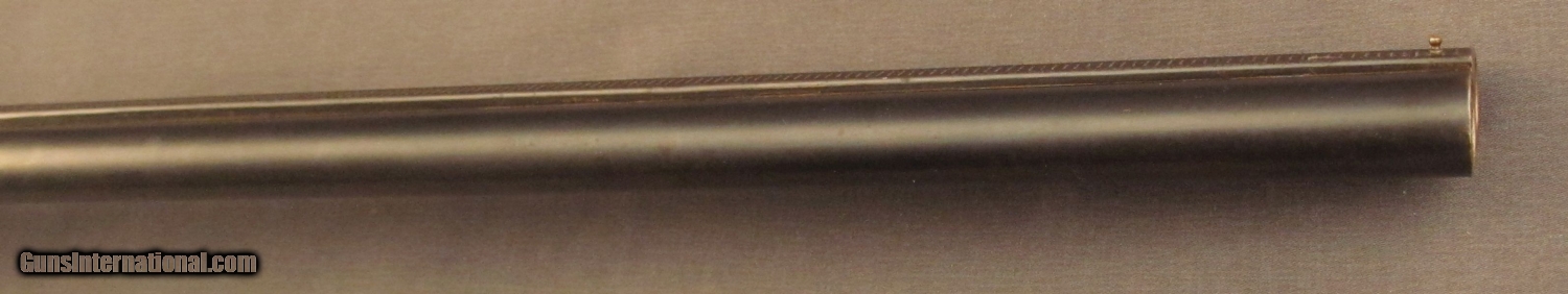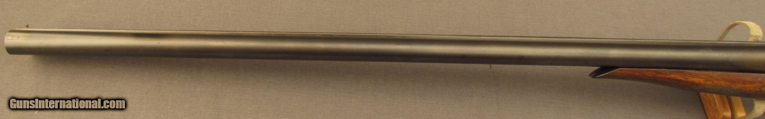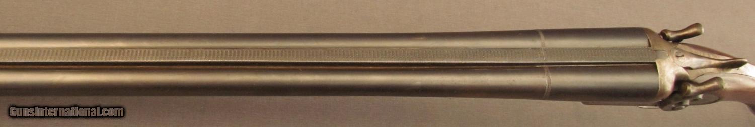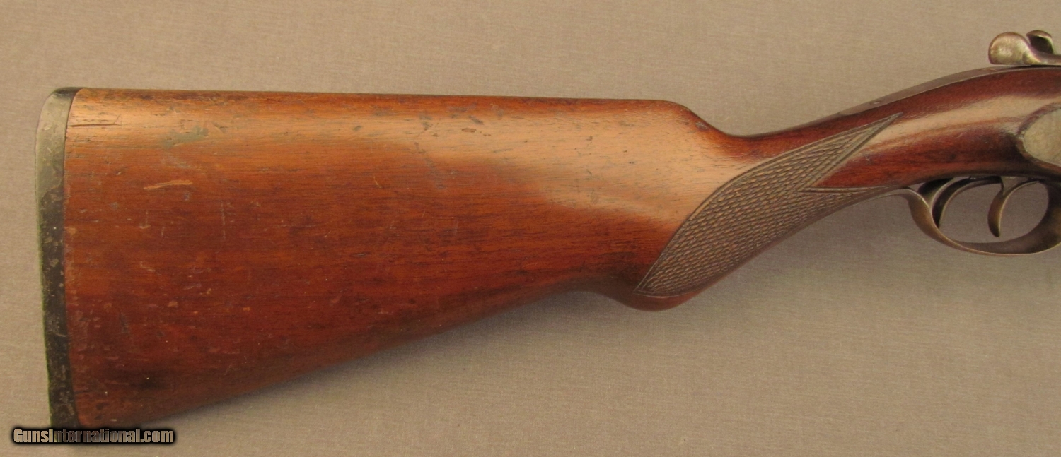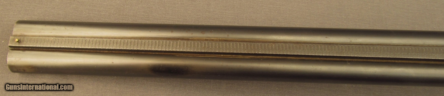 Description: Serial #8121, 12 Ga., 30” barrels with some mild spots of freckling visible along both tubes. This shotgun retains 80-85% of the original blue along the barrel with some dark spots of freckling at the muzzles and in spots along their length. There is some further fading along the bottom of the left barrel at the breech. The frame has a mostly dark gray and pale brown patina, but does have some bright color case-hardening remaining, most noticeably on the rear of the lockplates. The shotgun has a walnut splinter style forend and a rounded, pistol gripped buttstock with black hard rubber buttplate. There is a long chip at the tip of the forend with scattered handling marks and surface blemishes on the balance of the wood. The length of pull measures 14” with drops of 2” and 3 1/8” respectively, and the gun is mechanically sound with the barrels slightly off-face. This is an attractive shotgun and is in good plus condition overall. FFL or C&R SOLD Curio/Relic: Yes Manufacturer: Davis Model: Double Serial Number: 8121 Caliber Info: 12ga Gauge Info: 12ga |