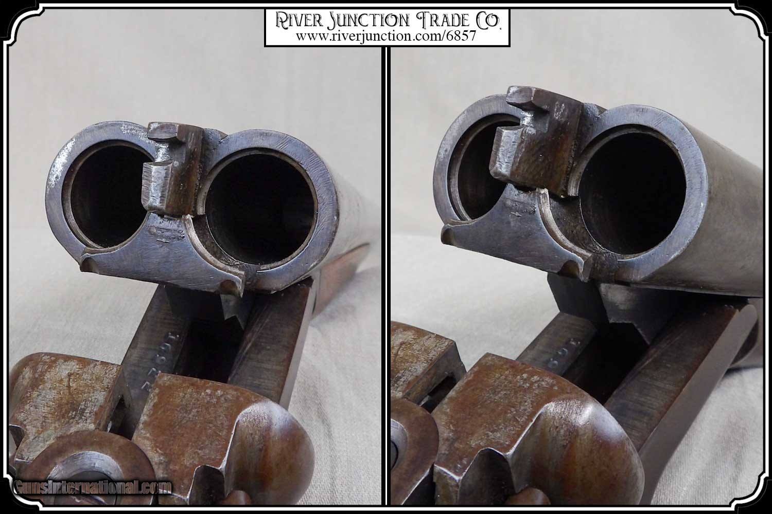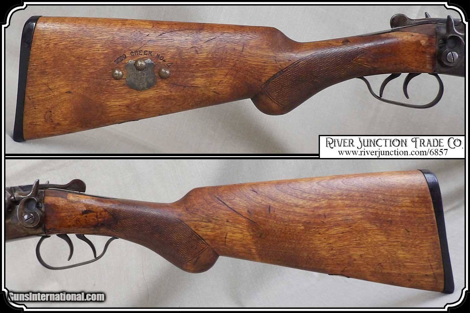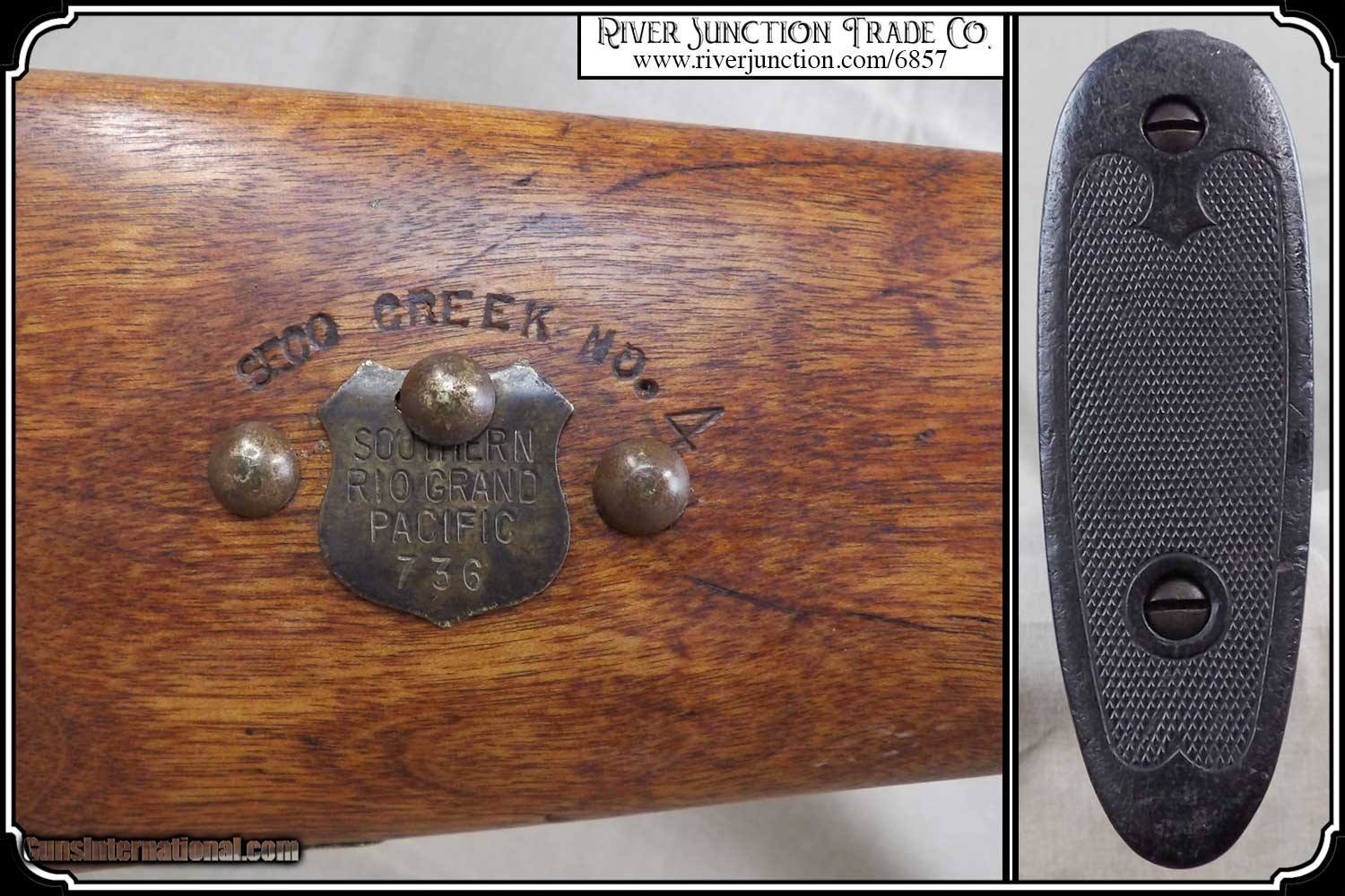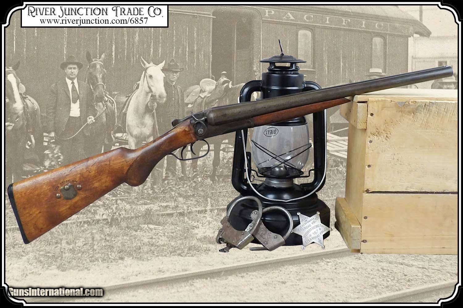 Description: Here is an antique 12ga. shotgun. Shortened guns such as these were used by guards in banks, prisons and any where there was a need to protect valuables and keep the peace. They were use to guard gold bullion on trains in the mid 1870s and other valuables on into the early 19th century in America, They were used by Wells Fargo, Adams Express and American Express who kept them in the express cars on the railroads. Also they were in the baggage and mail cars. This one has a brass “SOUTHERN RIO GRAND & PACIFIC” tag that is attached to the right side of the stock. This gun was a very inexpensive shotgun and is very plain except for the tag and the Name “ SECO CREEK No.4” stamped into the stock just above the brass tag. I have no idea what that means. This is a very rugged old shotgun with 18 inch barrels and is 34 inches overall. The stock has had a couple of chips repaired on either side of the tang. It shows handling ding and I believe the stock has been refinished. It would look right in place on a frontier stagecoach or on board an early steam train express car. I worked for the Illinois Central RR after High School in 1958 and saw the racks for these old shotgun in old mail cars. For its age this gun is very well preserved and would provide a century of service yet. The bore is shiny bright within STEEL BARRELS and it locks up tight. . Other items shown are not included. Payment: This antique can be shipped DIRECTLY to you. You can order online. WE DO NOT CHARGE ANY CREDIT CARD FEE. Order with a credit card or pay-pal on our site. Just click on the blue link above “Visit Our ” and paste the four digit numerals into the search box. Before you checkout you will see shipping cost and total. OR If you prefer: Pay by cash, postal money order, cashiers check, personal & business checks. We wait for checks to clear. We always answer questions and entertain offers. Have questions? Call me 563-880-4588. Jim SOLD |