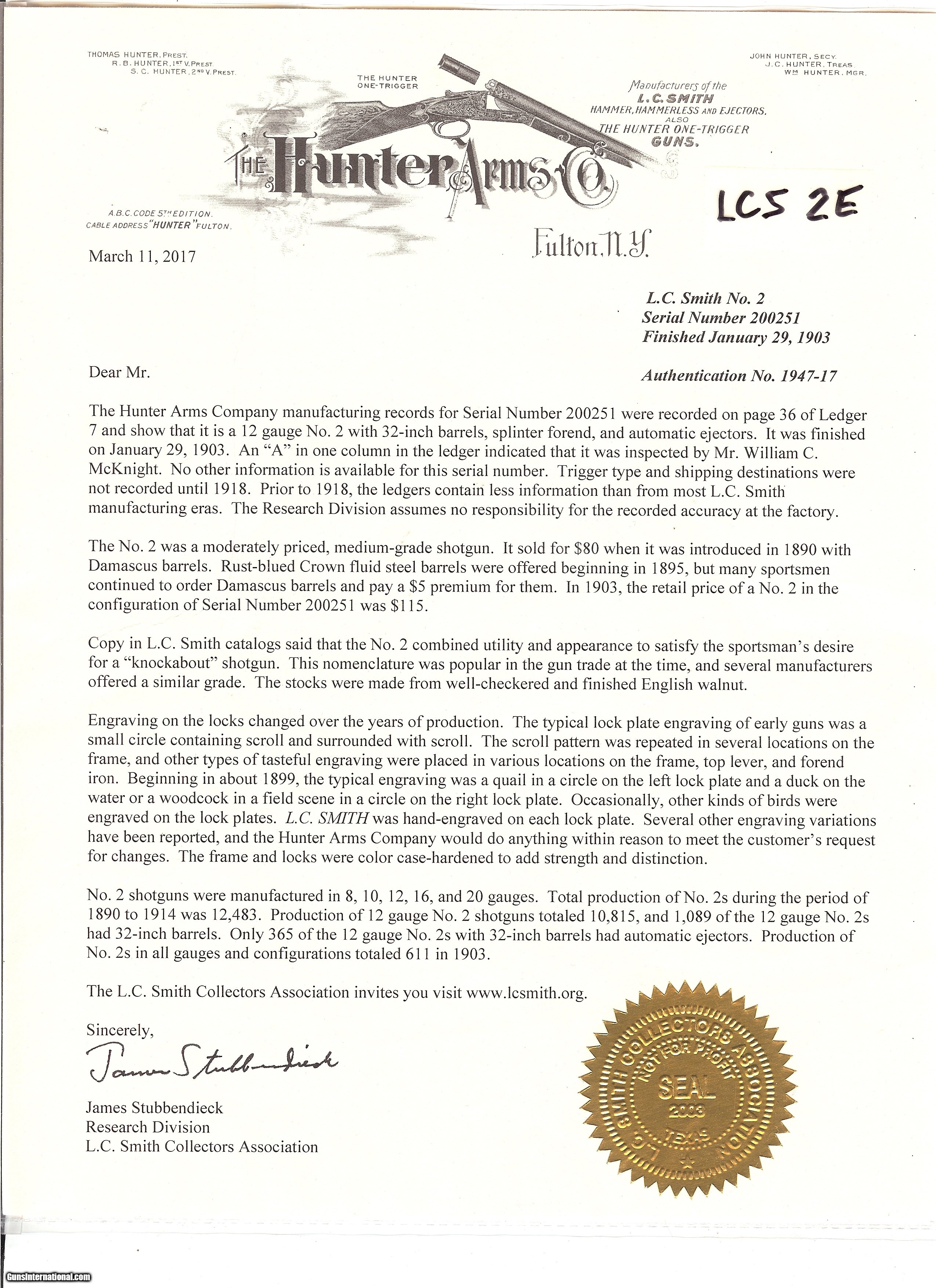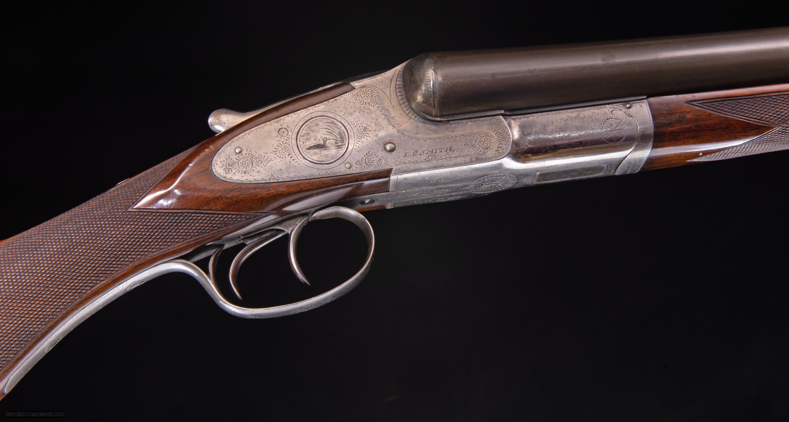 Description: Hammerless Sidelocks - The factory letter indicates this vintage Smith was finished January 29 1903. I was really interested to see the cost of this gun then, over $115! In 1903 this was a very large amount of money. Adjusting for inflation this would be over $3500 dollars today. A properly dressed gentleman in 1903 would have spent between $7 and $16 on his suit, $1 on each of his dress shirts, around $7 on his topcoat and 48 cents for a fine felt hat.