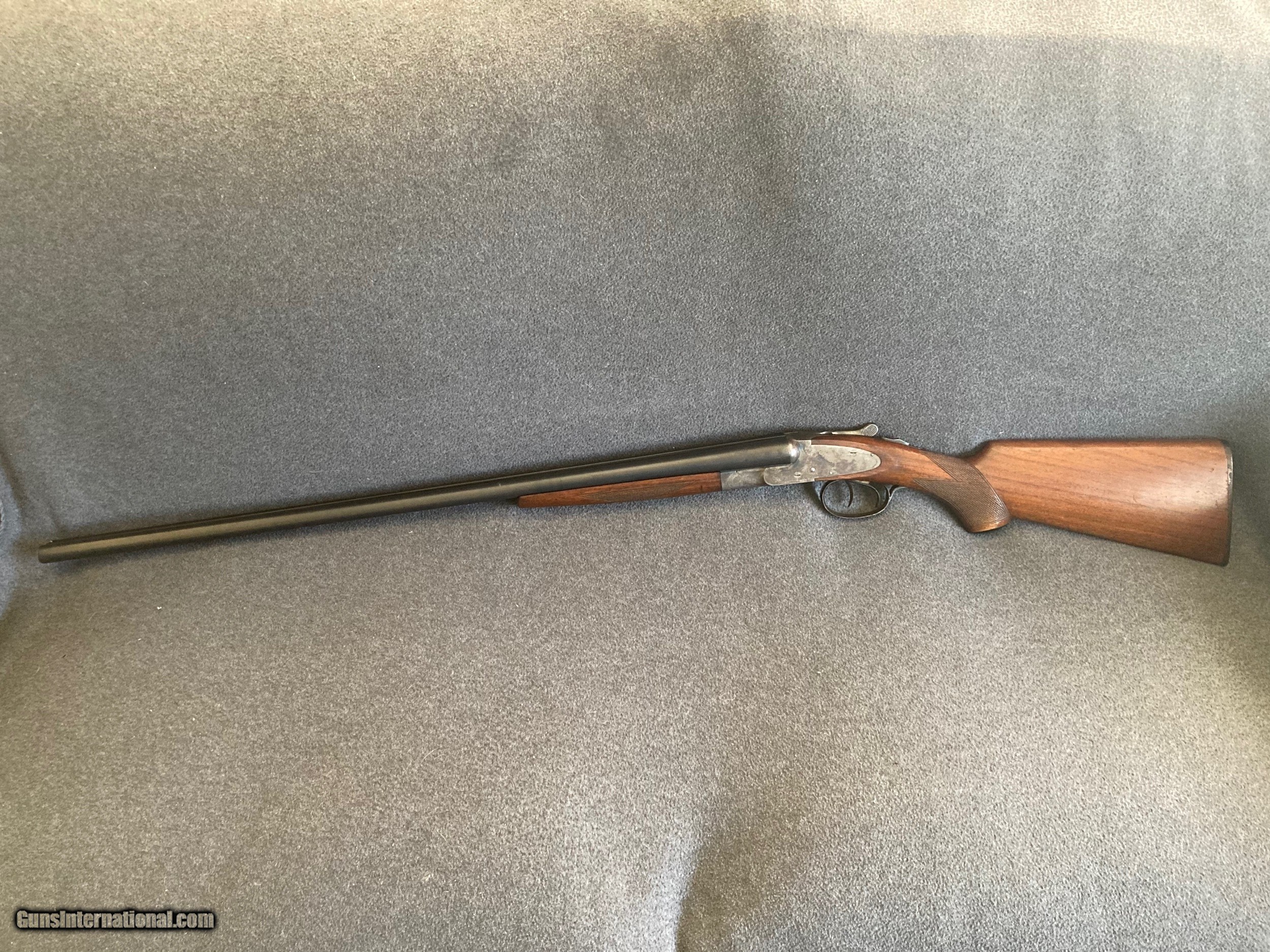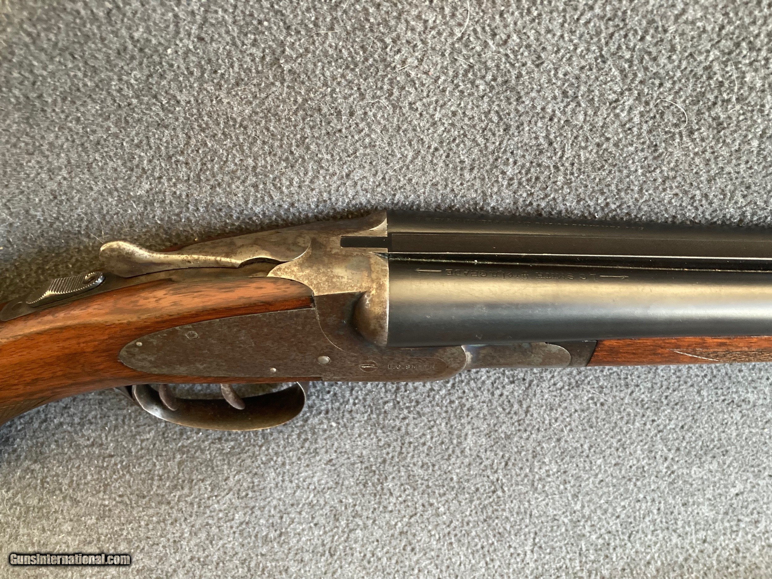 Description: LC Smith Field Grade 20ga, Hunter Arms mfg., pre-war, double triggers, extractors, 28" modify and full, 2 3/4" chambers, all original, excellent bores, excellent wood, perfect all around the sideplates, original buttplate and bead sight, 92% blue, slight wear on the trigger guard in the grip area, 15% visible case color mostly in the protected areas. SOLD |