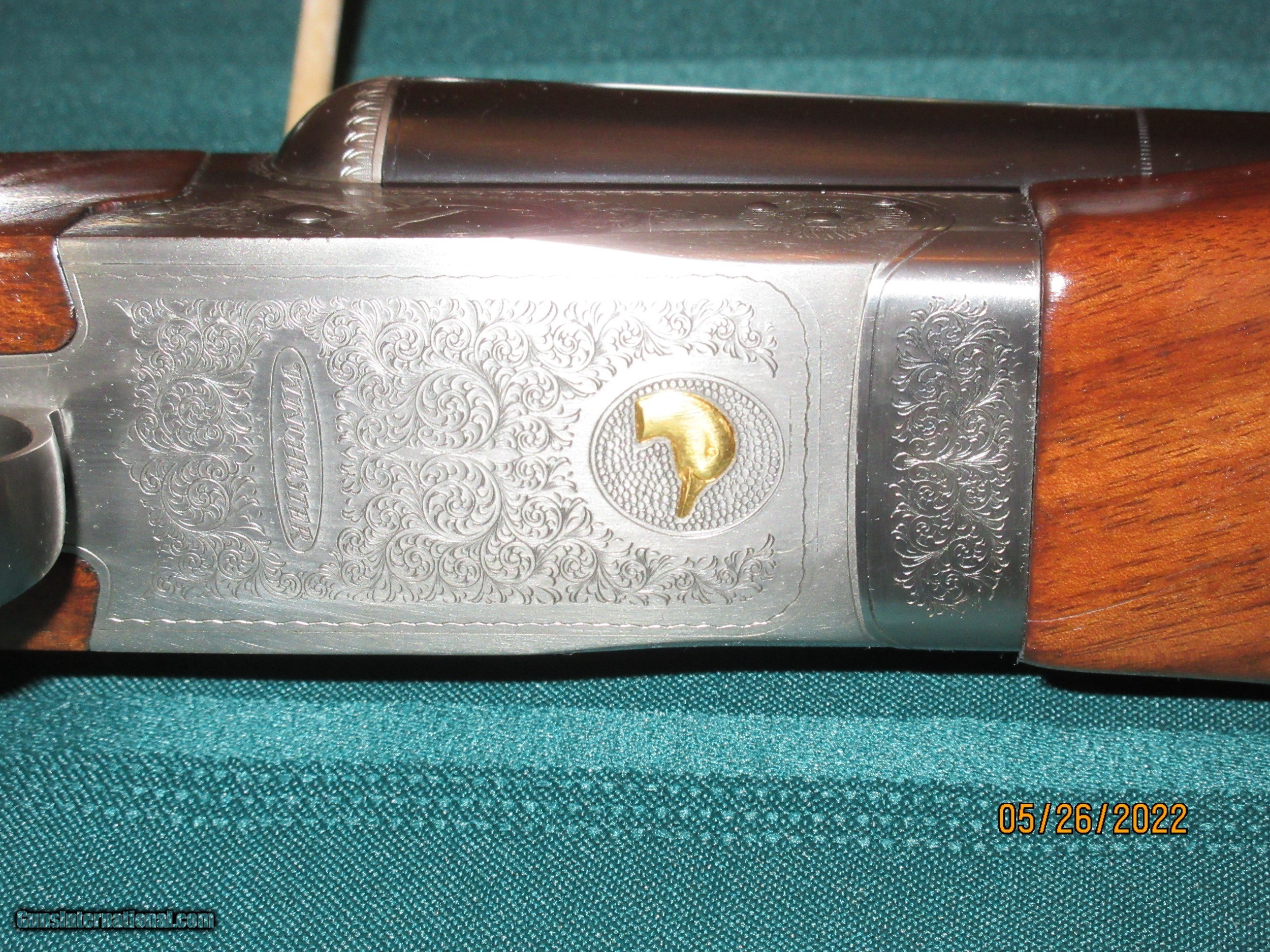 Description: Manufactured in 1983 as a special run for Ducks Unlimited, this 12 and 20 gauge pair of shotguns features 28" mono-blocked barrels with low profile matted ventilated game ribs. There were only 100 pairs of these guns made for the top 100 DU Chapters. These guns have blued single selective triggers, automatic safeties and automatic ejectors. The ribs have two beads, and are marked "Ducks Unlimited" in an oval near breech end. The French Grayed receivers are engraved with duck and scroll on left side and goose and scroll on right side. The bottom is scroll engraved with a DU Duck Head inlayed in gold and marked "Winchester." The trigger guards are scroll engraved at the bow, line engraved at the tang. Highly figured American Walnut buttstocks are two point checkered and have a ball grip and terminates in a red "Winchester" brand recoil pad. Semi-beavertail forearm is checkered on sides with lightly scroll engraved latch. Both guns are new and unfired and each comes with its own original custom carry case. This is not a matched pair and have different serial numbers. the 12 gauge serial number is 81/DU. The 20 gauge sewrial number 83/DU. Must Ship to an FFL dealer. Cashier’s check, US Postal Money Order accepted as payment. $10,000 plus $200 shipping, firm. SOLD Shotgun Gauge: 20 Gauge Manufacturer: Winchester Model: 23 Serial Number: 81DU Barrel Length: 28 Chambers: 3-inch Ejectors: yes Condition: NEW IN BOX Metal Condition: 100% Wood Condition: 100% Bore Condition: 100% Barrel Type: Hunting Rib Action: SXS Triggers: Single Selective |