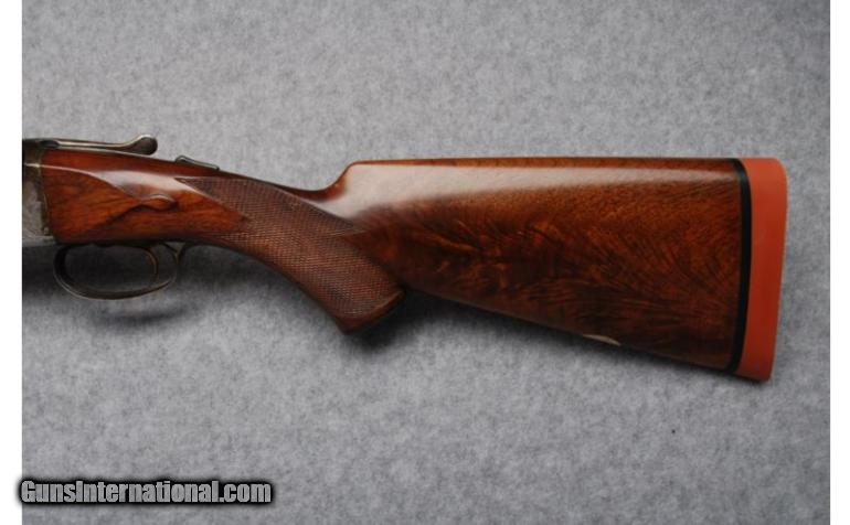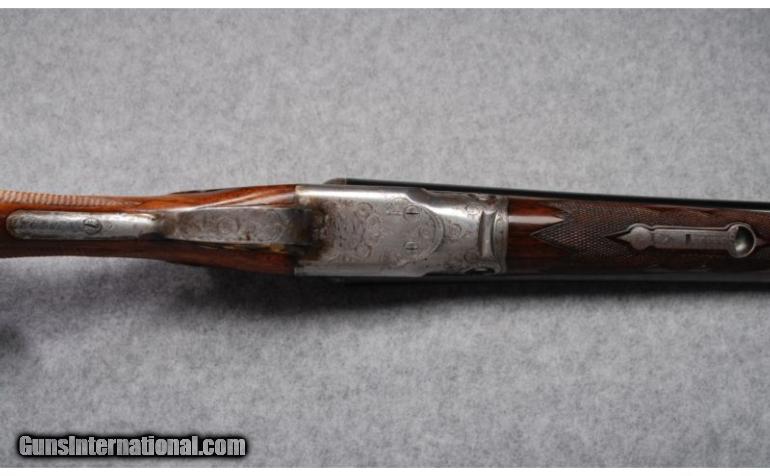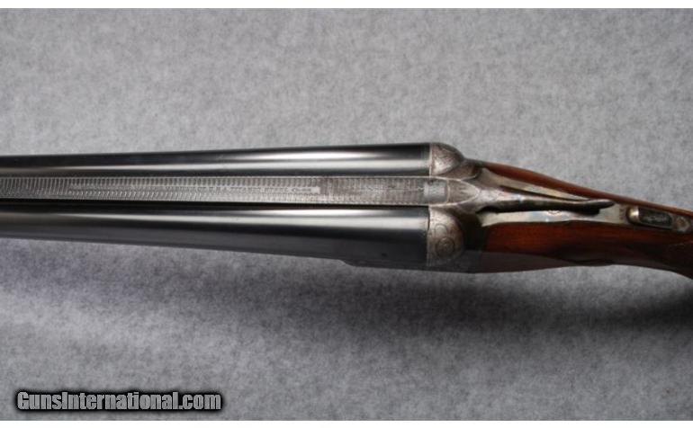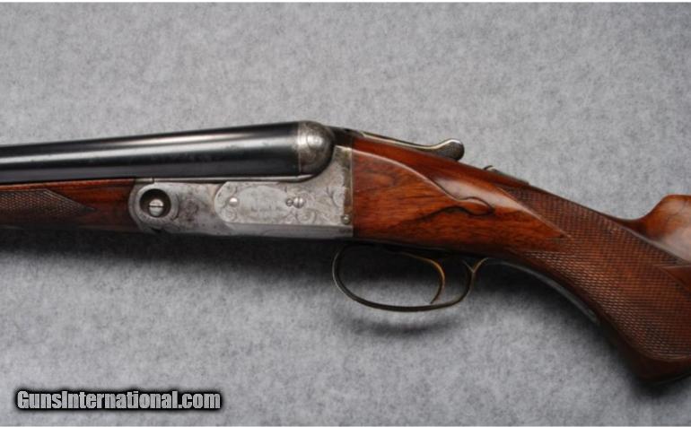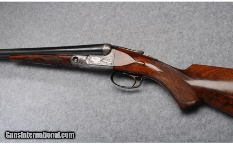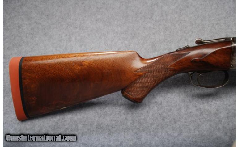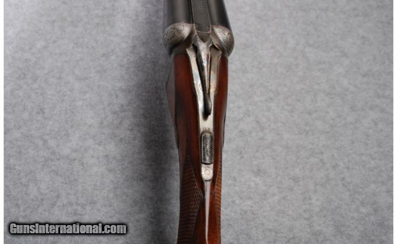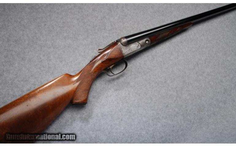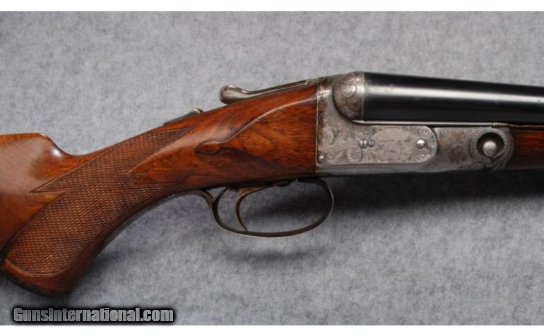 Description: This Parker DHE double gun is built on a 1-1/2 frame, is equipped with a single selective trigger, ejectors and the receiver is engraved with scenes of hunting dogs and game birds. The wood has been refinished and a new 1" rubber recoil pad has replaced the original skeleton buttplate. Several of the action screws show evidence of turning, most case coloring is worn off of the receiver and there are scattered areas of light pitting and oxidation on the barrels testifying to the fact that this gun was a favorite hunting companion of a previous owner. SOLD Curio/Relic: Yes Manufacturer: 1923 Caliber Info: 12 Gauge Chambers: 2-1/2" - Ejectors Metal Condition: Barrels have numerous light scratches, patches of light to moderate oxidation and light pitting as would be expected on a field gun of this vintage. There is some overrun of varnish on the periphery of the receiver from wood refinishing and most of the o Wood Condition: Stock and forend have been refinished. Stock has a semicircular chip at the rear of the tang combined with a crack extending approximately 1/2" from the tang into the stock Bore Condition: Bright bores Barrels: 26" Titanic Steel Triggers: Single selective trigger Stock: Cut-checkered, pistol-grip walnut with Parker logo grip cap Stock Dimensions: LOP: 13-1/2 (over pad), DAC: 1-1/2", DAH: 2-5/8 Fore End: Splinter-style checkered walnut Butt Pad: Replacement 1" rubber recoil pad (original skeleton buttplate missing) Weight: 7-1/2 lbs. Sights: Single white bead Chokes: Fixed chokes - Improved Cylinder & Modified Extras: None. Item Location: Wheeling, WV |
