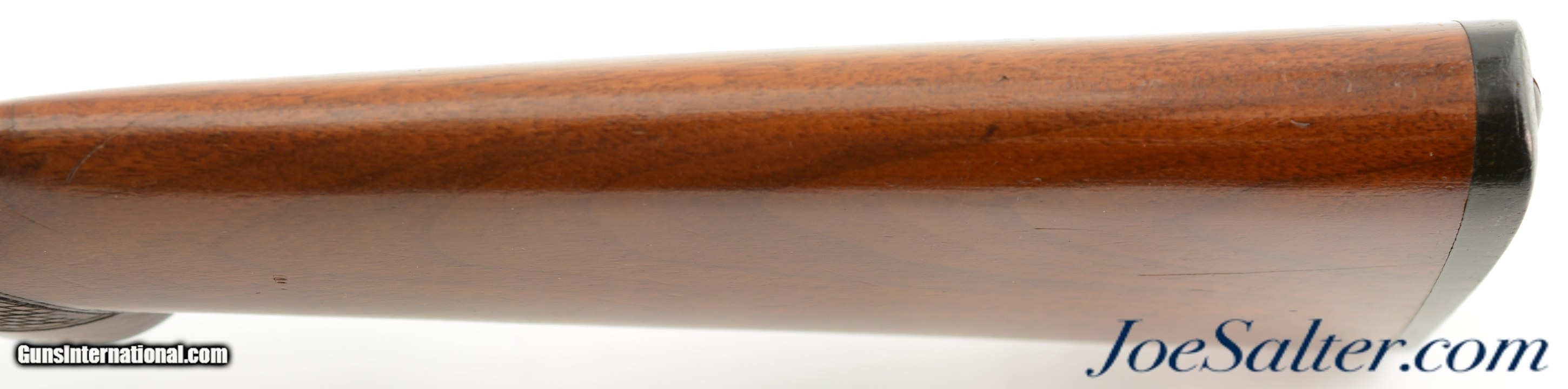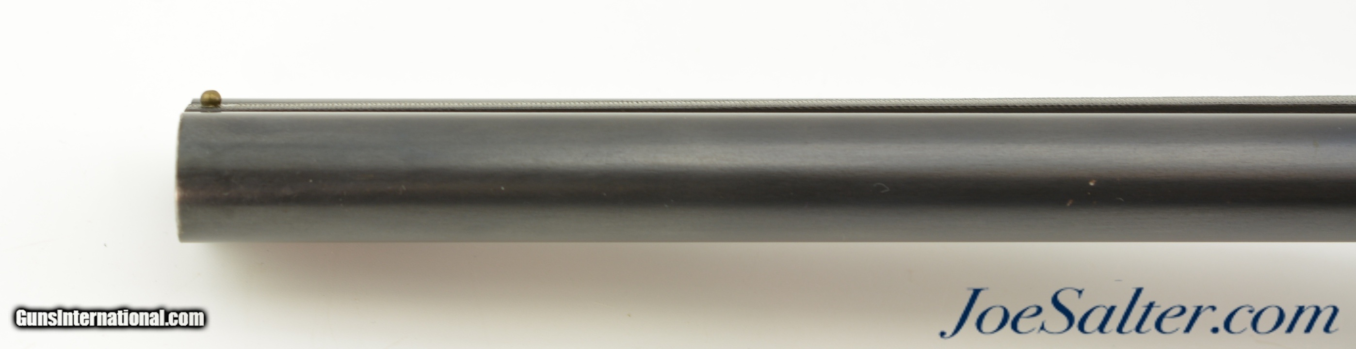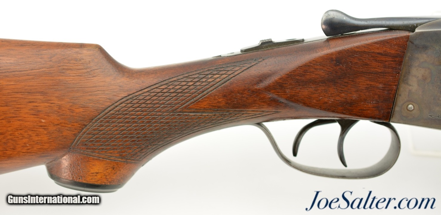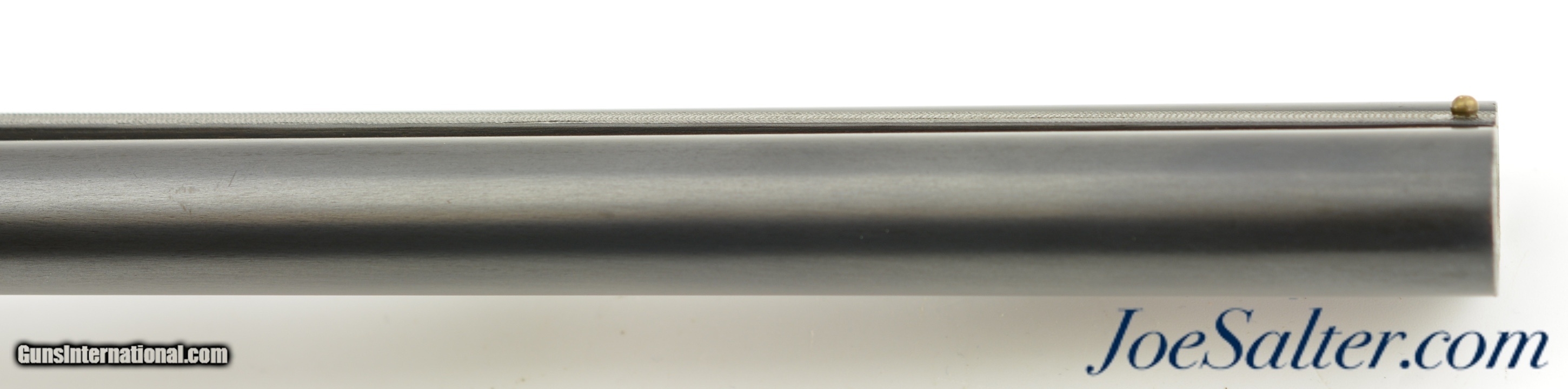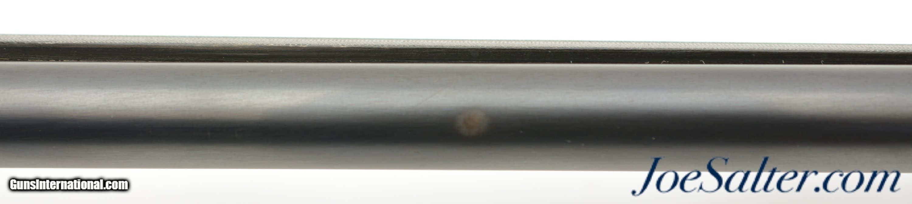 Description: Serial #310444, 12 Gauge (2 ¾" chambers), 28 inch barrels with bright, excellent bores choked modified and full. This is the Field Grade Ithaca Flues model side-by-side shotgun manufactured in 1918 that was factory upgraded with selective ejectors & a rare feature on field grade guns and is confirmed by the factory which lists ejectors and fluid steel barrels at the time of factory shipment. In excellent condition the barrels show about 97-98% original blue and the frame has perhaps 75-80% of the original vibrant case-hardened colors with the balance fading to a smoky gray. The forearm is excellent nice checkering and the push button release with the stock now solid showing expert repairs to either side of the top wrist nearest the lever which are visible under strong light and a bruise on the lower left. It has the original Ithaca hard rubber butt plate. The action functions properly with tight lock up, barrels on face with lever resting just right of center. The selective ejectors function properly. The LOP is 14 inches with drops of 1.75 and 3 inches at the comb and heel. A rare selective ejector Field Grade Ithaca in exceptionally high condition. FFL or C&R Curio/Relic: Yes Price: $1,350.00 Contact Seller |