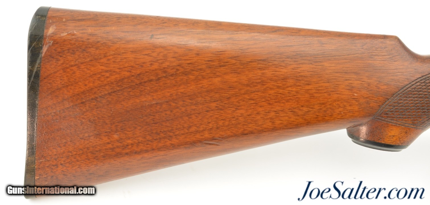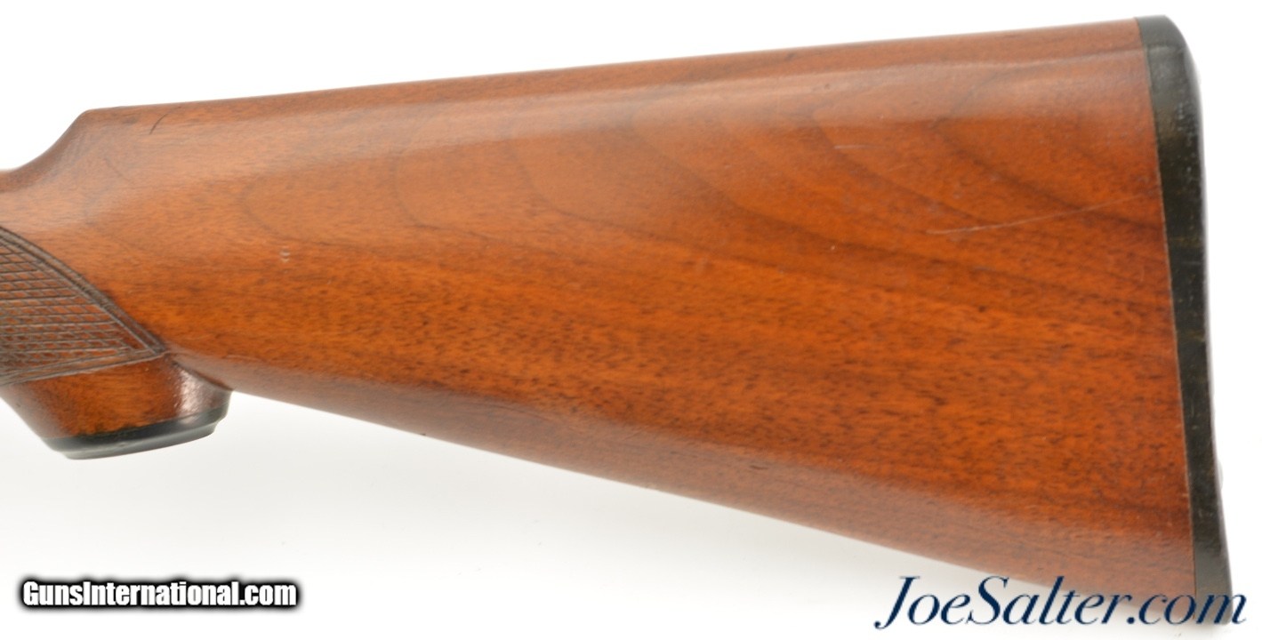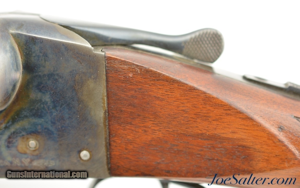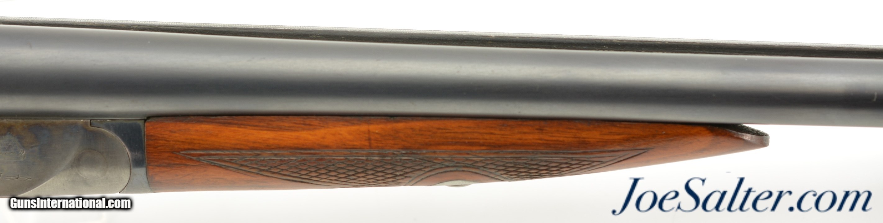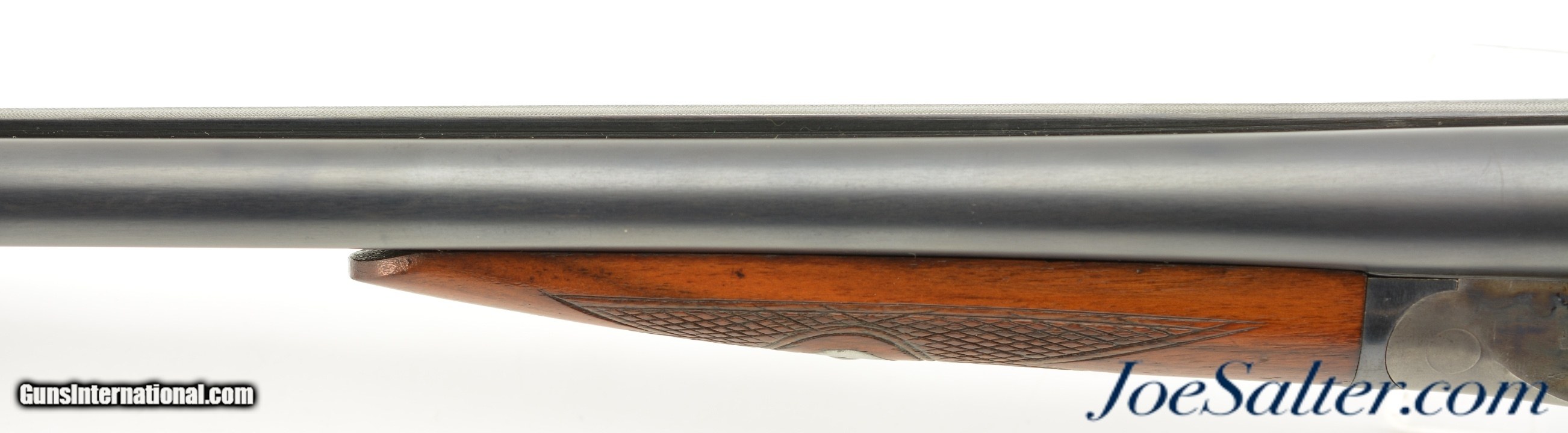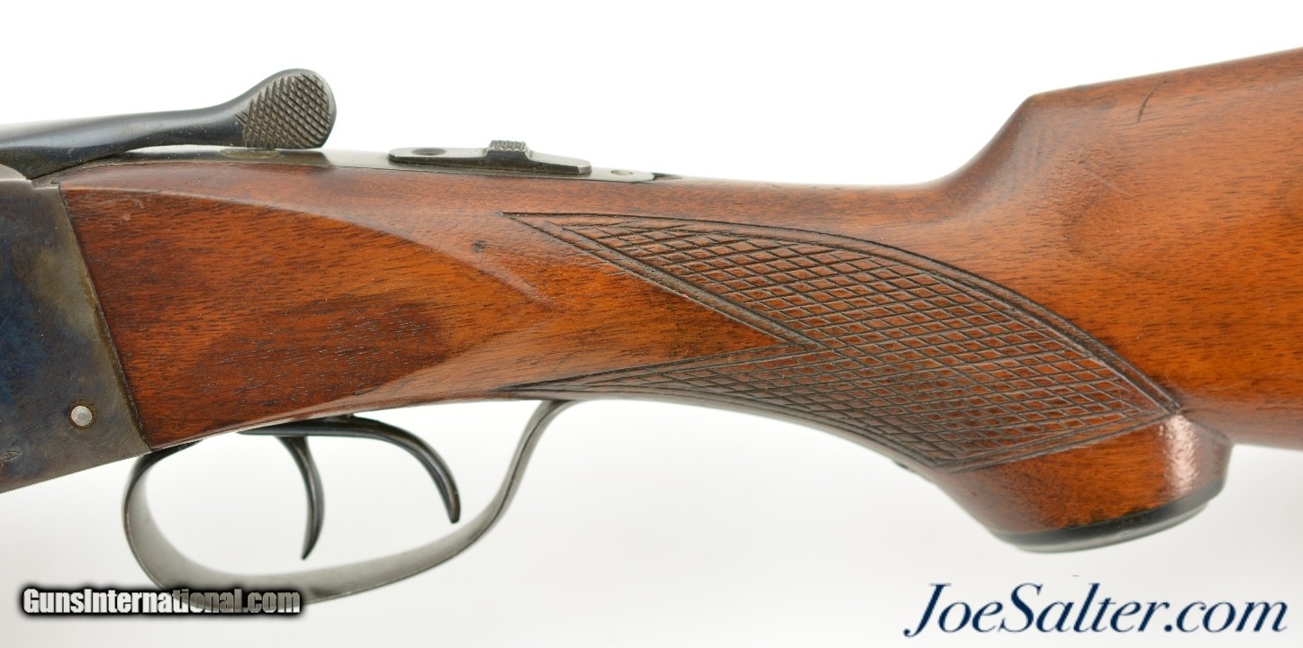 Description: Serial #310444, 12 Gauge (2 ¾" chambers), 28 inch barrels with bright, excellent bores choked modified and full. This is the Field Grade Ithaca Flues model side-by-side shotgun manufactured in 1918 that was factory upgraded with selective ejectors & a rare feature on field grade guns and is confirmed by the factory which lists ejectors and fluid steel barrels at the time of factory shipment. In excellent condition the barrels show about 97-98% original blue and the frame has perhaps 75-80% of the original vibrant case-hardened colors with the balance fading to a smoky gray. The forearm is excellent nice checkering and the push button release with the stock now solid showing expert repairs to either side of the top wrist nearest the lever which are visible under strong light and a bruise on the lower left. It has the original Ithaca hard rubber butt plate. The action functions properly with tight lock up, barrels on face with lever resting just right of center. The selective ejectors function properly. The LOP is 14 inches with drops of 1.75 and 3 inches at the comb and heel. A rare selective ejector Field Grade Ithaca in exceptionally high condition. FFL or C&R Curio/Relic: Yes Price: $1,350.00 Contact Seller |