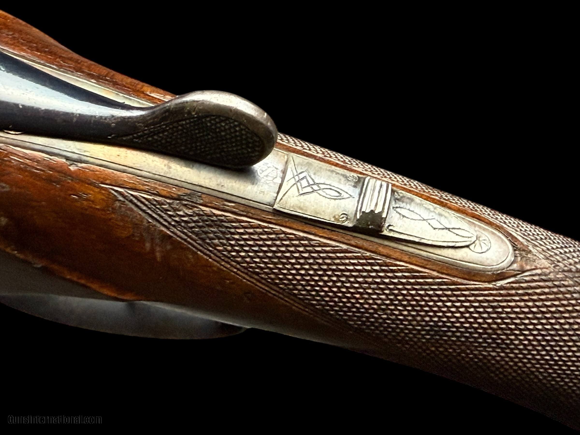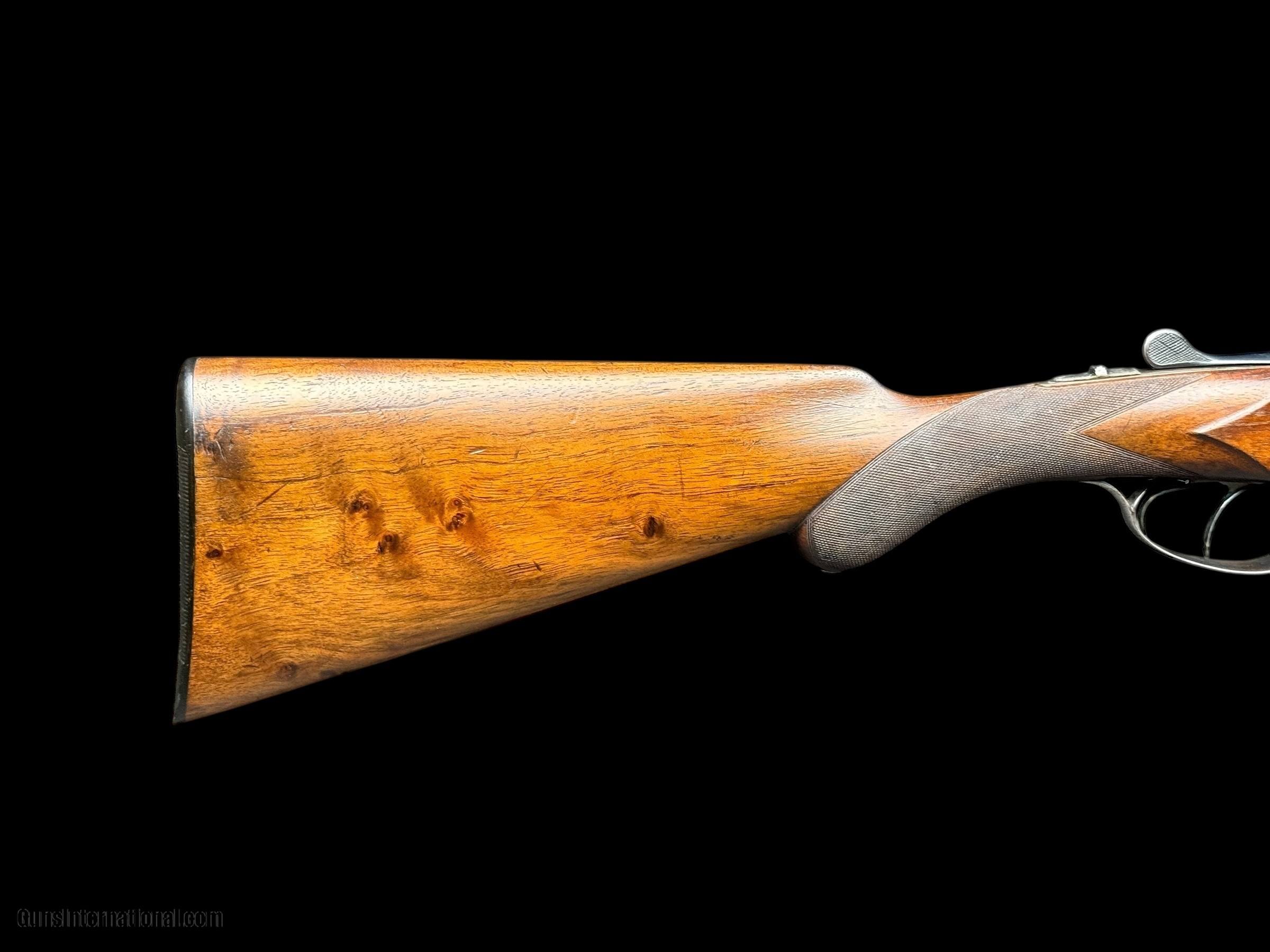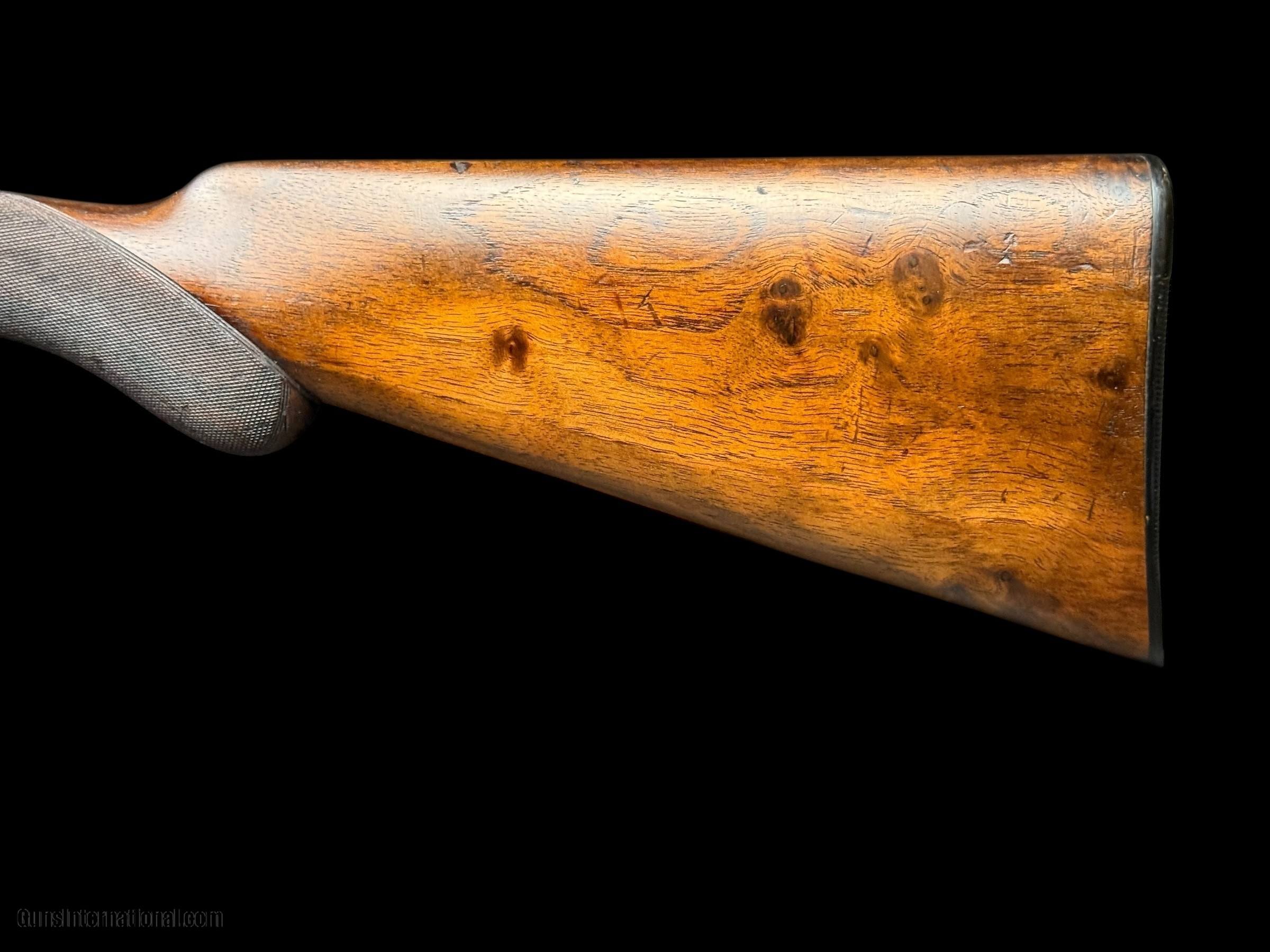 Description: WILLIAM READ & SONS - BOSTON SXS GAME GUN - CASE-COLOURED AND SCROLL ENGRAVED BOXLOCK ACTION WITH THIRD FASTENER & SIDECLIPS - 20GA - 2 1/2" CHAMBERS - BELGIUM NITRO PROOFS - 27 1/2" BARRELS - CHOKES: .007 / .027 DOUBLE TRIGGERS - EXTRACTORS - AUTO SAFETY - WALNUT SEMI-PISTOL GRIP STOCK W/ HORN BUTTPLATE - DIMS: LOP: 14 1/8" | DAC: 1 5/8" | DAH: 3" WEIGHT: 5LBS 11OZ CONDITION: GUN IS IN GOOD OVERALL ORIGINAL CONDITION AS-FOUND. NICE CASE COLOR REMAINS AS PICTURED. ACTION TIGHT AND ON-FACE. BORES CLEAR. TRIGGERS CRISP. BLUING VERY GOOD OVERALL. WOOD OIL FINISH AGED AND VARIOUS LIGHT IMPRESSIONS AS PICTURED. GENTLEMEN, THIS IS A WELL-BUILT BELGIUM SXS GAME GUN MADE FOR WILLIAM REED & SONS OF BOSTON. PERFECT LITTLE QUAIL, GROUSE, OR WOODCOCK GUN WITH AN AMERICAN STORE HERITAGE. A LITTLE HISTORY ON WILLIAM READ & SONS: Curio/Relic: Yes Shotgun Gauge: 20 Gauge Model: SXS GAME GUN Serial Number: 1426 Barrel Length: 27.5 Chambers: 2 1/2" OR 65MM Ejectors: NO Condition: GOOD Metal Condition: GOOD Wood Condition: GOOD Bore Condition: GOOD Action: BOXLOCK Triggers: DOUBLE Price: $1,850.00 Contact Seller |