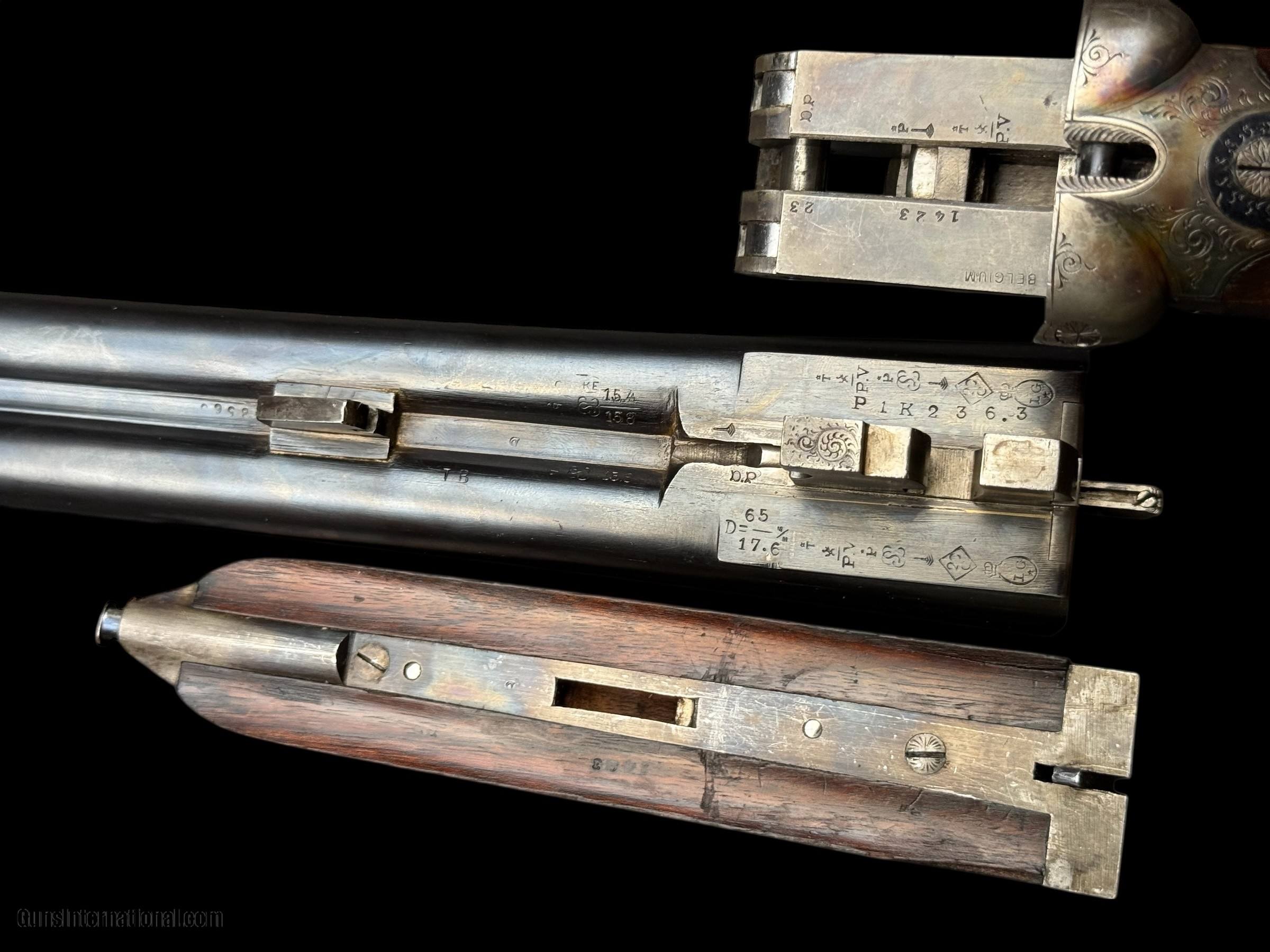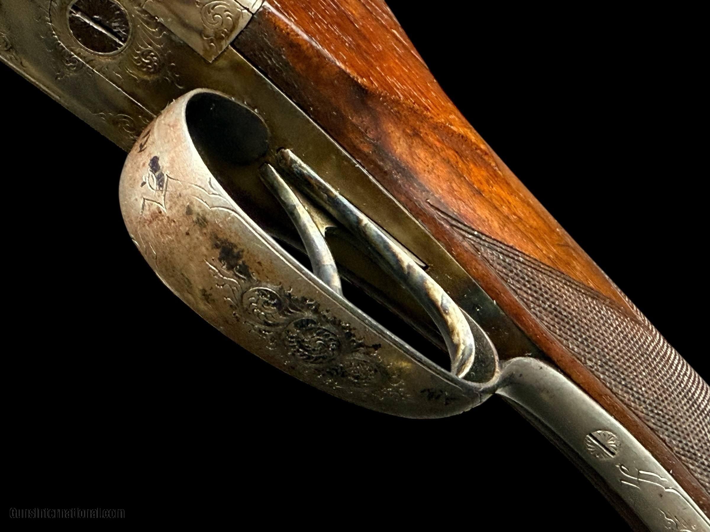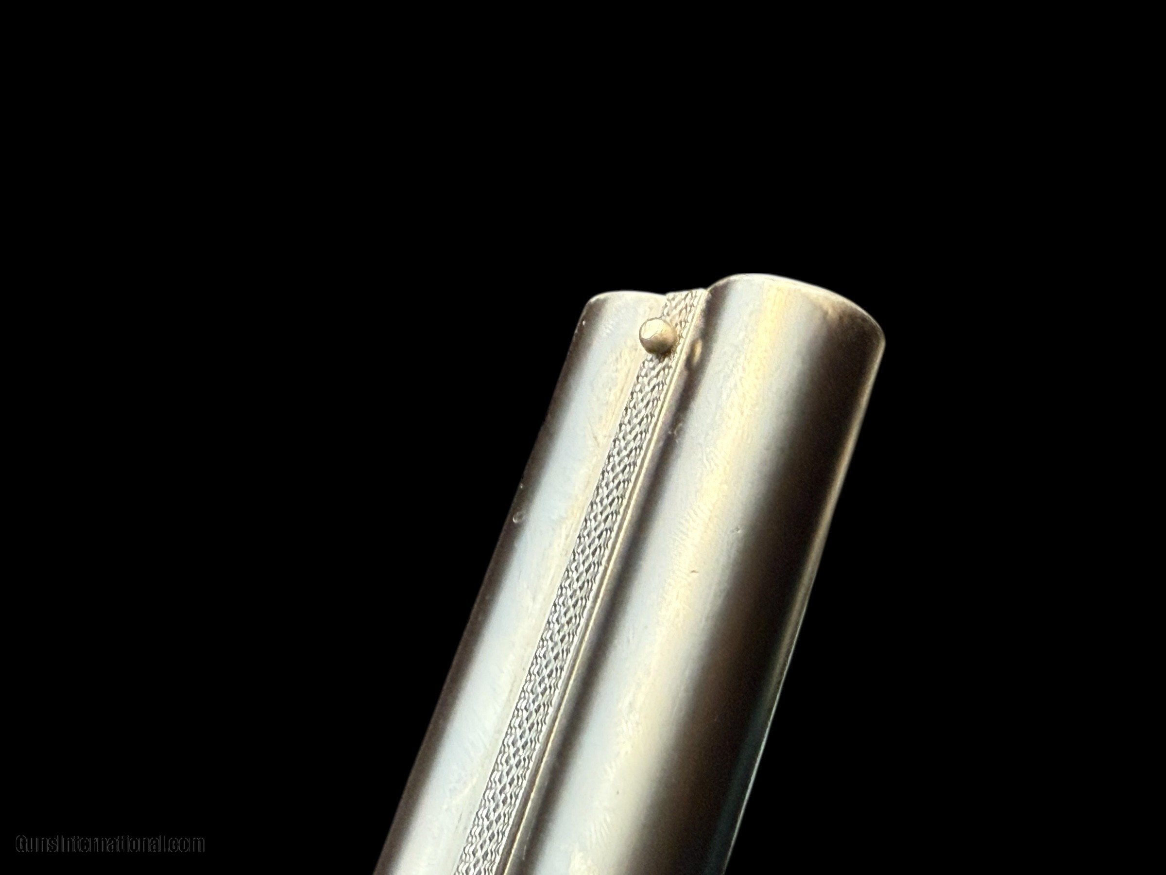 Description: WILLIAM READ & SONS - BOSTON SXS GAME GUN - CASE-COLOURED AND SCROLL ENGRAVED BOXLOCK ACTION WITH THIRD FASTENER & SIDECLIPS - 20GA - 2 1/2" CHAMBERS - BELGIUM NITRO PROOFS - 27 1/2" BARRELS - CHOKES: .007 / .027 DOUBLE TRIGGERS - EXTRACTORS - AUTO SAFETY - WALNUT SEMI-PISTOL GRIP STOCK W/ HORN BUTTPLATE - DIMS: LOP: 14 1/8" | DAC: 1 5/8" | DAH: 3" WEIGHT: 5LBS 11OZ CONDITION: GUN IS IN GOOD OVERALL ORIGINAL CONDITION AS-FOUND. NICE CASE COLOR REMAINS AS PICTURED. ACTION TIGHT AND ON-FACE. BORES CLEAR. TRIGGERS CRISP. BLUING VERY GOOD OVERALL. WOOD OIL FINISH AGED AND VARIOUS LIGHT IMPRESSIONS AS PICTURED. GENTLEMEN, THIS IS A WELL-BUILT BELGIUM SXS GAME GUN MADE FOR WILLIAM REED & SONS OF BOSTON. PERFECT LITTLE QUAIL, GROUSE, OR WOODCOCK GUN WITH AN AMERICAN STORE HERITAGE. A LITTLE HISTORY ON WILLIAM READ & SONS: Curio/Relic: Yes Shotgun Gauge: 20 Gauge Model: SXS GAME GUN Serial Number: 1426 Barrel Length: 27.5 Chambers: 2 1/2" OR 65MM Ejectors: NO Condition: GOOD Metal Condition: GOOD Wood Condition: GOOD Bore Condition: GOOD Action: BOXLOCK Triggers: DOUBLE Price: $1,850.00 Contact Seller |