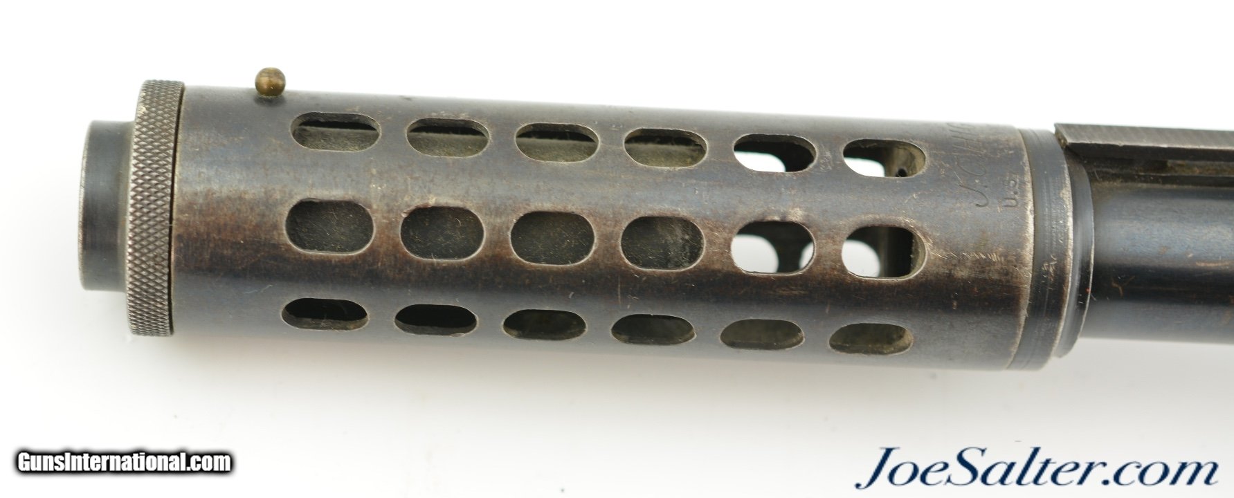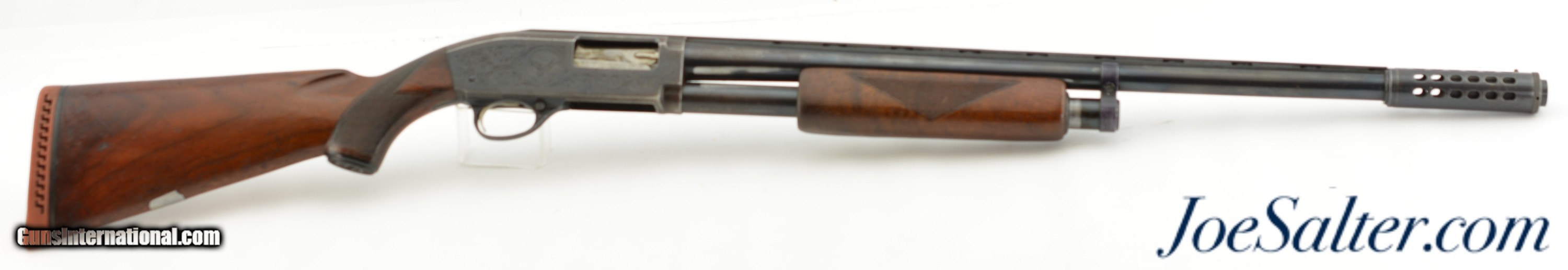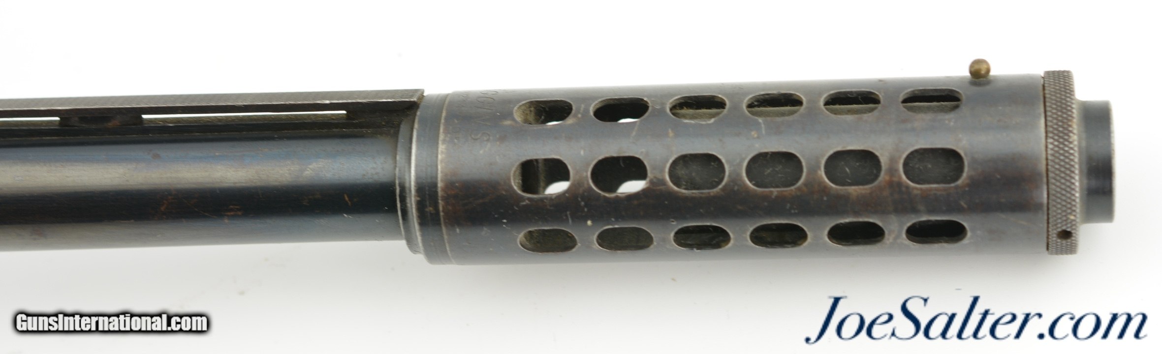 Description: Serial #NSN, 12 Gauge (2 ¾ inch chamber), 26 ¾ inch vent-rib barrel equipped with the J.C. Higgins Power Pak recoil reducing choke system with Medium Range tube installed having an excellent bore. This is the J.C. Higgins, Sears Roebuck and Co. marked Model 20, part #583.60 pump action shotgun manufactured by High Standard in the 1950s. The deluxe model features an elaborate hand engraved receiver with a duck in flight surrounded by elaborate scroll on both sides covering about 90%, checkered wood and a blank aluminum escutcheon. The rugged pump saw regular use and retains about 70-75% blue toning to gray-brown with numerous use marks and scratches. The checkered stock and forearm remain solid with old use marks, mild bruises and contusions. The action functions properly with tight lock up. A scarce J.C. Higgins Model 20. FFL or C&R; SOLD |