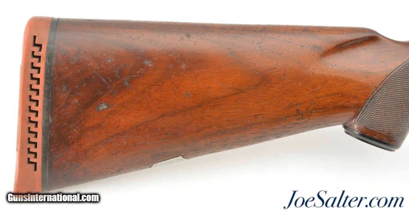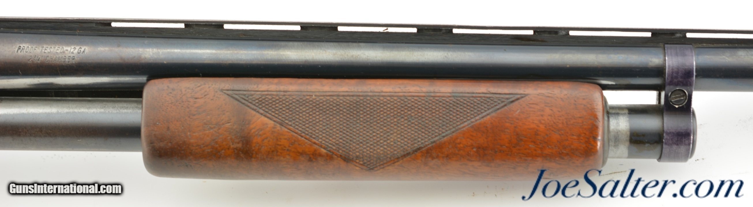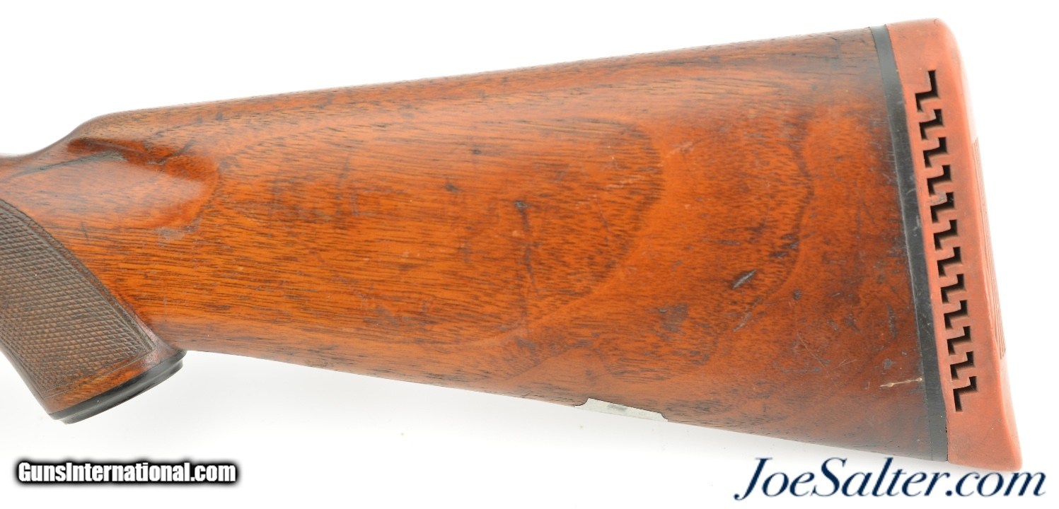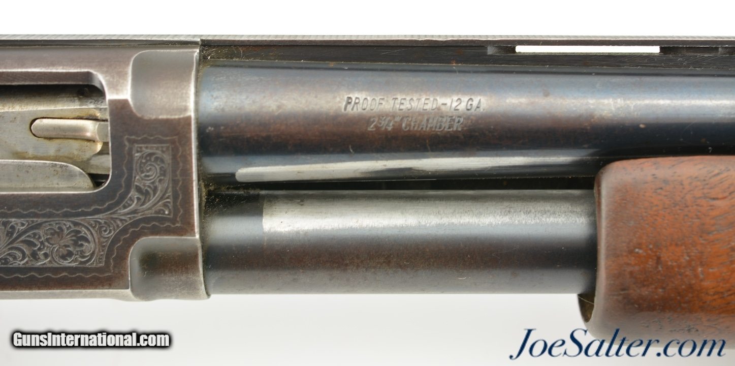 Description: Serial #NSN, 12 Gauge (2 ¾ inch chamber), 26 ¾ inch vent-rib barrel equipped with the J.C. Higgins Power Pak recoil reducing choke system with Medium Range tube installed having an excellent bore. This is the J.C. Higgins, Sears Roebuck and Co. marked Model 20, part #583.60 pump action shotgun manufactured by High Standard in the 1950s. The deluxe model features an elaborate hand engraved receiver with a duck in flight surrounded by elaborate scroll on both sides covering about 90%, checkered wood and a blank aluminum escutcheon. The rugged pump saw regular use and retains about 70-75% blue toning to gray-brown with numerous use marks and scratches. The checkered stock and forearm remain solid with old use marks, mild bruises and contusions. The action functions properly with tight lock up. A scarce J.C. Higgins Model 20. FFL or C&R; SOLD |