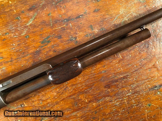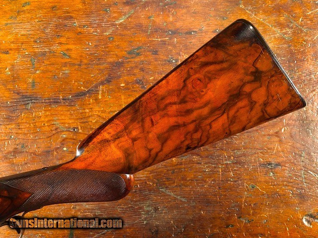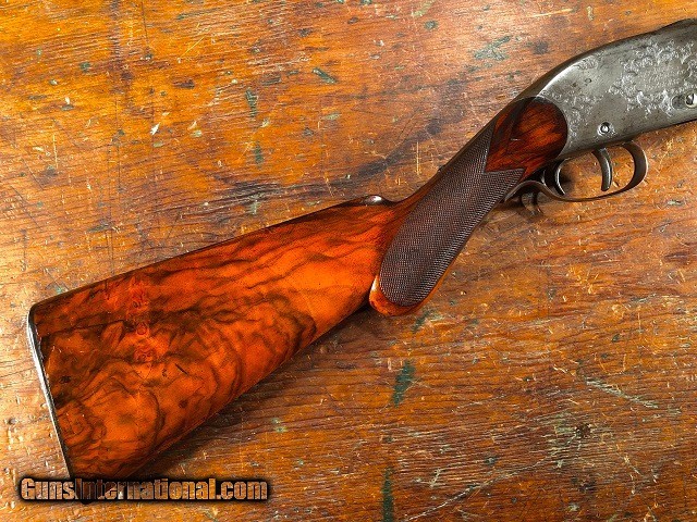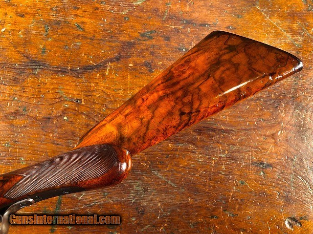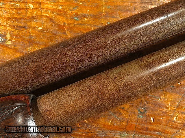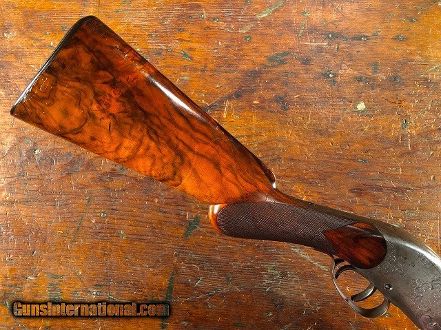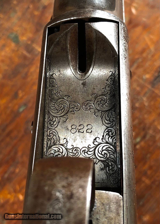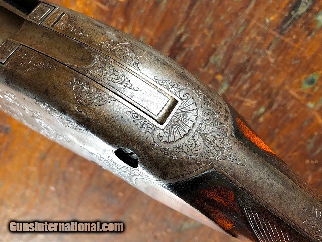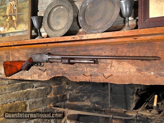 Description: *SALE PENDING* Very Rare Exhibition Quality Nimschke Engraved Model 1882 Spencer Arms Co. "Grade A" First Model Deluxe Pump-Action Shotgun, 12 Ga, mfg. circa 1884/1885. Created by Christopher Spencer, designer of the Spencer rifles and carbines of Civil War and plains Indian Wars fame, the Spencer shotgun is considered to be the first successful American pump-action repeater and subsequently the gun which would begin the demise of the traditional side-by-side double. Spencer manufactured the guns between 1884-1889 before selling out to Francis Bannerman who continued production from 1890-1907. Bannerman's version however lacked the finer quality of the original Spencer production. The gun offered here is one of approximately 800 or so "First Models" manufactured within the first two years of production and is an extraordinary example of a premier "Grade A" model which cost $100 new. Spencer's first catalog printed in 1885 describes this gun as "Finest Italian Walnut, pistol grip, Turkish Damascus barrel, extra engraved". The 30" barrel retains 90% vivid original browned Turkish Damascus pattern (note the swirled "star" design) while the magazine tube shows 75% twist-steel pattern. The case hardened frame has faded mostly to silver with some mottled plum/gray definition. It is profusely engraved throughout in the style of L. D. Nimschke's New York shop and features elegant scrolls with a clamshell motif atop the wrist and a dog's head on the left side of the frame within a panel. Likewise the right side features an identical panel inscribed within "SPENCER / ARMS CO / PAT. APR 1882". The engraving is flawlessly sharp and crisp throughout and covers the top and bottom of the frame, carrier & ejector, triggerguard, and both upper & lower tangs. The Italian Walnut stock features a finely checkered pistol grip with diamond pattern forearm and shows breathtaking marbelized grain. Without exaggeration this is the finest wood I have ever seen on a Spencer shotgun, period. It retains nearly all of it's original high-polish luster with no cracks, chips, or repairs whatsoever. Original checkered hard rubber butplate is sharp with no cracks or chips. Original nickel silver bead front sight with serial number "822" marked on the carrier and clear early Spencer barrel address which reads "SPENCER ARMS CO. WINDSOR CT. U.S.A.". Occasionally if the action is cycled quickly the hammer will cock but then drop as the pump is returned forward. I attribute this to being a bit gummed up with old dry oil within and am sure a proper internal cleaning will remedy it. Generally it will operate properly however and the action is very tight and crisp. The carrier, cartridge extractor, and spring loaded ejector all work flawlessly. Near mirror bright bore with light blackpowder frosting and fine pinprick pitting scattered throughout. Engraved Spencer shotguns are an extreme rarity in any form yet finding an early First Model which conforms exactly to Grade A specifications is virtually impossible. Certainly the finest Spencer we have ever offered and I don't expect to see another like it! Jeremiah Johnson Trading sells antique firearms manufactured prior to 1899 and muzzleloading blackpowder reproductions only. For the purpose of these conditions the term "antique firearm" will hence include muzzleloading blackpowder reproductions. Buyers must be 21 years of age or older and have no felony convictions to purchase antique firearms. Antique firearms do not require Federal licensing and may be shipped directly to the buyer with the following exceptions. No antique firearms will be shipped to Washington D. C. or any of the five boroughs of New York City (or residents thereof). Some restrictions may apply to antique firearms shipped to California and will be noted in the item description if applicable. Any handgun (antique or muzzleloading blackpowder reproduction) shipped to New Jersey must ship to a licensed FFL holder. Any muzzleloading blackpowder reproduction rifle, shotgun, or handgun shipped to Illinois must ship to an FFL holder. No international sales of antique firearms which may fire conventional metallic cartridges or any reproductions regardless of ignition. Antique muzzleloaders, or antiques which fire obsolete cartridges, may be shipped internationally however it is the responsibility of the buyer to know and abide by their local laws and provide proof that the antique arm is legal to receive and own. Payment can be made by money order, banker's check, personal check, or credit card (no fees). Please allow 7-10 business days for clearance on personal checks. If paying by credit card please call us directly to process your order. If not satisfied with an item within 3 days of receiving it, simply return the item in the same condition as shipped for a full refund, minus return shipping costs. Cleaning, disassembly, or altering of a firearm in any way will void inspection privileges. Layaway may be allowed upon negotiation, but will void inspection privileges. Buyer pays actual shipping & insurance costs. Occasionally a post-1898 firearm from my personal collection may be sold under this account however it will be noted that any such transaction is a personal sale in no way affiliated with our business. Any such arm will be shipped to a licensed FFL or C&R holder in accordance with Federal law. All firearms are sold as collector's items and are not warranted safe for shooting. Please consult a competent gunsmith prior to shooting any firearm. Message or call with any questions about this firearm, or any of our other items at 860-873-1092 (office) or 860-345-2100 (shop). SOLD Antique: Yes Shotgun Gauge: 12 Gauge Manufacturer: Spencer Arms Co. Model: Pump-Action Shotgun Serial Number: 822 Barrel Length: 30 Barrel Type: Turkish Damascus Stock: Italian Walnut Manufacture Date: 1884/1885 Engraving: Yes |