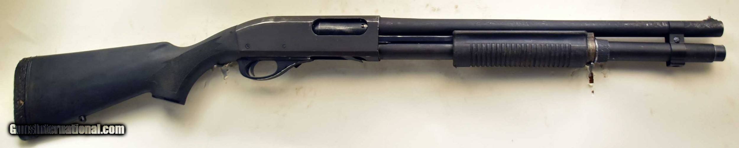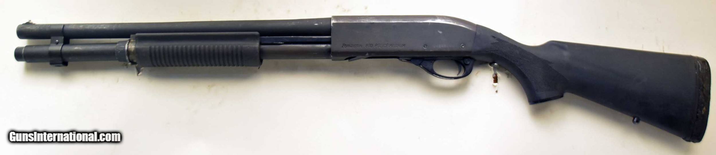 Description: Remington 870 Police Magnum Pump Action Shotgun. Serial # D828563M {12 ga}. 2 3/4" or 3" chamber. Synthetic furniture in VG condition with Fair+ butt pad. Matte metal finish 70%. Has magazine extension tube (2 extra shells) , magazine brace, soft rubber butt pad in fair condition, rear sling swivel stud, front stud missing.. Barrel is 18 1/2" long. Bore is bright and shiny. $ SOLD |