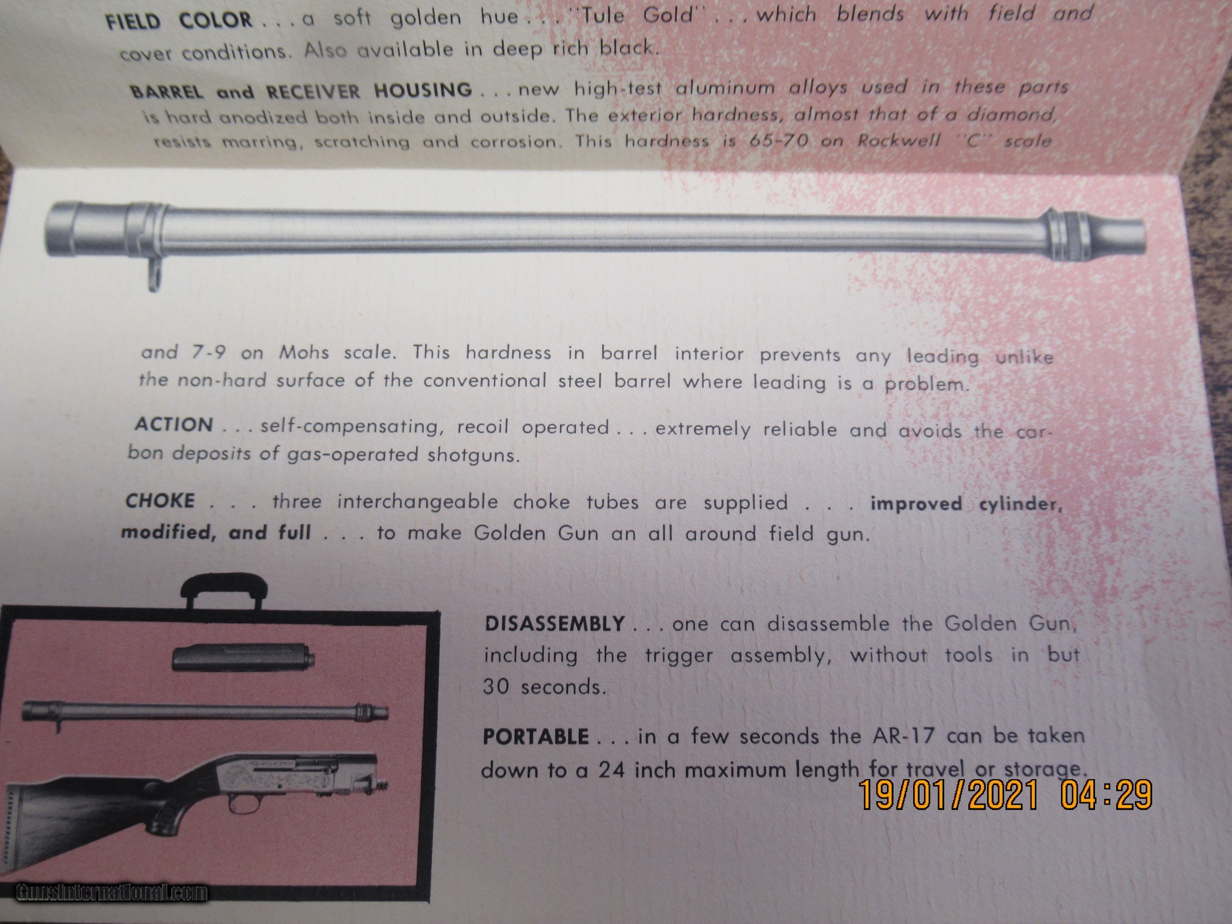Description: Mr. Stoner has not only brought the AR-15 to prominence in the process he created one of the most unique shotguns in existance. This shotgun is so unique that GI had no designation for it. There are not over 1,100 in existence and they were manufactured in the early 1970's. This particular gun is in great condition and has not been shot a great deal. It looks new and there is the original brouchure with it that tell its story. You can also find it on the internet. Its a two shot semi-auto. This AR-17 is the bit-coin of the gun industry, there won't be any more AR-17 in the future. It can be yours for $1,995.00. In my opinion it would be a shame to shoot this gun, it should be added to someones unique collection. An opportunity such as this does not come everyday. SOLD Shotgun Gauge: 12 Gauge Manufacturer: Armalite Model: AR-17 Condition: very good |
