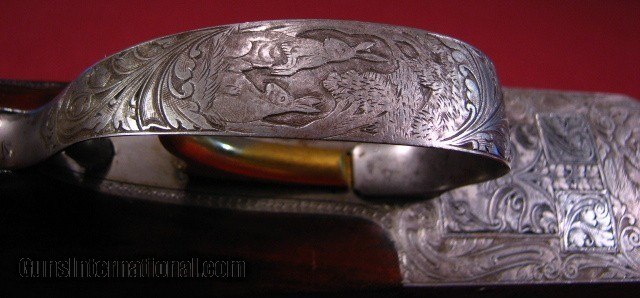 Description: Browning Superposed Diana Grade 12 Gauge with round knob and long tang manufactured in 1963 with 26 1/2" Sk/Sk vent rib ejector barrels with field forend. Bores are excellent measuring .728 on the top and .726 on the bottom. Choked .007 top and .004 bottom. French Silver receiver with full coverage typical Diana Grade engraving by A. Marechal and signed on both sides. Pheasants on the left, ducks on the right, quail on the bottom, and rabbits on the trigger guard. Gold plated single selective trigger with 80% gold remaining. Stock is very nice with strong crotch figure. 14 1/4" LOP to factory hard buttplate. DAC-1 1/2" DAH-2 1/2" Neutral cast. 7lb 9oz Cased in a very nice Browning Hartman case with two keys. This is a very nice and all factory original piece. Barrel blue remains at 98% Stock finish at 96% and checkering at 98% Excellent value. SOLD |