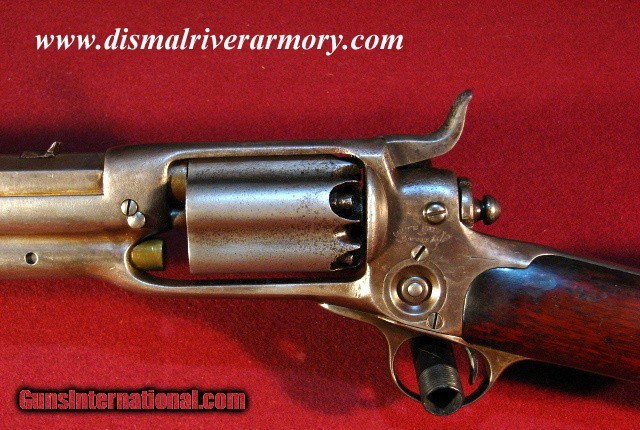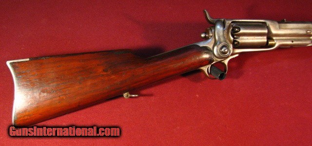 Description: Colt Revolving Shotgun Model of 1859 in .60 bore (20 gauge) with a 31" smooth bore barrel. This is a five shot sidehammar revolving percussion shotgun with a November 24th, 1857 patent date and a serial number of 1973. The metal exhibits a uniform silver patina with diffuse superficial pitting commensurate with age. It does not appear to have been worked on or altered in any way. Mechanical function appears to be intact however I would not be inclined to shoot it. The stock and forend exhibit no cracks or repairs. The forend tip is non-ferrous, possibly pewter. The trap butt contains the tip of a cleaning rod. I have no idea if this is original to the gun or not. These guns were produced circa 1860-1868 and are the rarest of the Colt long arms. Approximately 1100 were produced with the large majority being 10 Gauge. This gun is a true survivor! Price: $7,800.00 Buy Now Contact Seller |