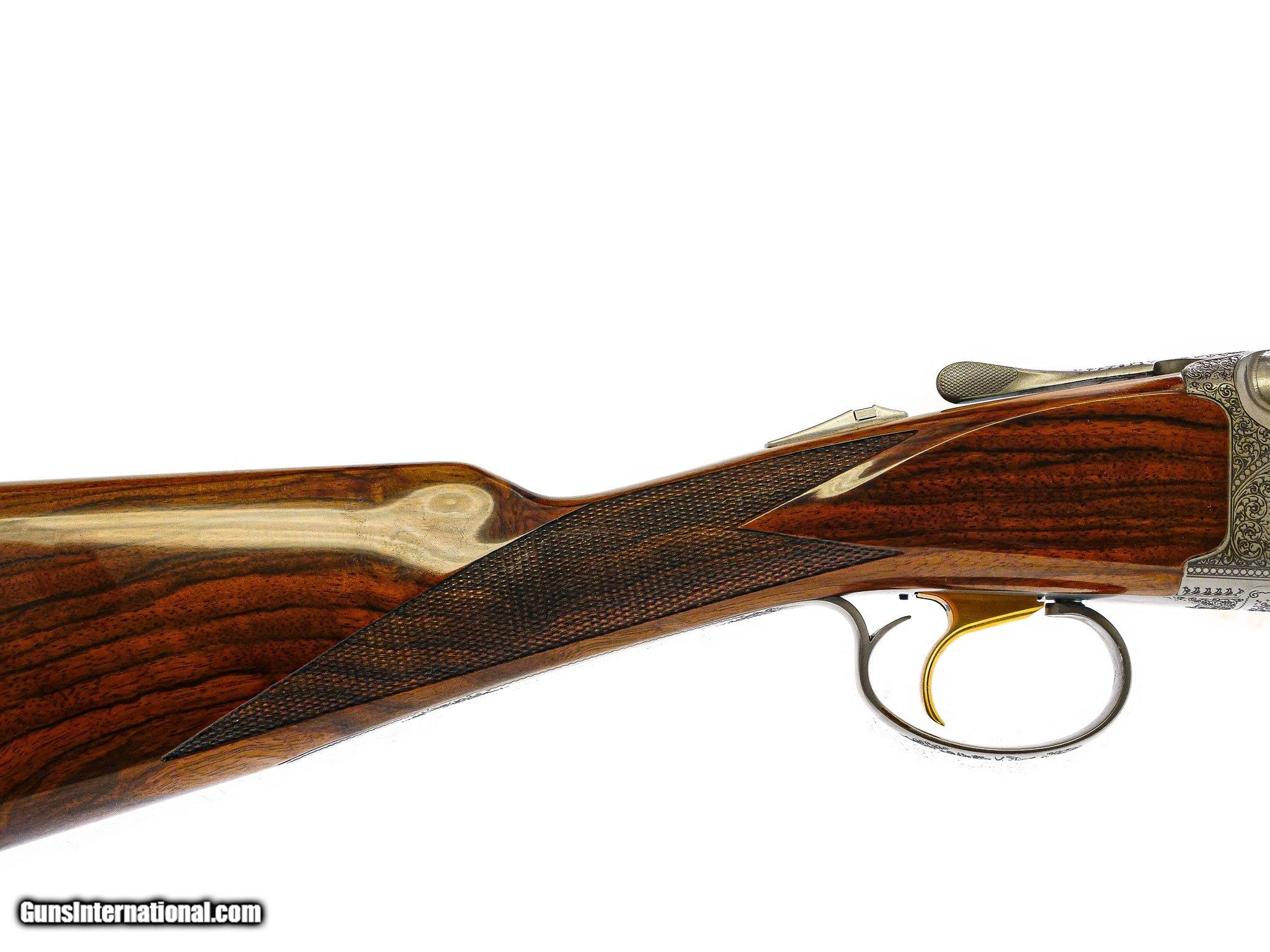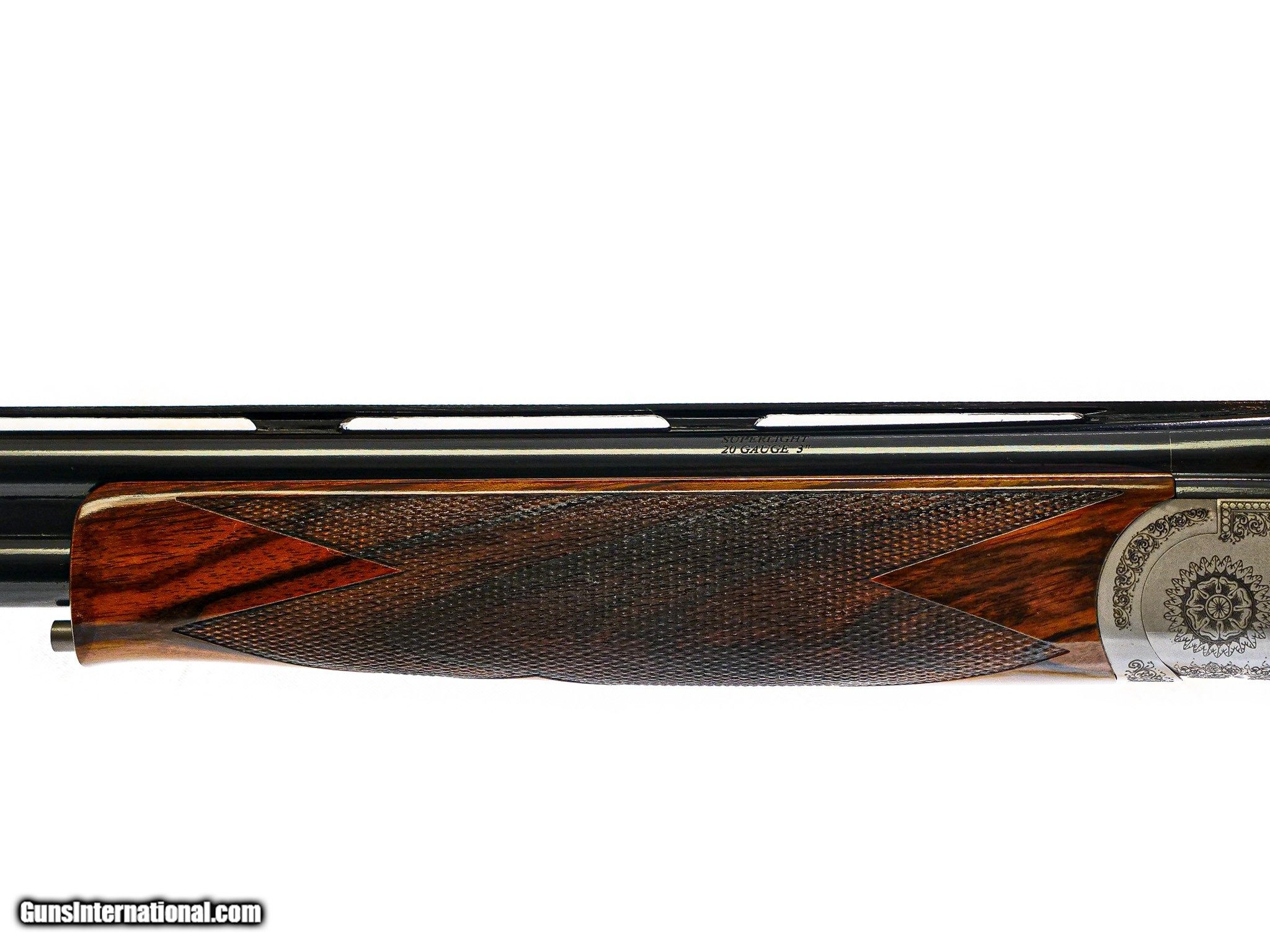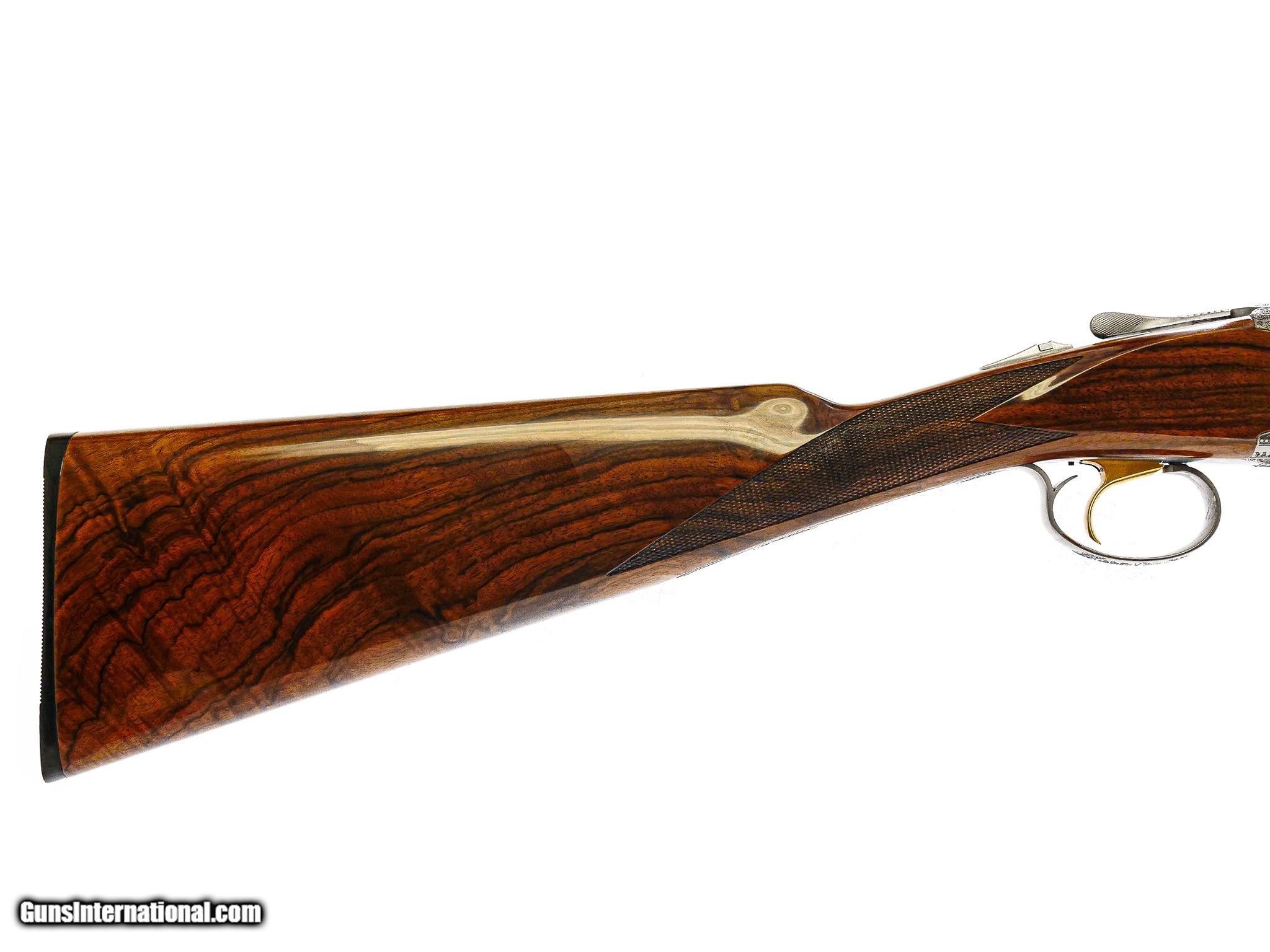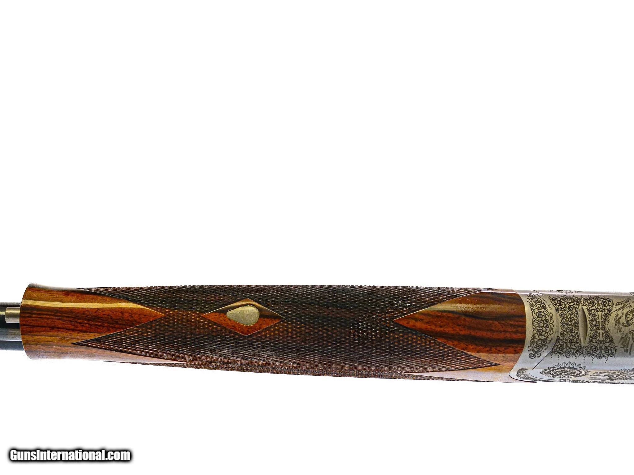 Description: CSMC - Pointer Superlight, O/U, 20ga. 28" Barrels with Factory Hidden Screw-in Choke Tubes. Exhibition Turkish Circassian walnut straight grip stock, round frame, schable forend, gold single selective trigger, automatic ejectors, factory serrated butt plate, TruOil finish, long tang trigger guard, ventilated rib, French gray receiver with magnificent pointer game scenes on each side of the receiver, quail on the bottom, and pheasant on trigger guard bow, the latest offering from the master gunsmiths at Connecticut Shotgun Mfg Co., 100% new and unfired, available for immediate delivery. Base Price - $4,995.00, Options Include: Exhibition Turkish Circassian Wood - $1200.00, TruOil Finish - $500.00, S & H - $50.00. Inv: 71396 5 lbs. 14 oz. 14 3/8” x 1 ½” x 2 ¼” $6,445.00 CALL 860-225-6581 FOR FURTHER INFORMATION ABOUT THIS GUN & THE INSPECTION PERIOD. SOLD |