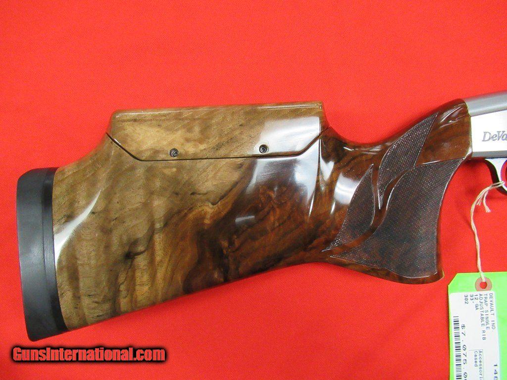 Description: Late production Devault Industries Trap Single #302 -- This gun features a fully adjustable rib with screw chokes and a highly figured roll-over Monte Carlo stock with adustable comb. This gun is virtually new showing little if any use. Replacement cost on this gun is over 12K. SOLD |