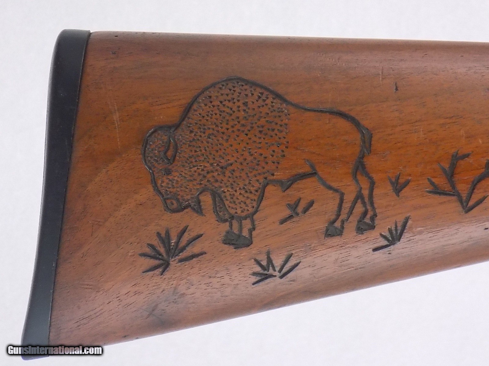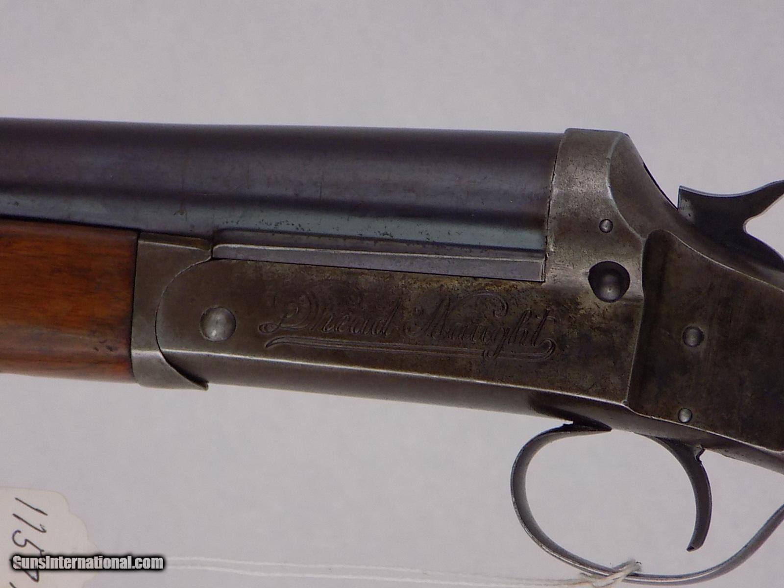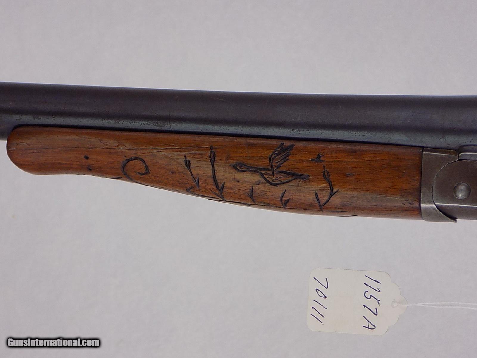 Description: #1157A DREAD NOWGHT SS SHOTGUN, 12 ga., SN UZ8XX, 32” bbl., heavy breech gun, probably made by Stevens Gun Co., exc. FC bore, 97% bbl. blue, traces of case colors on action, buttstock carved with boar on left side, buffalo on right. $150 SOLD Antique: Yes Shotgun Gauge: 12 Gauge |