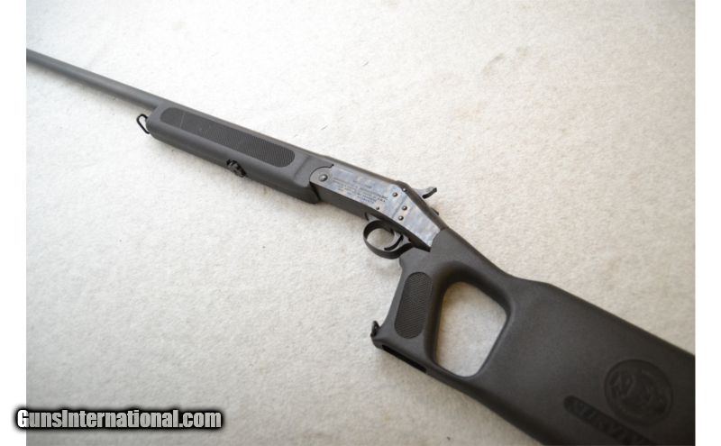 Description: Good condition overall. Handling marks to metal and stock; none are serious. Bore looks good with some stubborn fouling. SOLD Caliber Info: 12 Gauge Chambers: Single-shot break action chambering up to 3" shells. Metal Condition: Very good. Wood Condition: Furniture is in very good condition. Bore Condition: Very good; looks to have some stubborn fouling. Barrels: 30" Satin blued. Triggers: Wide blued metal with smooth surface. Stock: Matte black synthetic thumb hole style with textured grip area. Recoil plate unscrews for shell storage. Stock Dimensions: 13½" LOP Fore End: Matte black synthetic with full length textured side panels. Butt Pad: Black plastic plate. Weight: 5½lbs Sights: Brass front bead. Chokes: Fixed full choke. Item Location: Green Bay, WI |