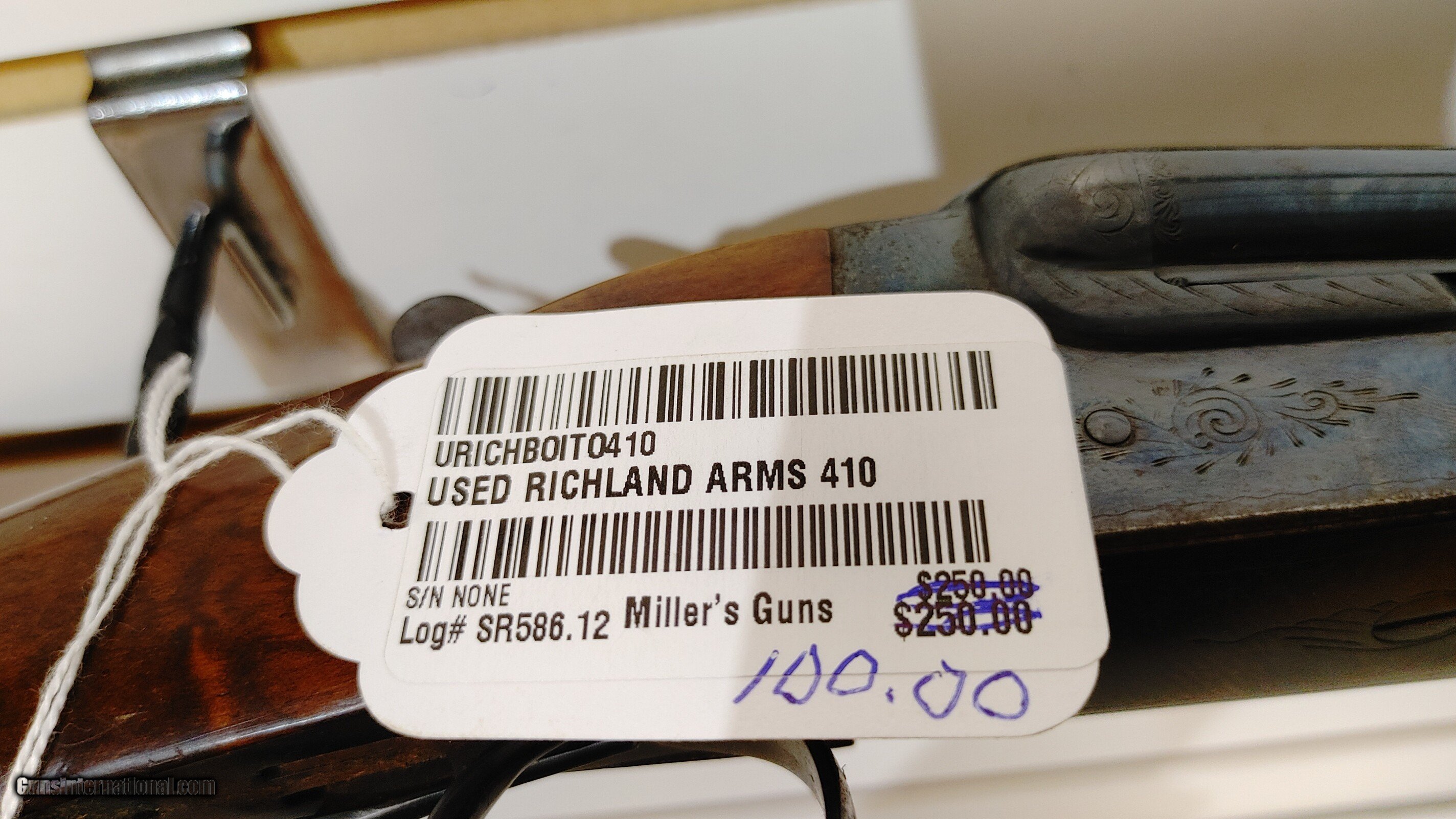 Description: Used Richland Arms SXS 410 26" bbl fair condition Buyer pays shipping Millers Gun Center Located in New Castle, Delaware "Home of TAX-Free shopping" No Credit Card Fees Send Gun international inquiry and then call 302-328-9747 to complete your purchase SOLD Serial Number: NONE |