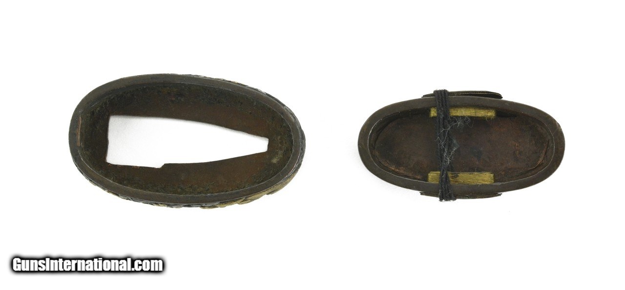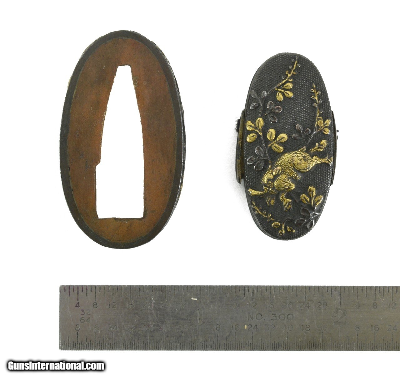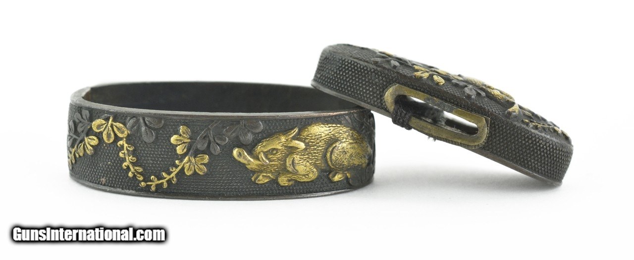 Description: "Kinko Fuchi Kashira. Shakudo nanako ground theme of wild gold boars amidst foliage with gold and shakudo highlights. Unsigned. SOLD |