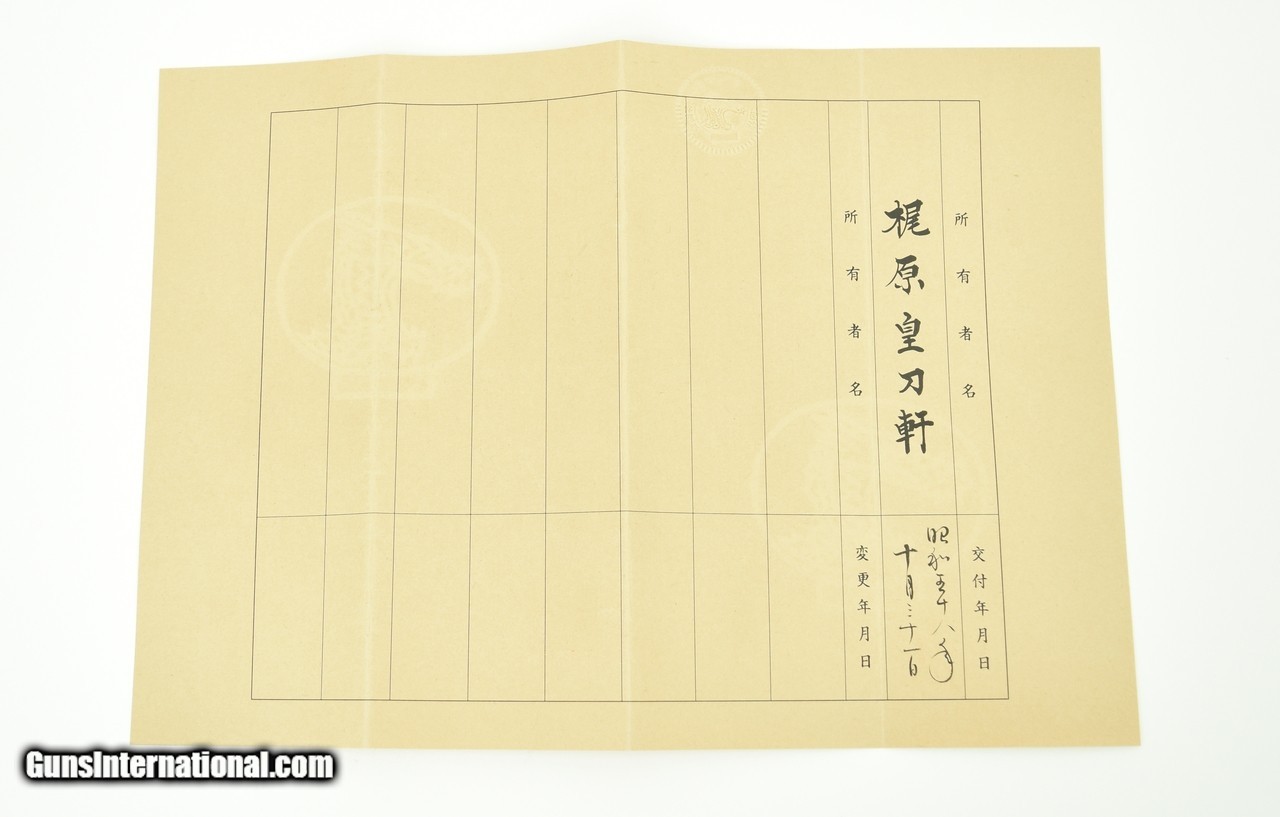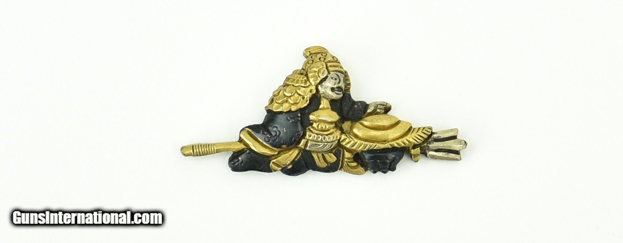 Description: "Kinko Menuki. Gold, silver and Shakudo. Motif of duck and figure with vessels. Excellent condition. SOLD |
