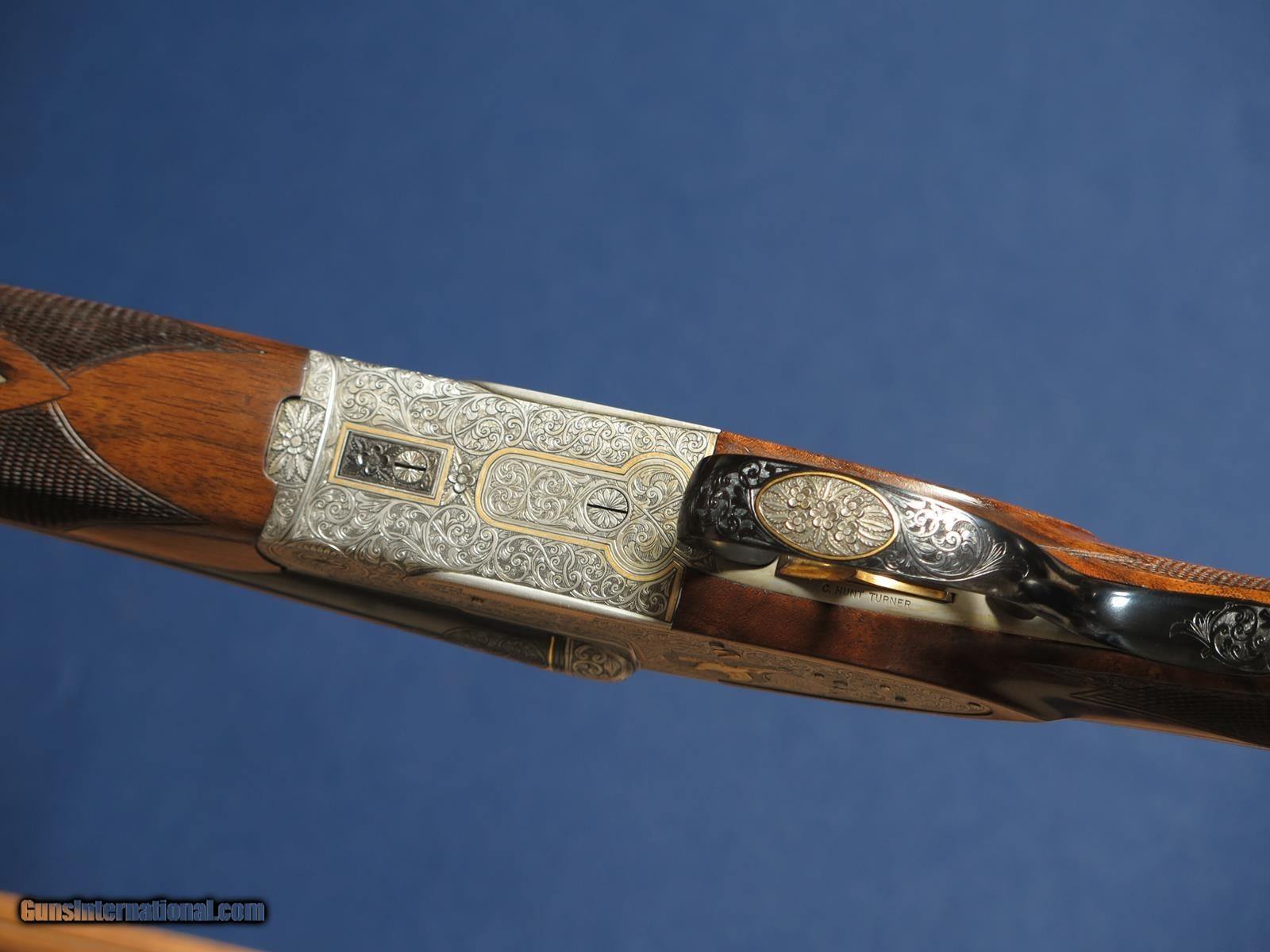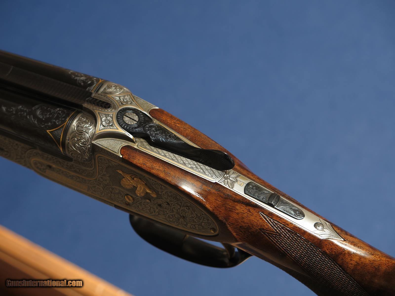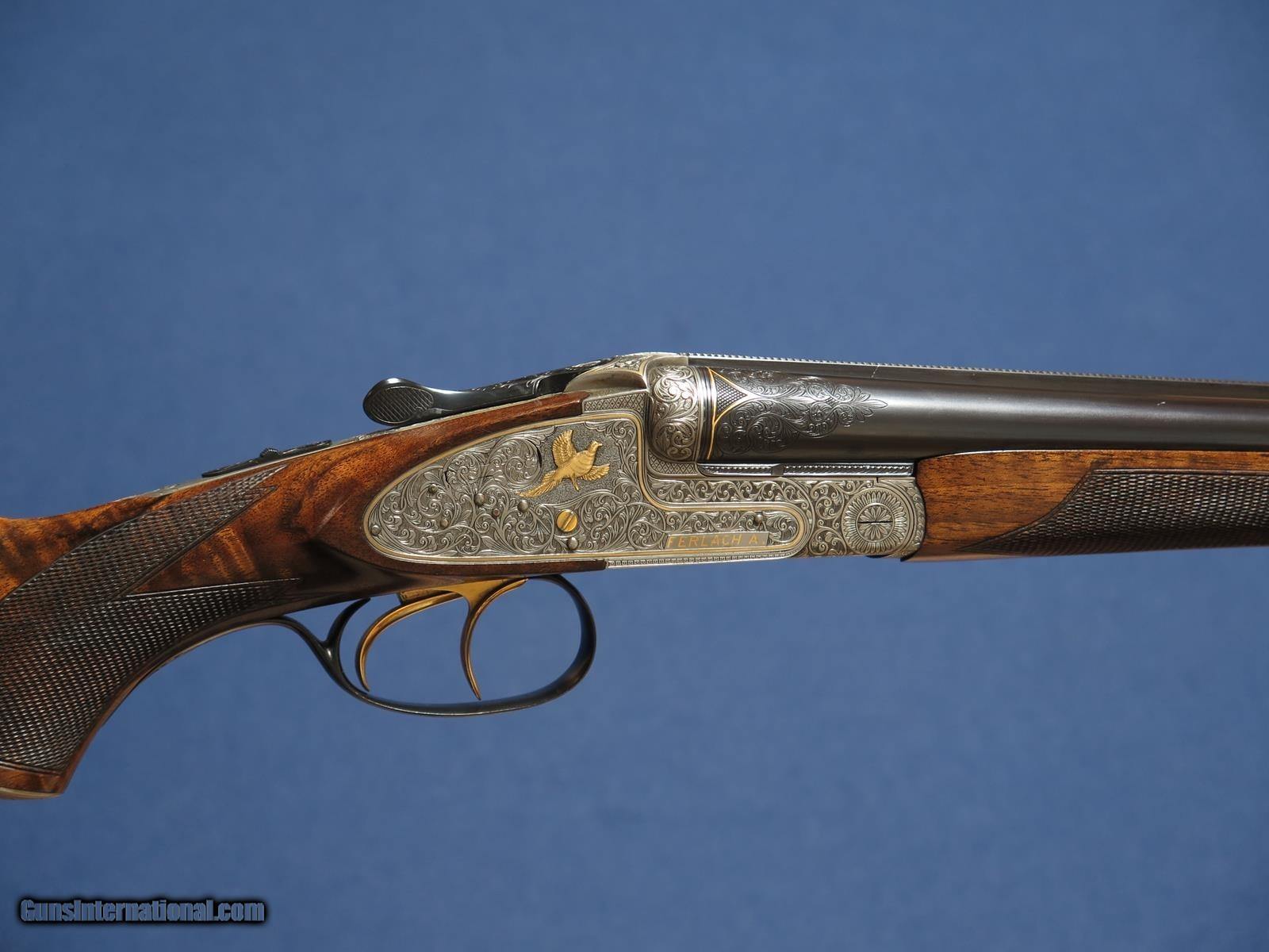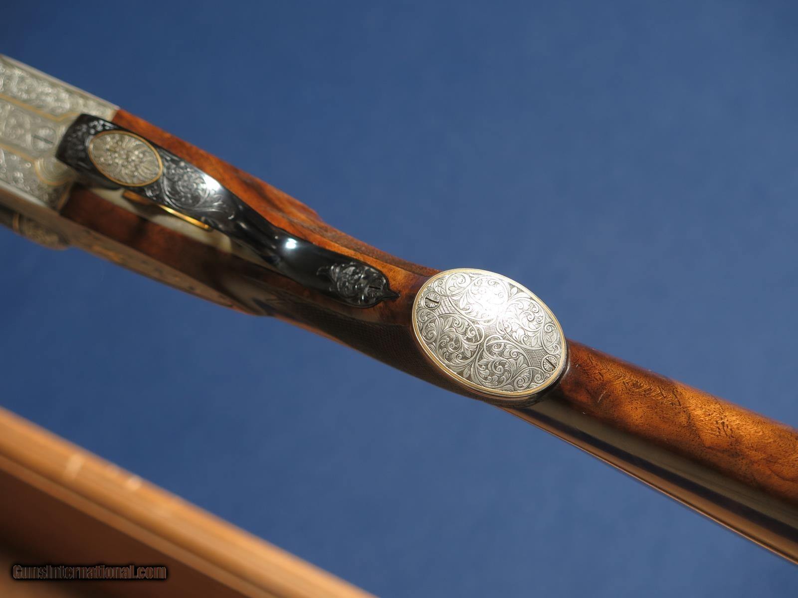Description: L. Borovnik Ferlach Sidelock 2 barrel 20ga. Engraved by Hunt Turner. Beautiful scroll engraving with gold borders and birds. 26 inch IC and Mod .012 .017 + 28 inch Mod and Full .017 .031. Double triggers. Ejectors. 14 1/4 LOP skeleton butt. Gold line and engraved barrels. 2 3/4 chambers. Engraved grip cap and trigger guard. 1 3/8 comb 2 1/2 heel. Absolutely beautiful gun. Excellent condition and bores. With wooden case with Borovnik label. 6 lbs 8 oz. Over 45 years in business, and not only do we buy guns, but we accept collections (and single/multiple guns) on consignment. SOLD Shotgun Gauge: 20 Gauge |