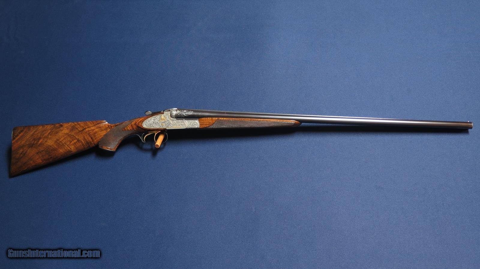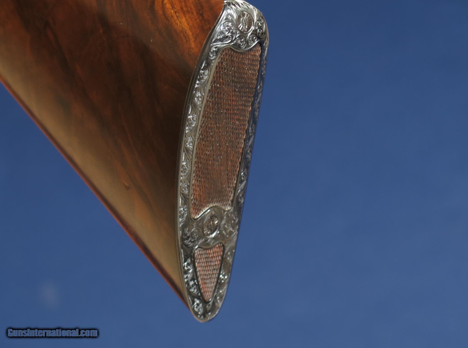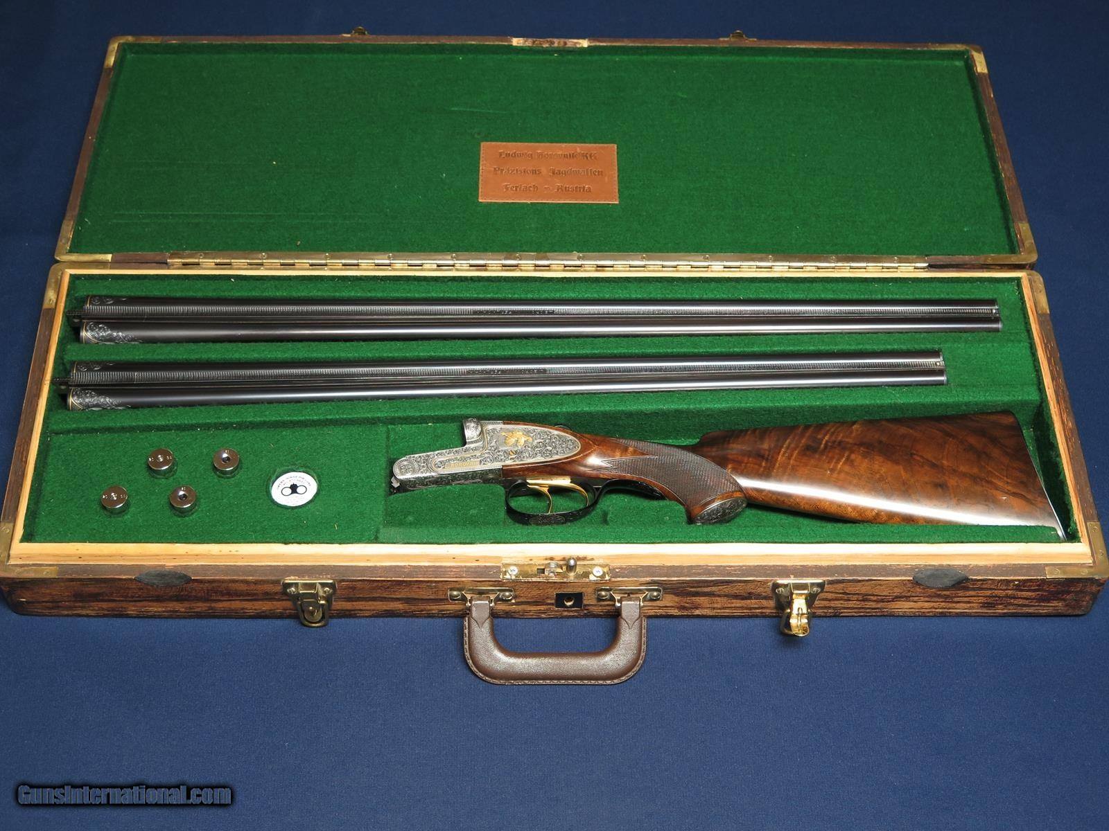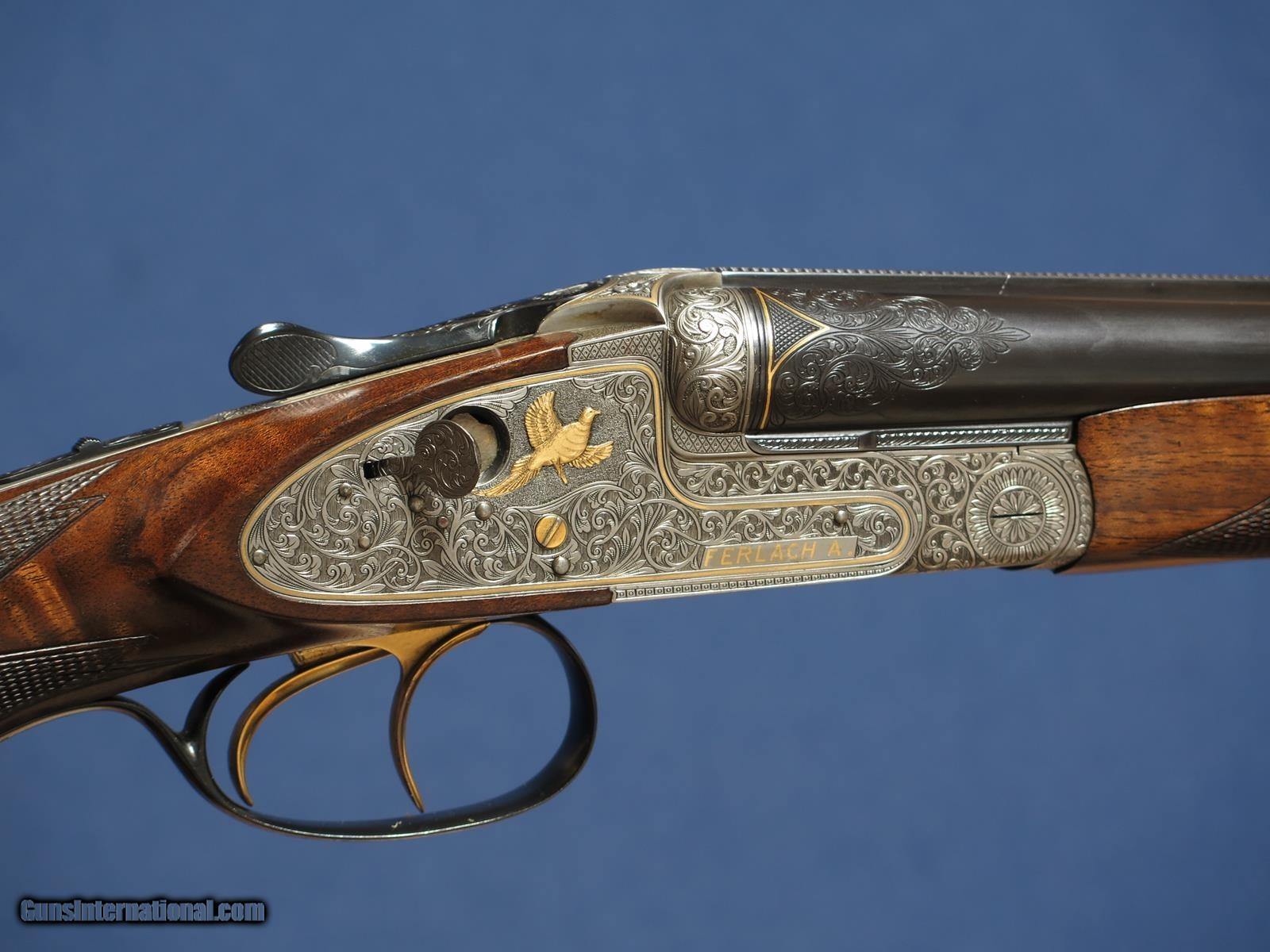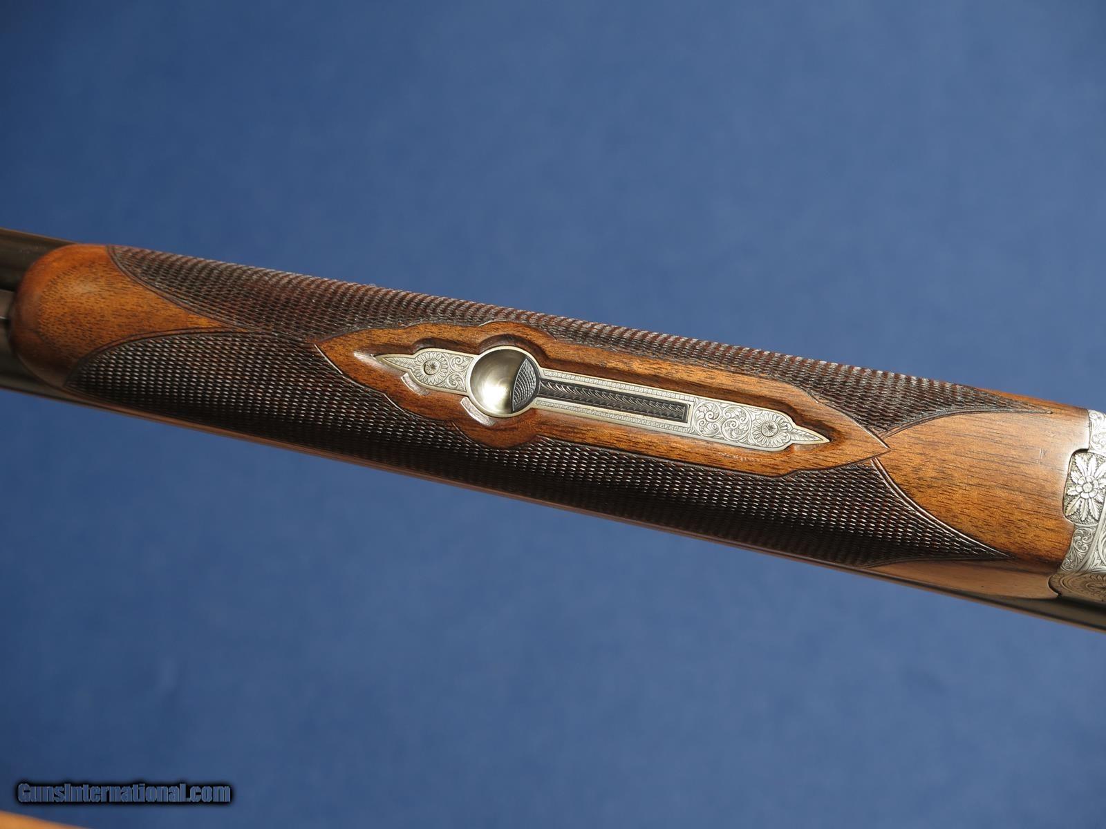 Description: L. Borovnik Ferlach Sidelock 2 barrel 20ga. Engraved by Hunt Turner. Beautiful scroll engraving with gold borders and birds. 26 inch IC and Mod .012 .017 + 28 inch Mod and Full .017 .031. Double triggers. Ejectors. 14 1/4 LOP skeleton butt. Gold line and engraved barrels. 2 3/4 chambers. Engraved grip cap and trigger guard. 1 3/8 comb 2 1/2 heel. Absolutely beautiful gun. Excellent condition and bores. With wooden case with Borovnik label. 6 lbs 8 oz. Over 45 years in business, and not only do we buy guns, but we accept collections (and single/multiple guns) on consignment. SOLD Shotgun Gauge: 20 Gauge |