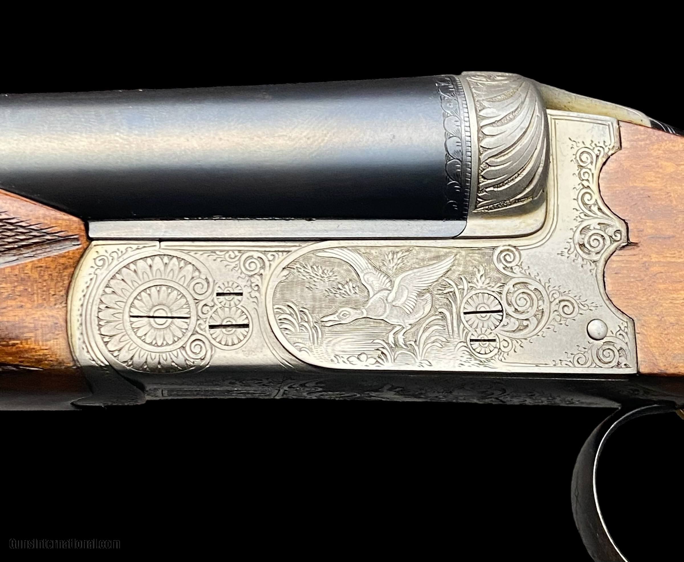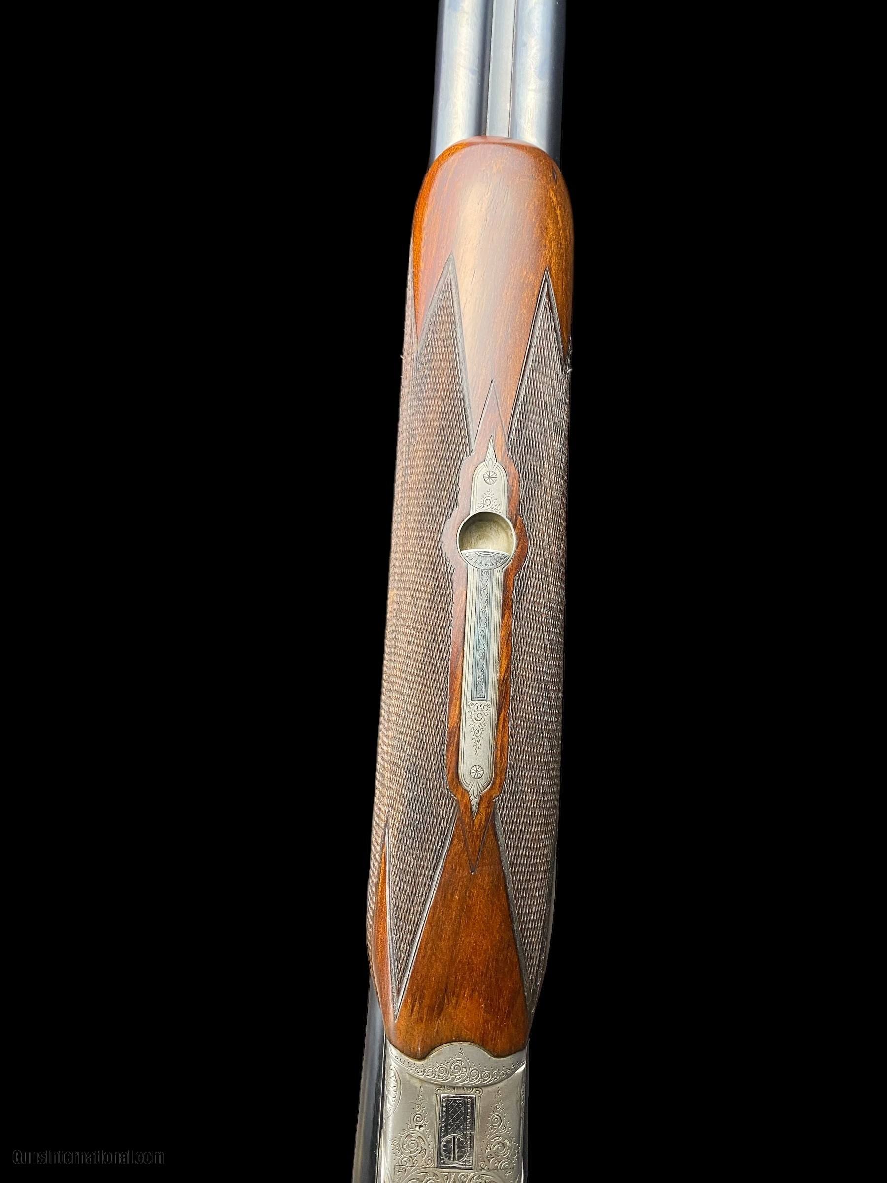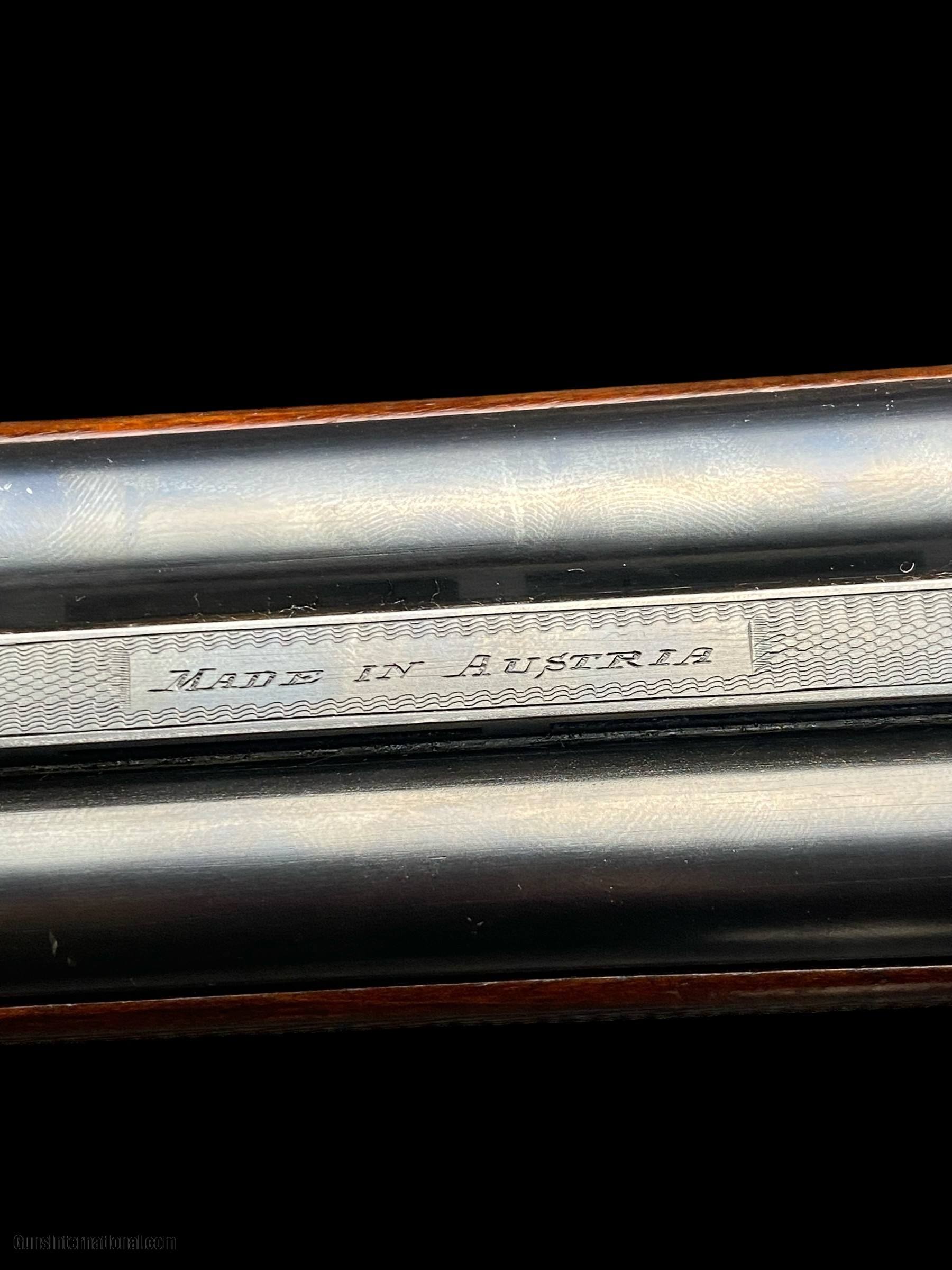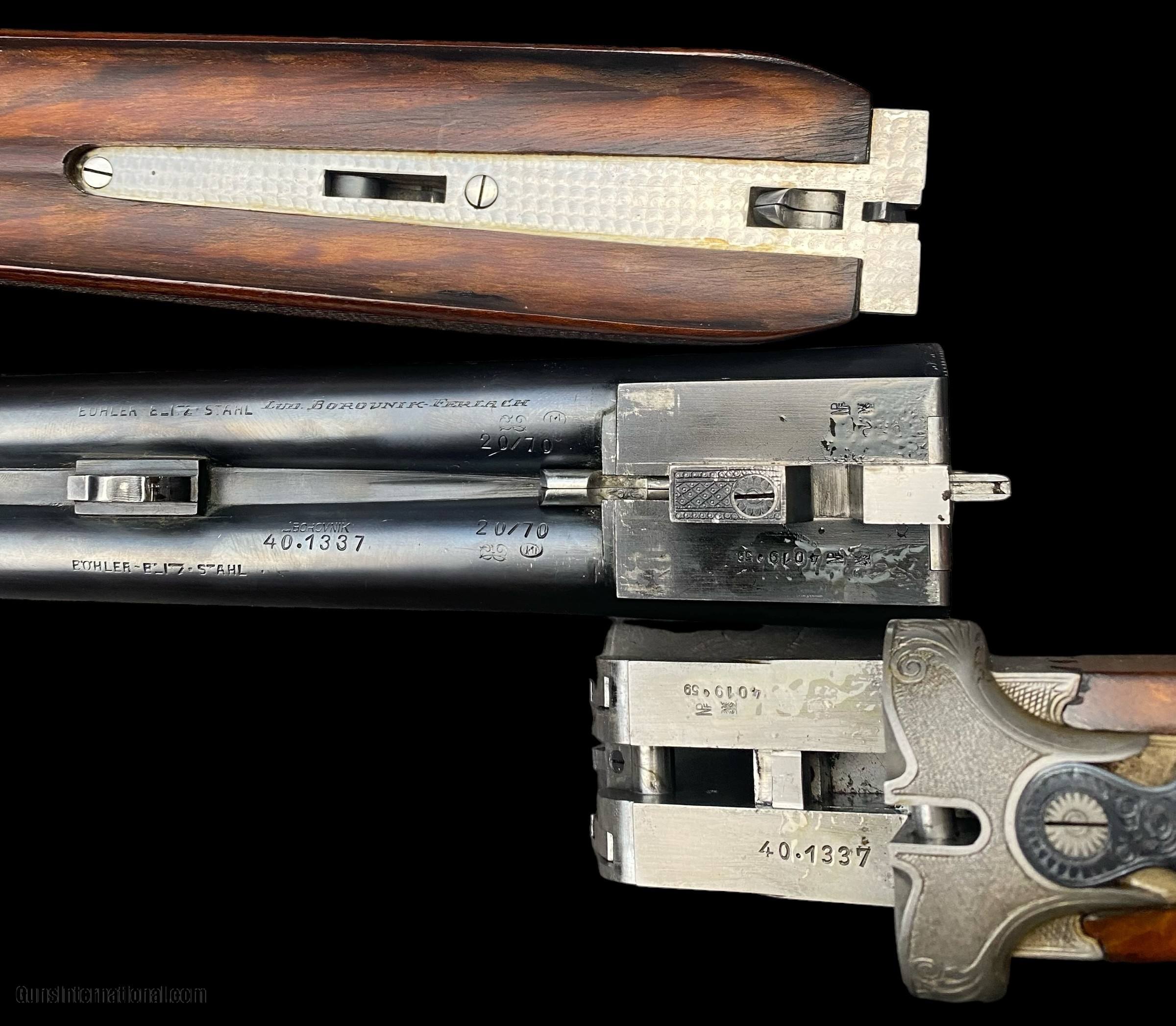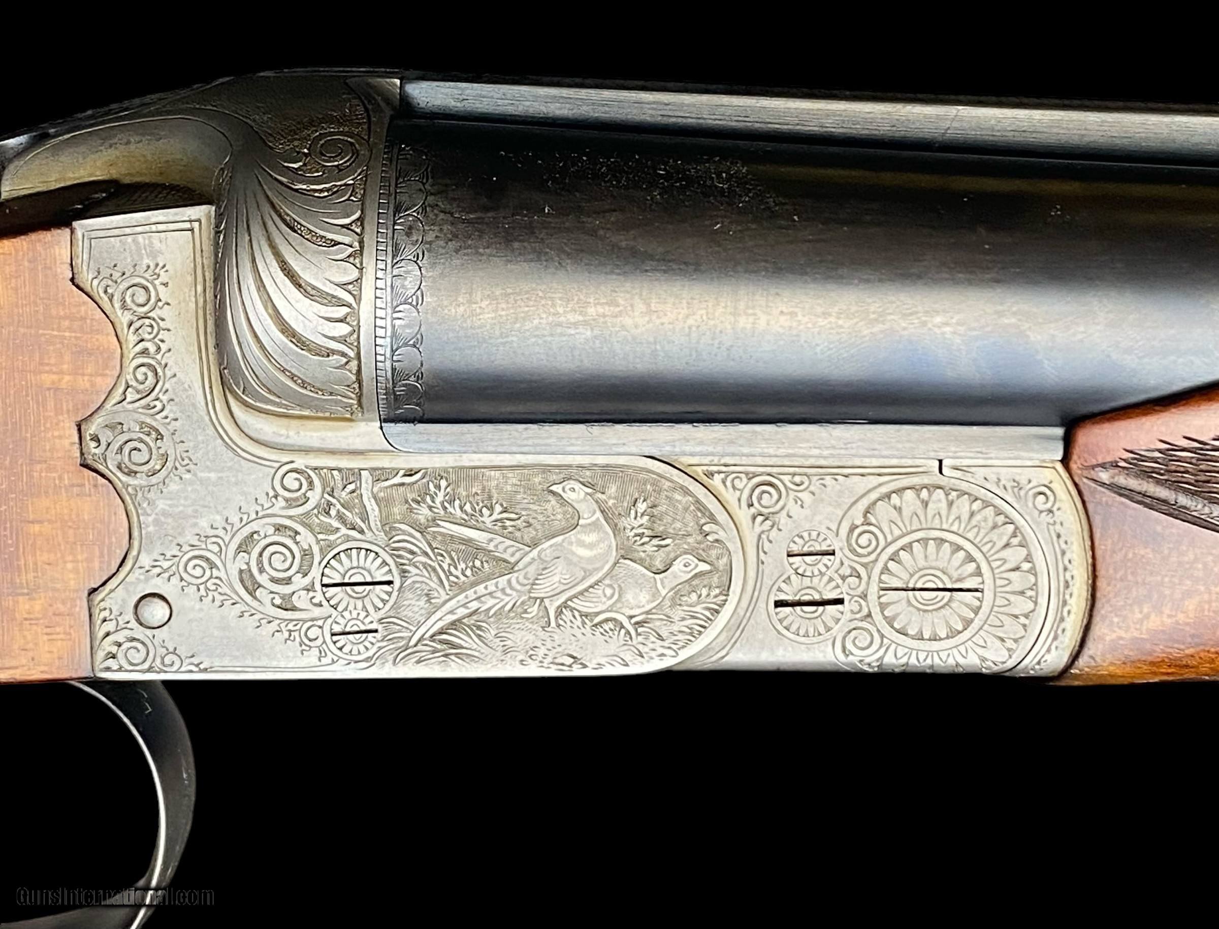 Description: SOLD TO SATISFIED CLIENT -- PLEASE SEE OUR OTHER LISTINGS! LUDWIG BOROVNIK - FERLACH AUSTRIA SN: 40.1337 MADE 1959 SCROLL-BACK BOXLOCK ACTION WITH DOUBLE CROSSBOLTS AND THIRD FASTENER GAME SCENE & SCROLL ENGRAVED FRENCH GREY ACTION 20 GAUGE - 2 3/4" / 70MM CHAMBERS 26" VENT RIB BARRELS CHOKED IC/M. "MADE IN AUSTRIA" ON TOP RIB DOUBLE GOLD TRIGGERS EJECTORS AUTOMATIC SAFETY FANCY EUROPEAN WALNUT CAPPED PISTOL GRIP & CHEEKPIECE STOCK AND BEAVERTAIL FOREND. SOLID BLACK PAD W/ EXTENSION. DIMS: LOP - 14 7/7", DAC: 1 3/8", DAH: 2 9/16". LOP TO WOOD IS 13 1/2" SO WITH STANDARD 1" PAD WOULD BE 14 1/2". CONDITION: GUN IS IN BEAUTIFUL ORIGINAL CONDITION W/ PAD ADDED. BORES CLEAR. EJECTORS STRONG AND IN-TIME. ALL WOOD FINISH REMAINS. NICE GUN! GENTLEMEN, THIS IS A NICE LITTLE UPLAND GAME GUN WITH GOOD DIMENSION AND UPGRADED FEATURES. BOROVNIK IS A RESPECTED FERLACH GUNMAKER. FFL REQUIRED (C&R OKAY) FLAT $50 S/H/I CARD FEE APPLIES SOLD Curio/Relic: Yes Shotgun Gauge: 20 Gauge Manufacturer: BOROVNIK Model: BLE Barrel Length: 26 Chambers: 2.75 OR 70MM Ejectors: YES Condition: EXC Metal Condition: EXC Wood Condition: EXC Bore Condition: EXC Action: BLE Triggers: DOUBLE |