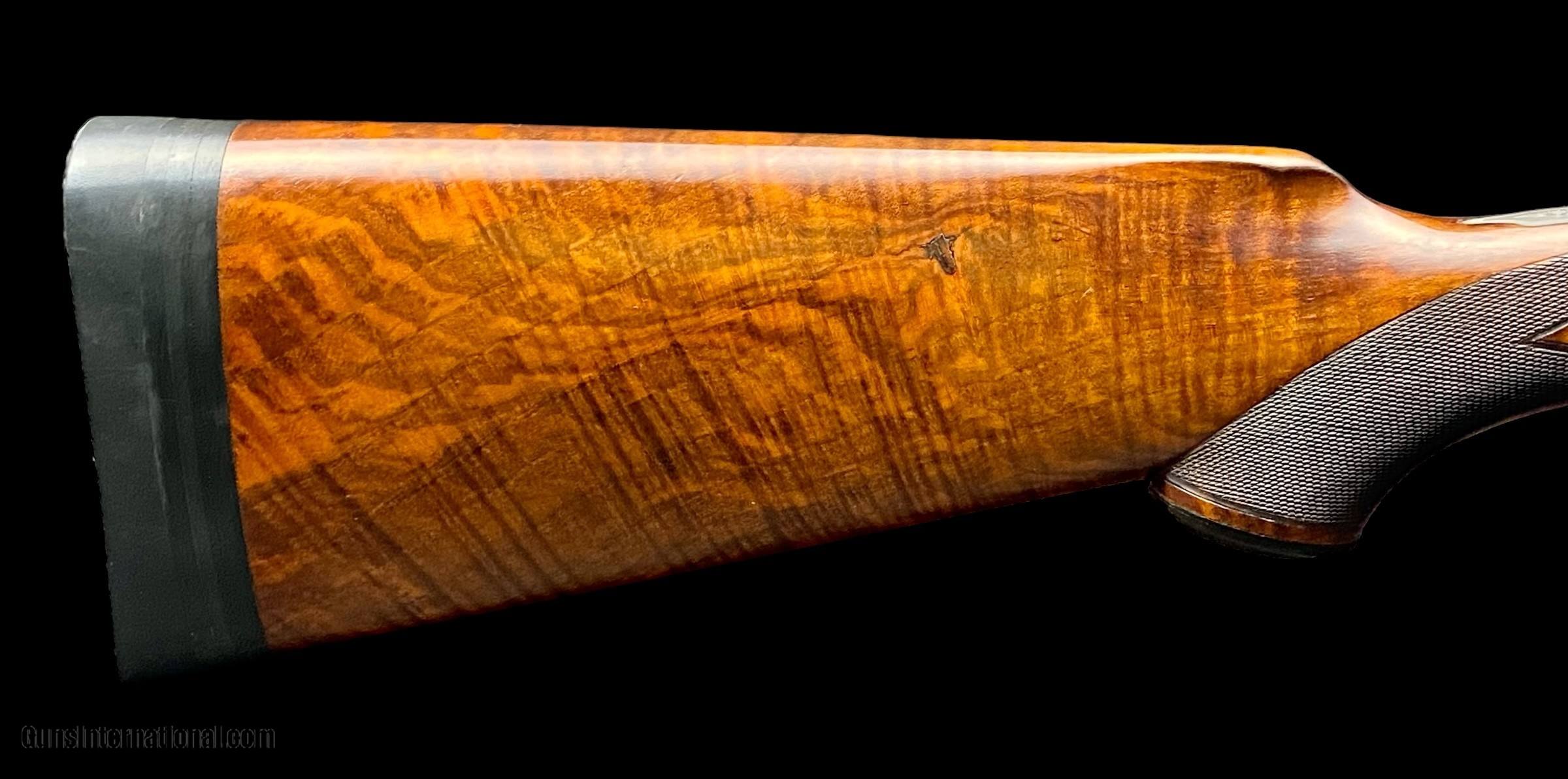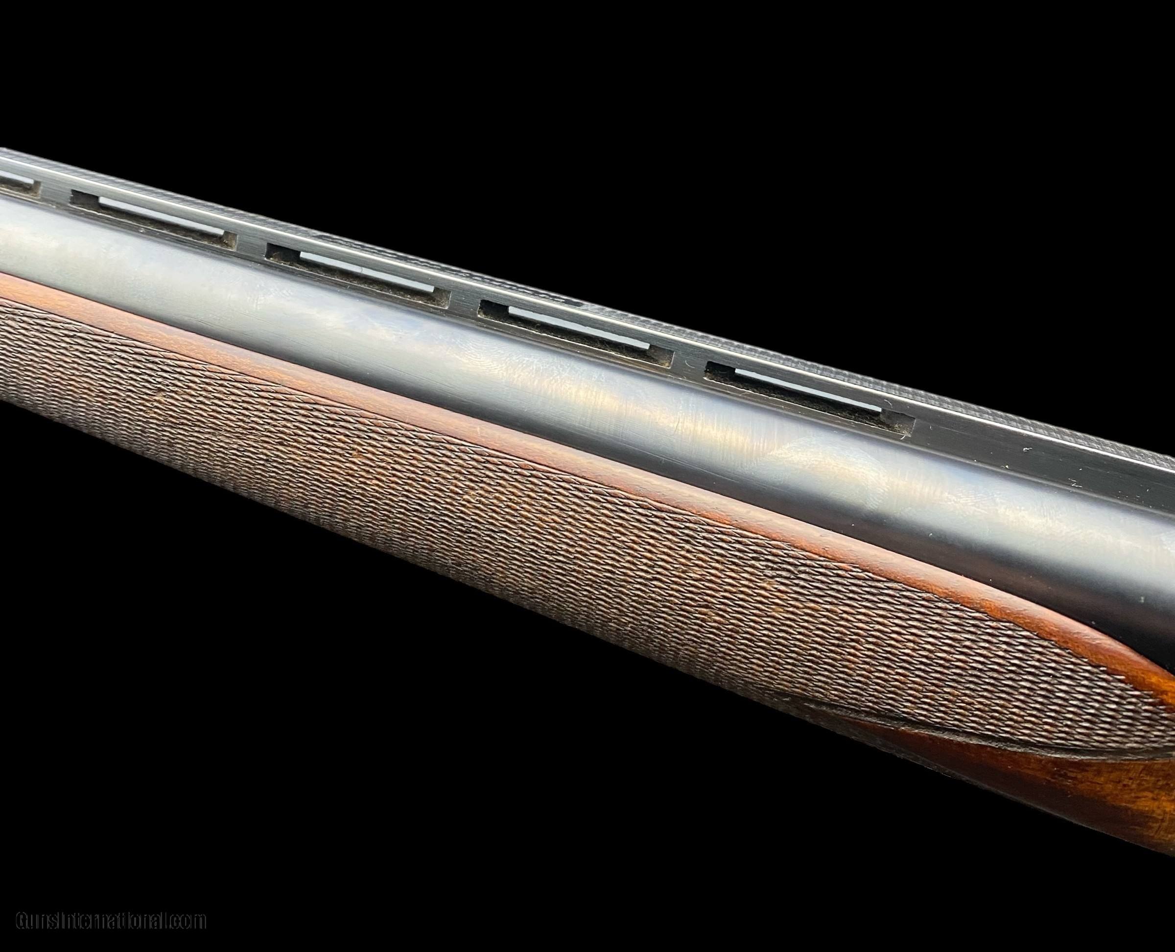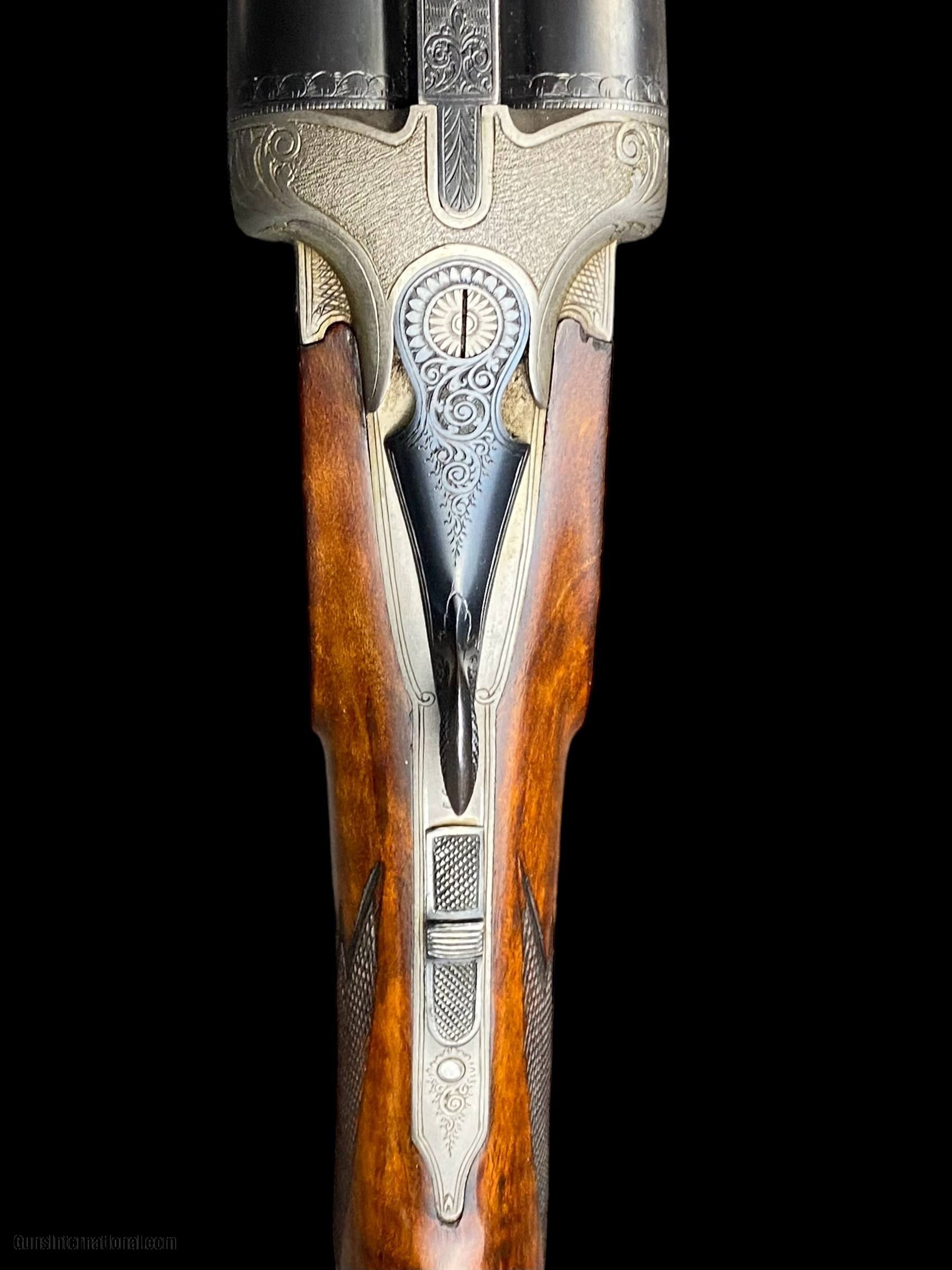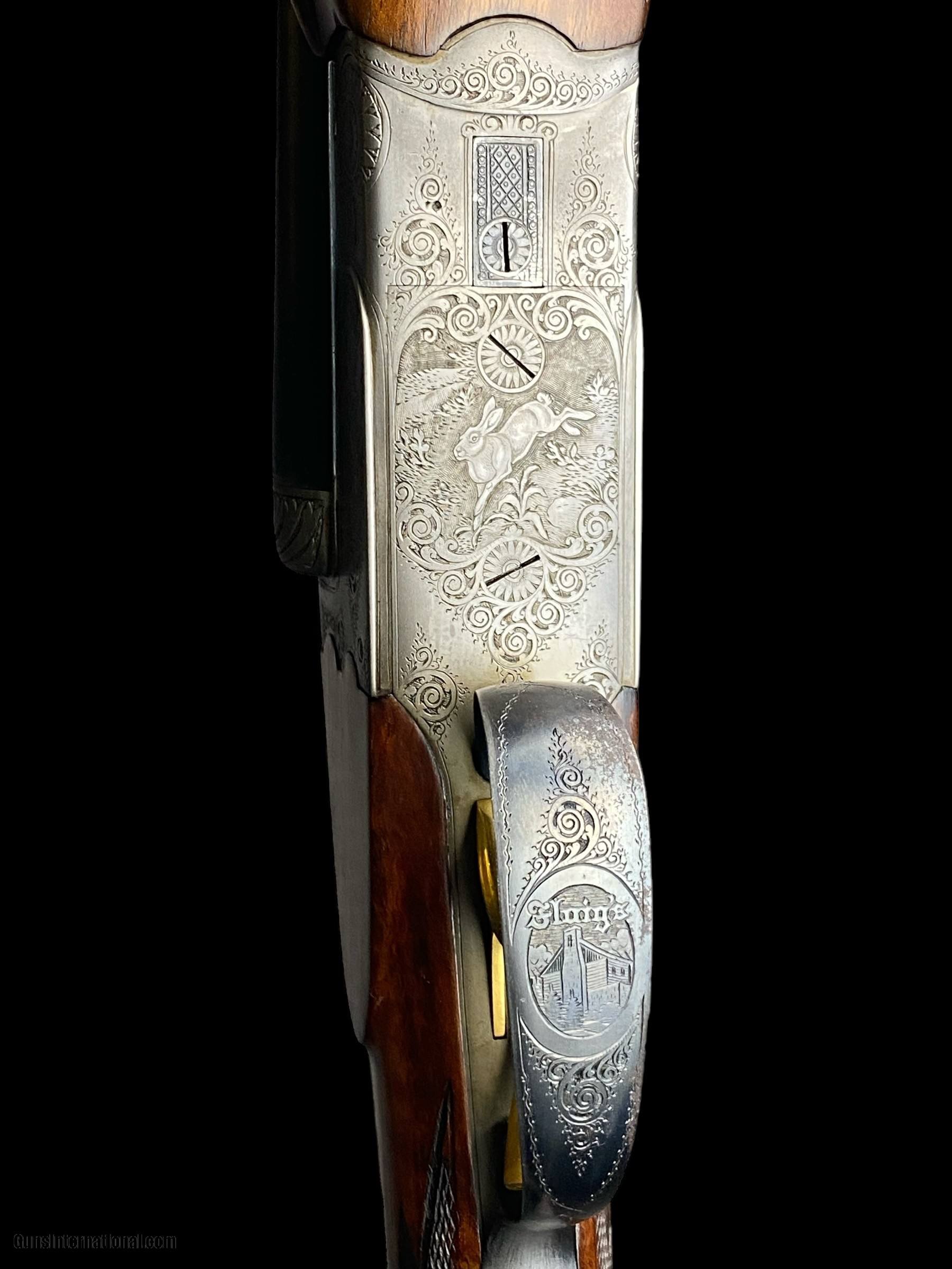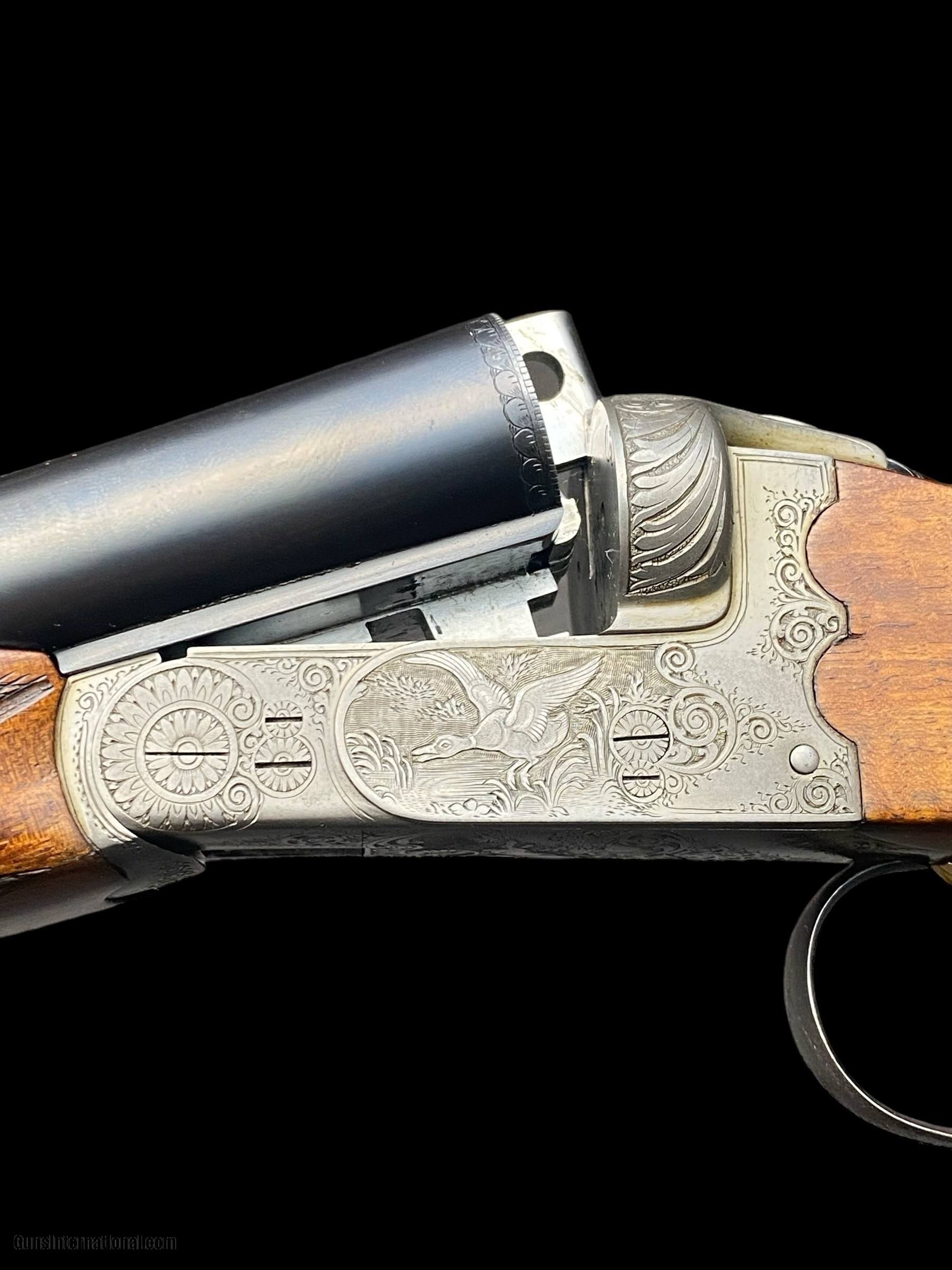 Description: SOLD TO SATISFIED CLIENT -- PLEASE SEE OUR OTHER LISTINGS! LUDWIG BOROVNIK - FERLACH AUSTRIA SN: 40.1337 MADE 1959 SCROLL-BACK BOXLOCK ACTION WITH DOUBLE CROSSBOLTS AND THIRD FASTENER GAME SCENE & SCROLL ENGRAVED FRENCH GREY ACTION 20 GAUGE - 2 3/4" / 70MM CHAMBERS 26" VENT RIB BARRELS CHOKED IC/M. "MADE IN AUSTRIA" ON TOP RIB DOUBLE GOLD TRIGGERS EJECTORS AUTOMATIC SAFETY FANCY EUROPEAN WALNUT CAPPED PISTOL GRIP & CHEEKPIECE STOCK AND BEAVERTAIL FOREND. SOLID BLACK PAD W/ EXTENSION. DIMS: LOP - 14 7/7", DAC: 1 3/8", DAH: 2 9/16". LOP TO WOOD IS 13 1/2" SO WITH STANDARD 1" PAD WOULD BE 14 1/2". CONDITION: GUN IS IN BEAUTIFUL ORIGINAL CONDITION W/ PAD ADDED. BORES CLEAR. EJECTORS STRONG AND IN-TIME. ALL WOOD FINISH REMAINS. NICE GUN! GENTLEMEN, THIS IS A NICE LITTLE UPLAND GAME GUN WITH GOOD DIMENSION AND UPGRADED FEATURES. BOROVNIK IS A RESPECTED FERLACH GUNMAKER. FFL REQUIRED (C&R OKAY) FLAT $50 S/H/I CARD FEE APPLIES SOLD Curio/Relic: Yes Shotgun Gauge: 20 Gauge Manufacturer: BOROVNIK Model: BLE Barrel Length: 26 Chambers: 2.75 OR 70MM Ejectors: YES Condition: EXC Metal Condition: EXC Wood Condition: EXC Bore Condition: EXC Action: BLE Triggers: DOUBLE |