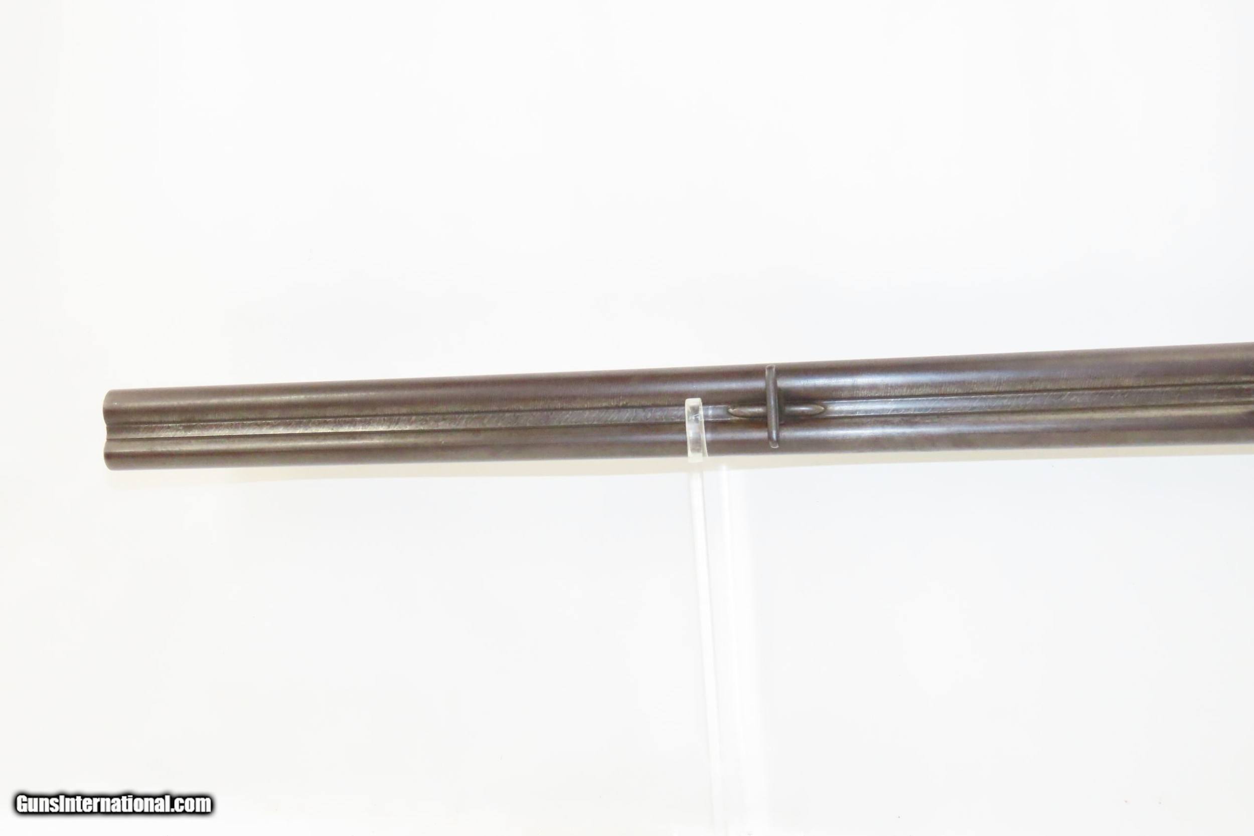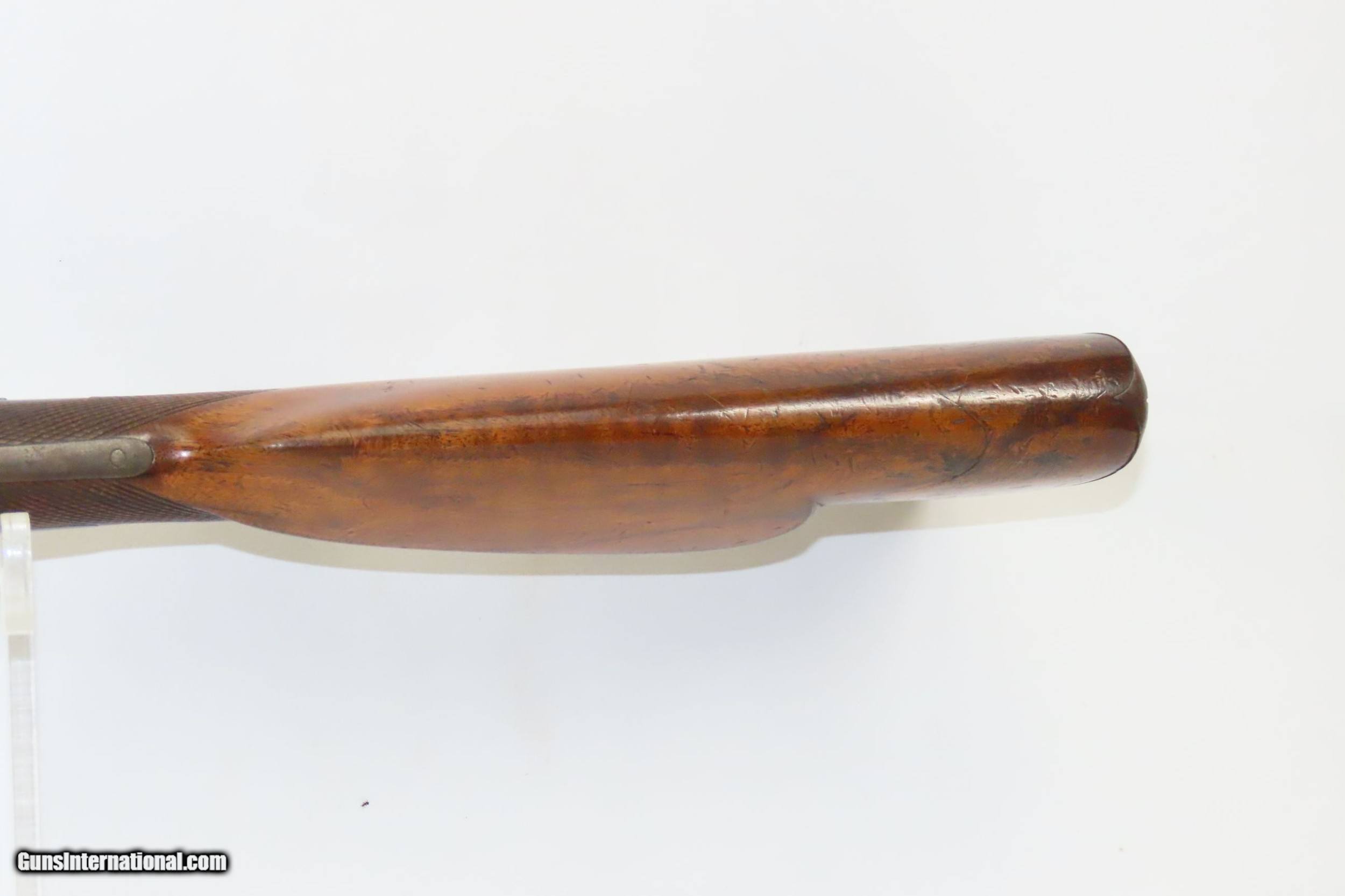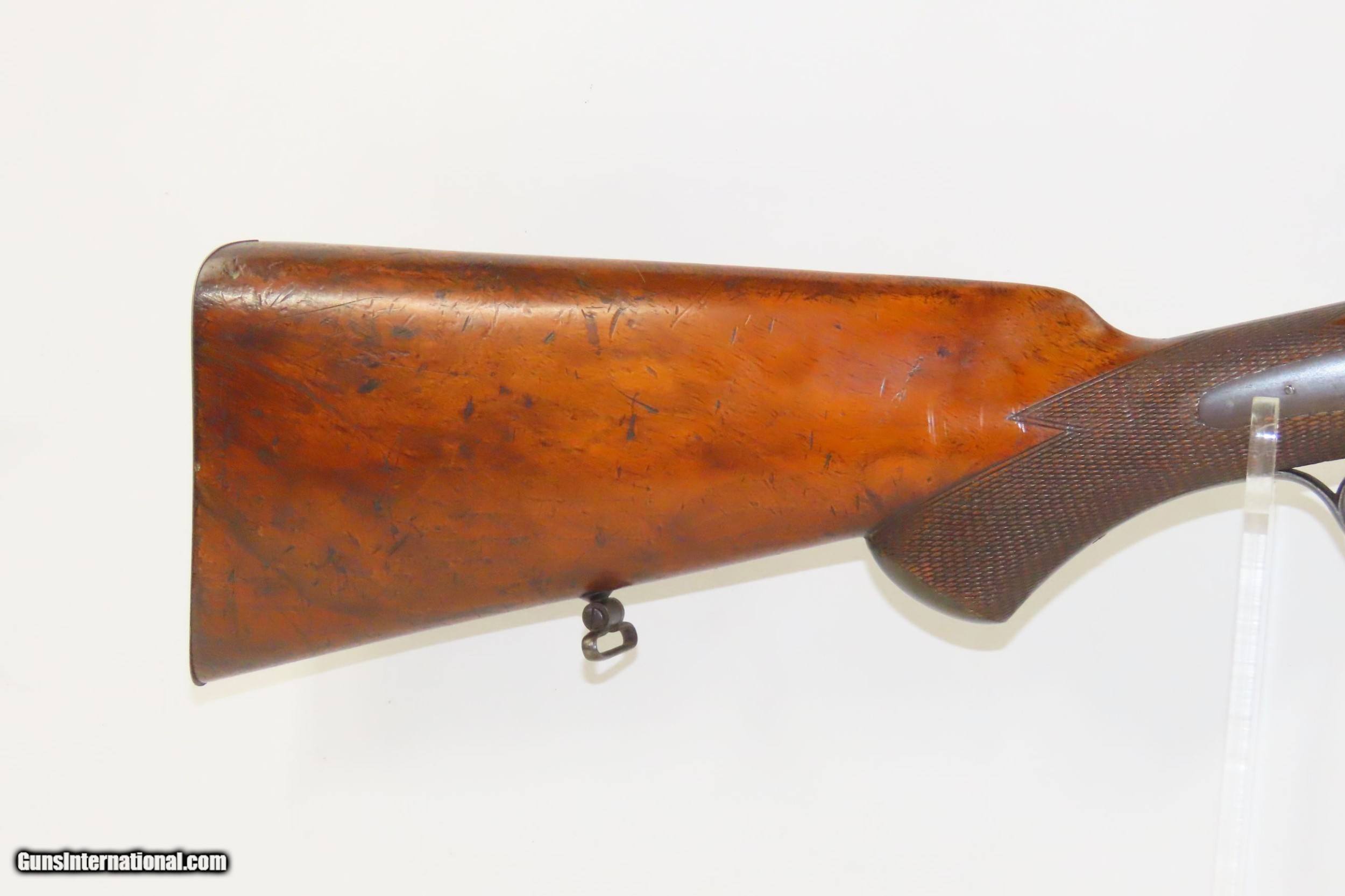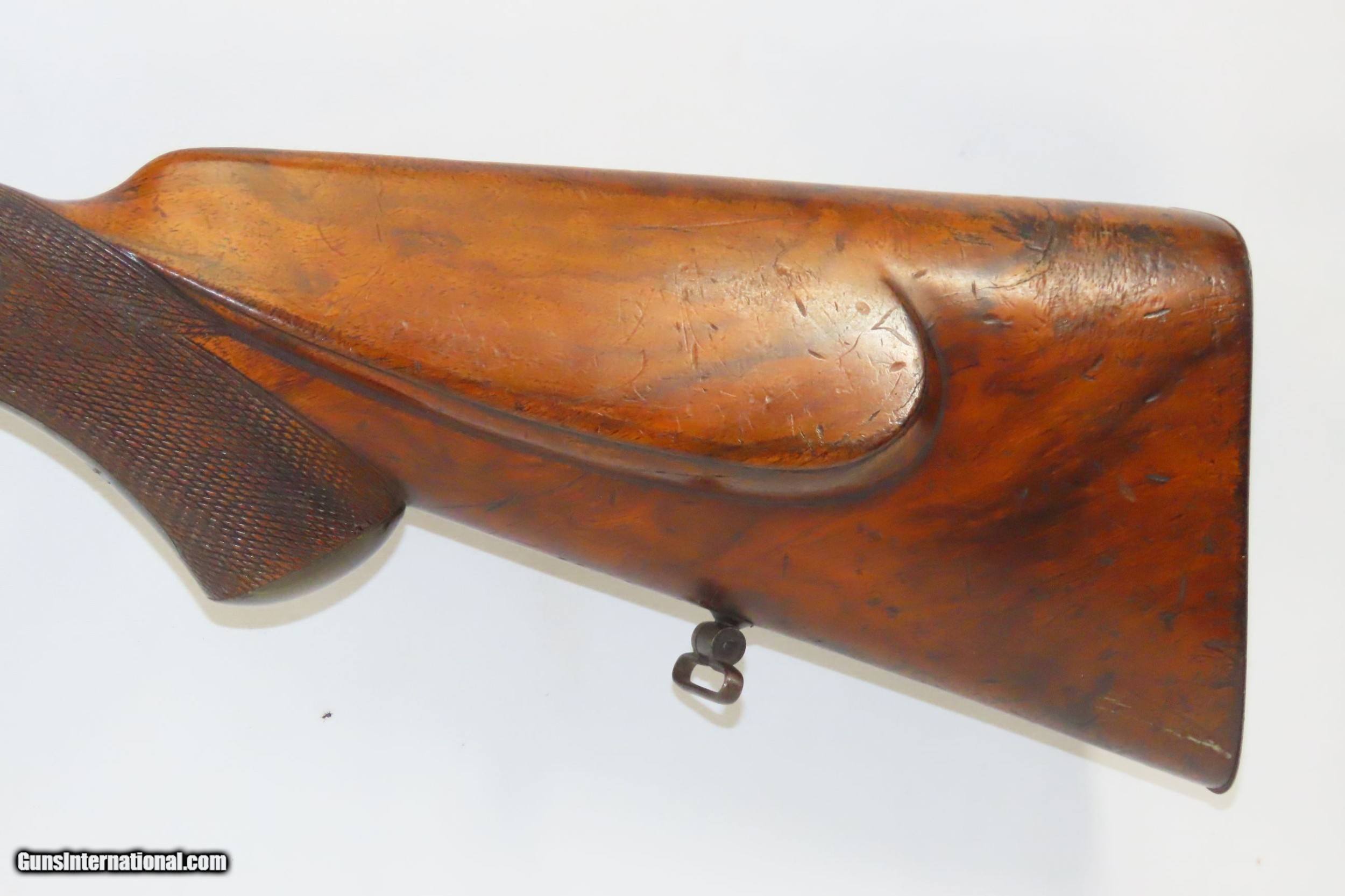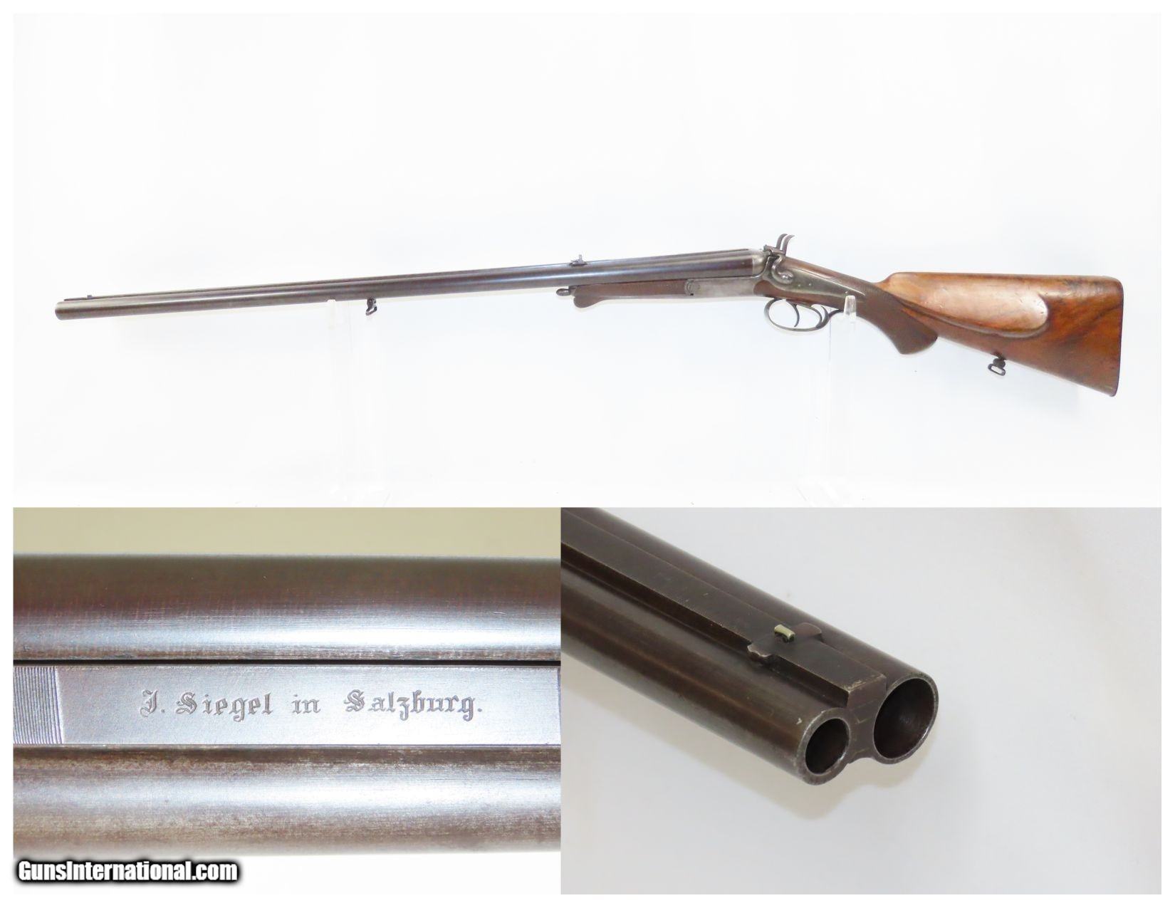 Description: SALZBURG, AUSTRIAN Antique Josef SIEGEL 16 Gauge Combination Rifle/Shotgun Effectively Hunt Fowl or Four Legs with One Firearm! Here we present an antique Josef Siegel Side by Side Combination Rifle & Shotgun in 11x60mm Mauser and 16 Gauge, manufactured circa the late 1880s in Salzburg, Austria. The hunter would use the rifled barrel to fire precise shots against large game and the smooth side could be loaded with a large ball or slug for a quick follow up shot or the smooth bore could be loaded with shot to make it feasible to hunt fowl at the same time without carrying multiple guns. This gun has two hammers and two triggers to allow either barrel to be fired as needed. This double gun is clearly a quality piece. It locks up tight and the actions are crisp. Back action locks. The rifle’s trigger is a single set trigger that can be engaged by pushing it forward to provide an even crisper, lighter trigger pull. The shotgun barrel is Damascus twist while the rifle is fluid steel. There is a front sight mounted in between the barrels on the rib. The rear sight is an express type with a solid first leaf and a flip up second leaf for extended ranges for the rifle. There are sling swivels mounted under the barrel and the butt stock. The stock is hand-checkered and the pistol grip is capped in horn. Steel butt plate and trigger guard. The left side of the butt stock has a generous cheek rest. Under-frame lever swivels to tip the barrels down, exposing the breech for loading and unloading. Extractor. The overall condition is near fine. Original finish. Damascene pattern well-preserved. The actions are excellent. The bores are bright and in great shape for age. The stock shows use and remains solid. Imagine hunting the Alps around Salzburg with this! Own the original! This is a legitimate antique and not a reproduction. Barrels are 27-5/8 inches. Caliber: 11x60mm Mauser Rifle (.43 Mauser) 16 Gauge Smoothbore Shotgun Shotgun Chamber: 2-1/2 inch Shotgun Choke: Improved Modified LOP: 13-3/8 inches Overall condition as seen in photos. Very Fast. Very Safe. FREE SHIPPING WORLDWIDE. Delivered directly to your door by express mail! Guaranteed AUTHENTIC & Includes CERTIFICATE OF AUTHENTICITY. ancestryguns $2675 #217830 SOLD Curio/Relic: Yes |