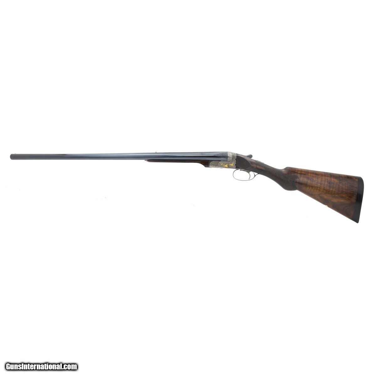 Description: " Very fine, three barrel set, Belgian made side by side owned by Robert Ingalls, of the Ingalls Iron works. (Ingalls made ships for the US navy in the late 1930's - 1970's.) Under sides of barrels are marked 2 1/2, but all three barrels have been opened to 2 3/4"" and are choked modified. Two sets of barrels are 28"" and the third is 26"". Single trigger with barrel selector. Receiver is finely scroll engraved with gold inlayed game scenes. Stocks are nicely figured walnut with elegant checkering. Length of pull is 13 1/8"" with ebony butt plate. A high quality handsome three barrel set! SOLD Curio/Relic: Yes |