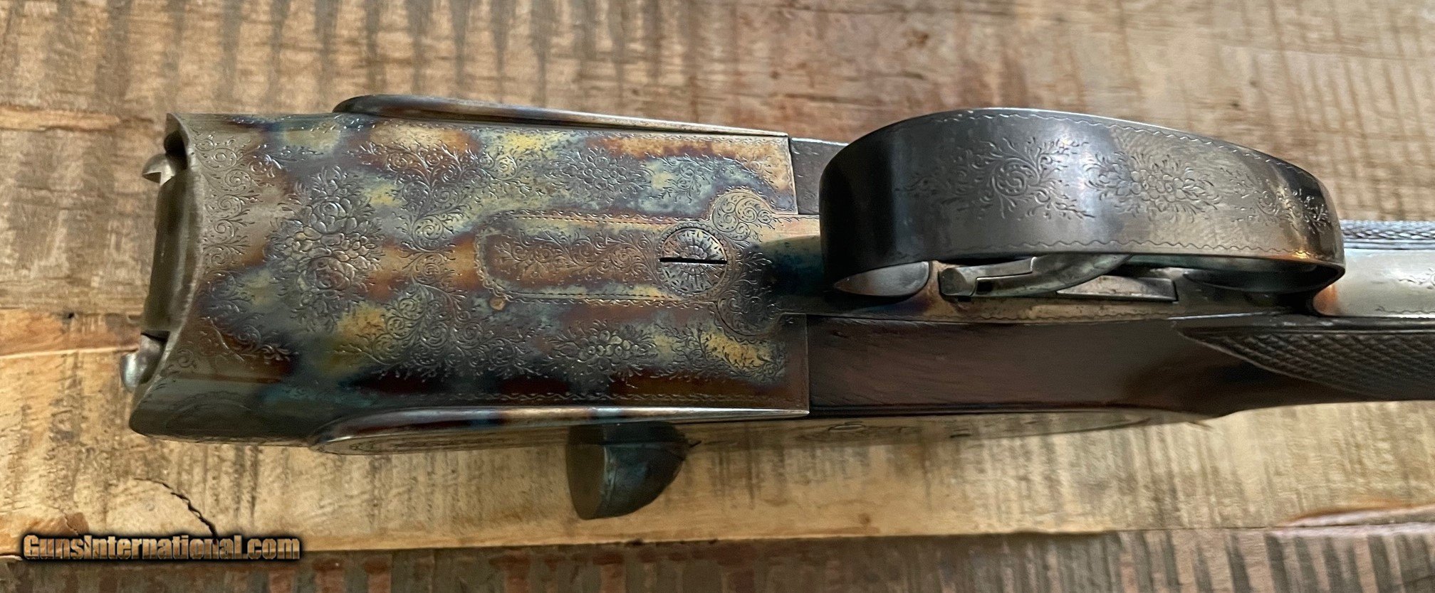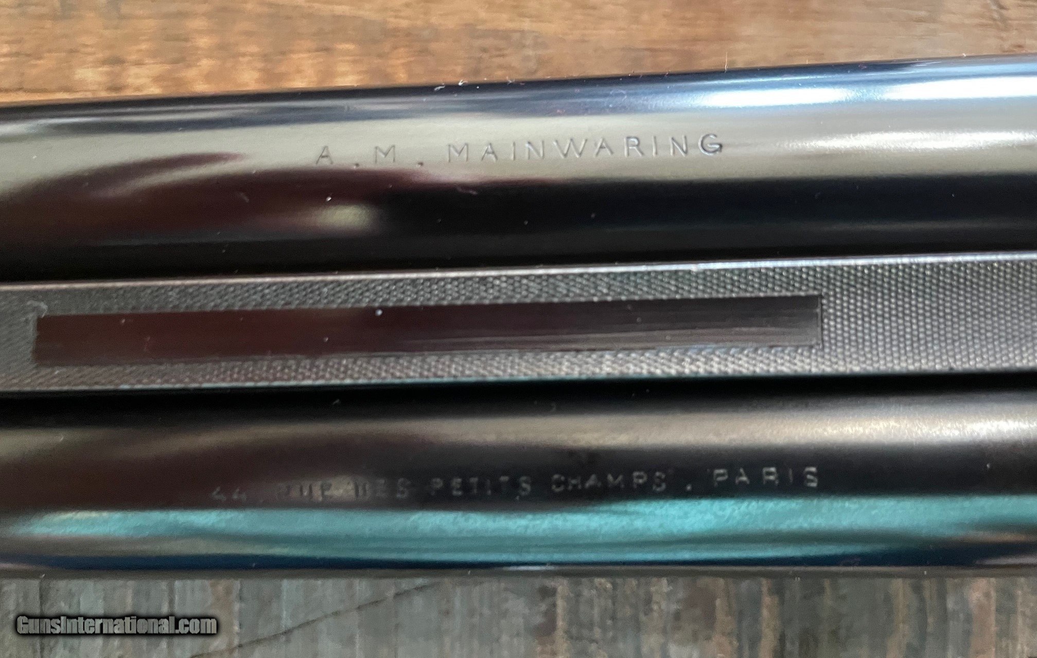 Description: (Reduced) Selling an AM Mainwaring SxS Sidelock shotgun in 12-gauge. This gun was made for AM Mainwaring, Paris, in the Belgium trade. The very little information I could locate dates this gun to the 1920s. I have found other examples of guns made by Thonon in Belgium that match up to the hallmarks of this gun so I believe they may have been the maker. I don't have any history on this gun but it is either one that has been extensively cared for and seldom if ever shot or it was professionally refurbished to close to new condition. Everything about this gun that I've looked over and tested is in excellent working condition. The barrels are flawless to my eye inside and out. The action locks tight without any wiggle with the forearm removed. Case colors are just about 100%. Bluing on the trigger guard is a little thin but not silvery. Really nicely engraved with oak leaves on the fences. Look at the pic of the breech of the action - I don't see any wear to indicate the gun has been fired much if at all. The case is made to perfectly fit this gun. The case came from Bryant in London which is a very hard to find item in itself. Bryant made cases for Abercrombie & Fitch and other high end retailers. The case is in excellent condition which helps indicate the gun was mostly put away and seldomly taken out, case and all. The original rosewood cleaning rod and 4 ebony and brass turnscrews are included, along with an Abercrombie & Fitch oil bottle. I believe this gun was made to shoot pigeons or trap due to the high dimensions and long LOP. The barrels are tightly choked at IM and F per my brass gauge. You will appreciate the workmanship and condition of this gun much more in person - it's impossible to capture it in pictures. Will be shipped from my FFL to yours. Open to reasonable offers. SOLD Shotgun Gauge: 12 Gauge Manufacturer: Mainwaring Serial Number: 422 Barrel Length: 27-5/8 Chambers: 2-1/2 Ejectors: yes Condition: excellent Stock Comb: 1-1/4 Stock Heel: 1-3/4 Stock Cast: cast off (RH) LOP: 15-1/4 Weight: 6 lbs. 15 oz. Manufacture Date: 1920s Choke Left: Imp Modified Choke Right: Full Case: Bryant leather |