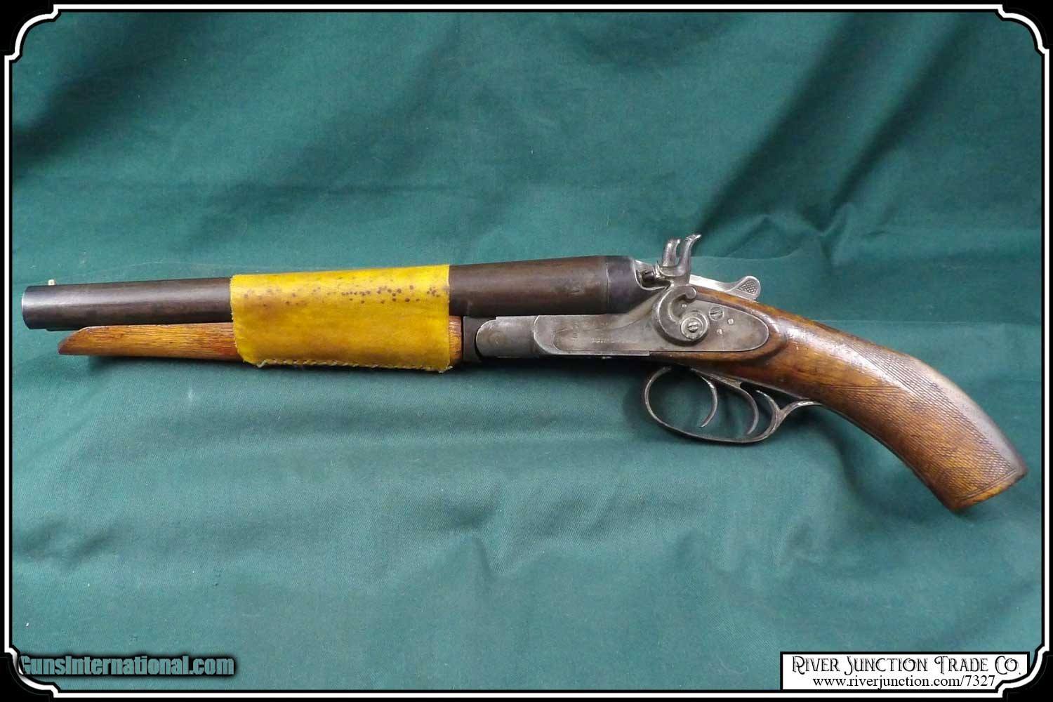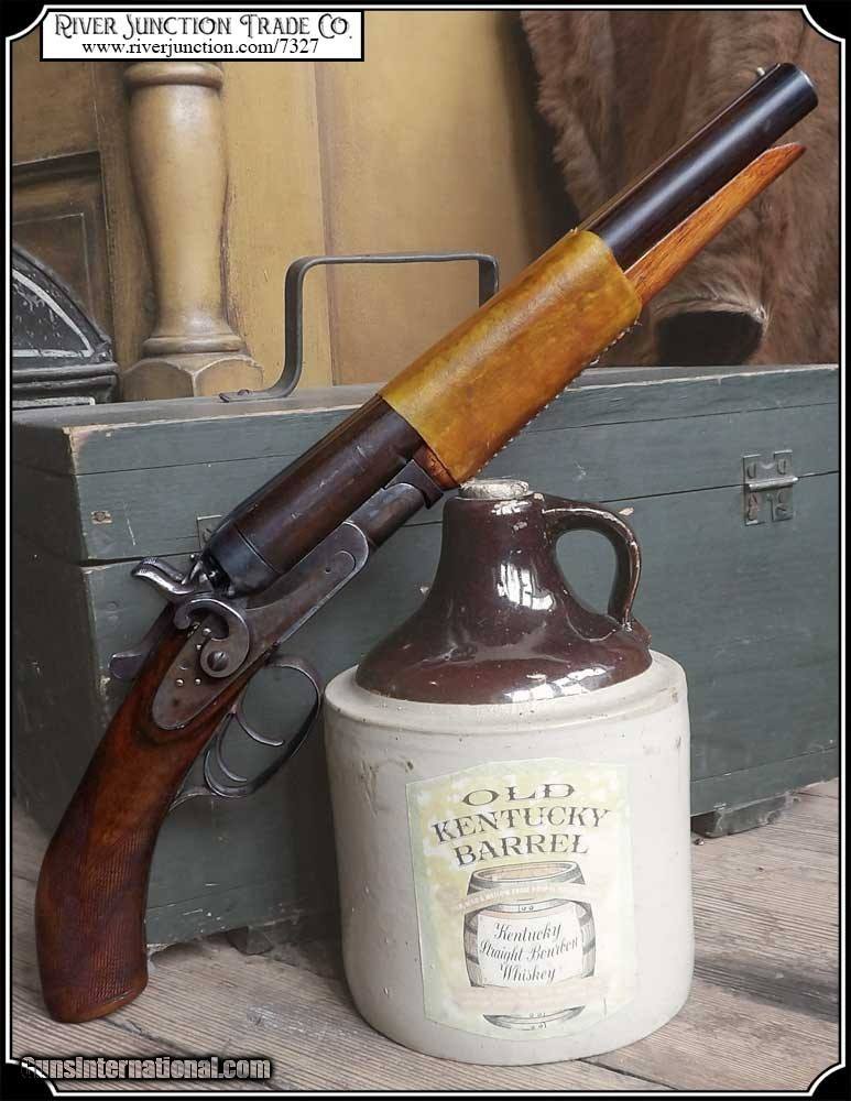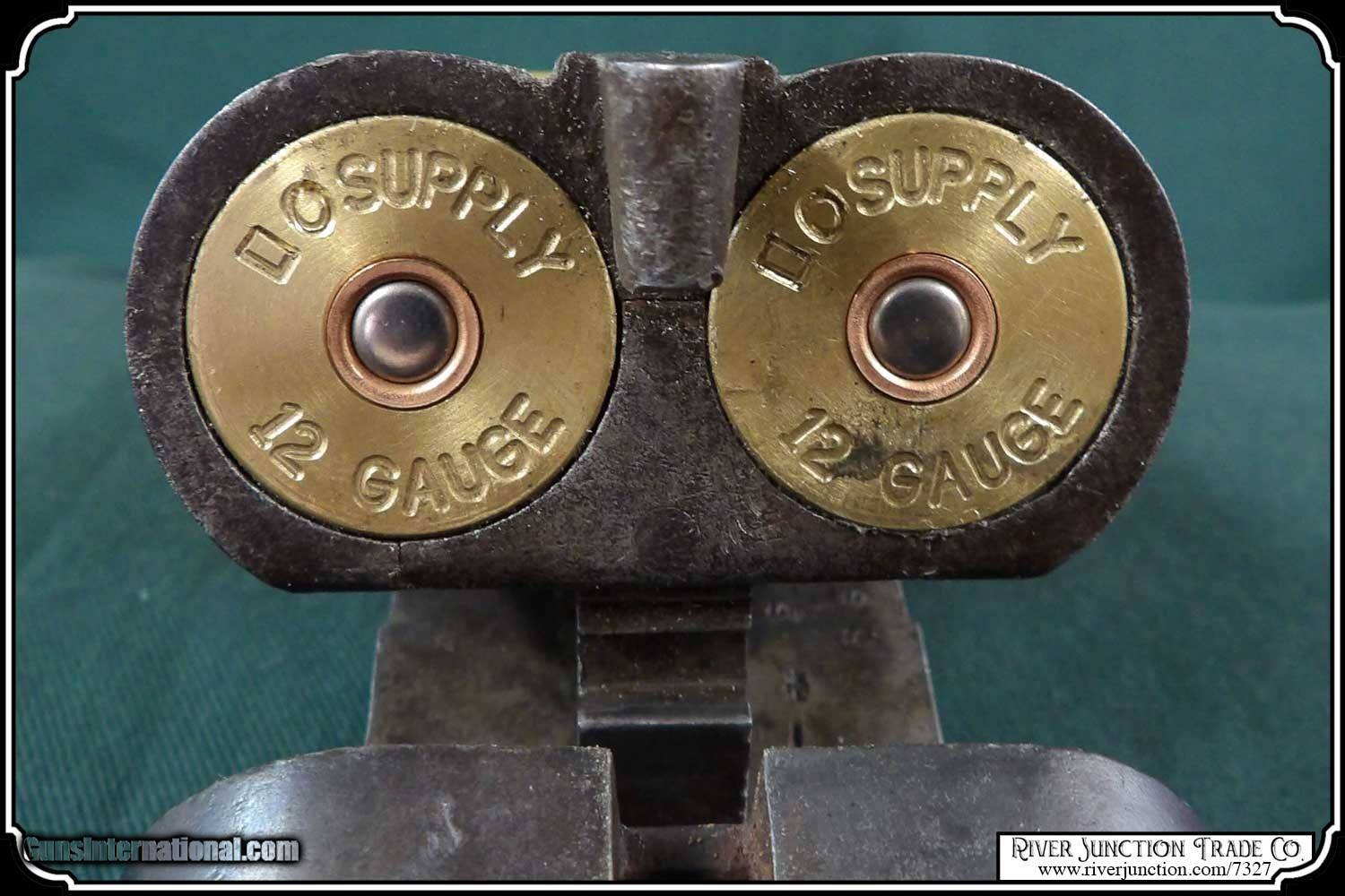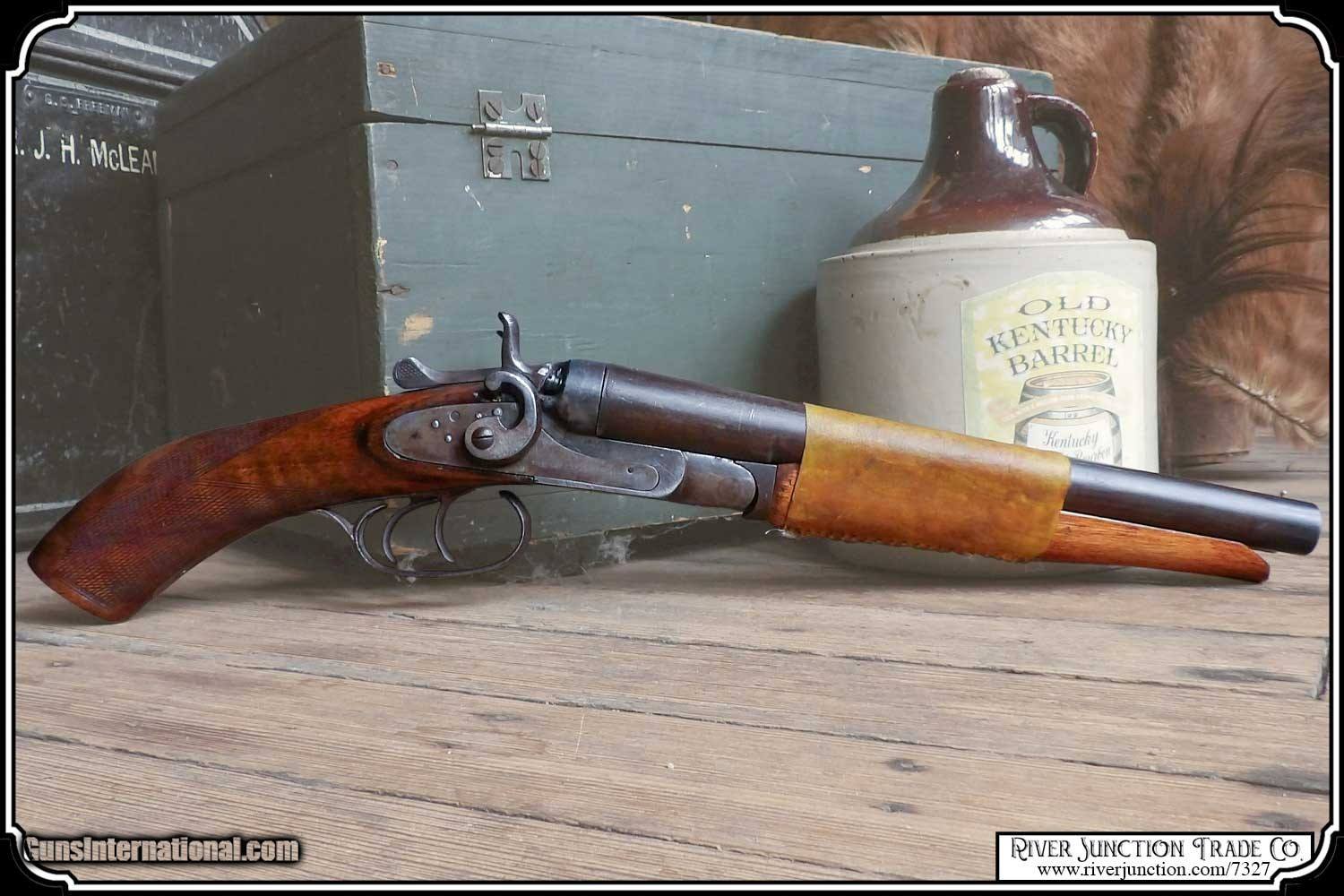 Description: Gangsters such as the BLACK HAND in Chicago and the COWBOYS in Tombstone. This is a Side-by-side double barreled shotgun with twist steel barrels, and overall length of 20 inches. Both exposed hammers function perfectly. This gun was made from 1883 to 1894. Condition, is very good. Barrels are cut to 11 inches. It has a tight lockup. All metal parts have a nice even brown patina. They were liked for their ability to easily hide under a coat. Yes, it is legal to own! It has been deactivated as a cartridge shotgun. It is now a MUZZLE LOADING CONVERSION. That means it has no legal length restrictions. Perfect for a re-enactor, for blank loads or just fun shooting. Uses the 209 shotgun primer. This is a BLACKPOWDER ONLY gun. DO NOT USE SMOKELESS POWDER. Or just use the primer as a blank for performance. This would be ideal as a vintage display with collectable vehicles of the era. The action lock up is as tight. The stock has no cracks, breaks or chips, and the stock is strong and stable. Weighs just about 6 lbs. The loading components shown are not included. This is a muzzle loader and can be shipped directly to you in the USA and INTERNATIONALLY. Adult signature required. Sold as an Antique ~ no guarantees, warranties, or liabilities for any actual usage. LAYAWAY PROGRAM We qualify some of our items as eligible for our LAYAWAY PROGRAM. We accept Bank Check, Money order, Personal checks, Credit Card or PayPal. Items over $1000.00 can layaway at 1/3 down and 1/3 in 30 days and balance in the following 30 days. No discount is offered on layaway items. We are open to offers at any other time. Price: $1,095.00 Buy Now Contact Seller |