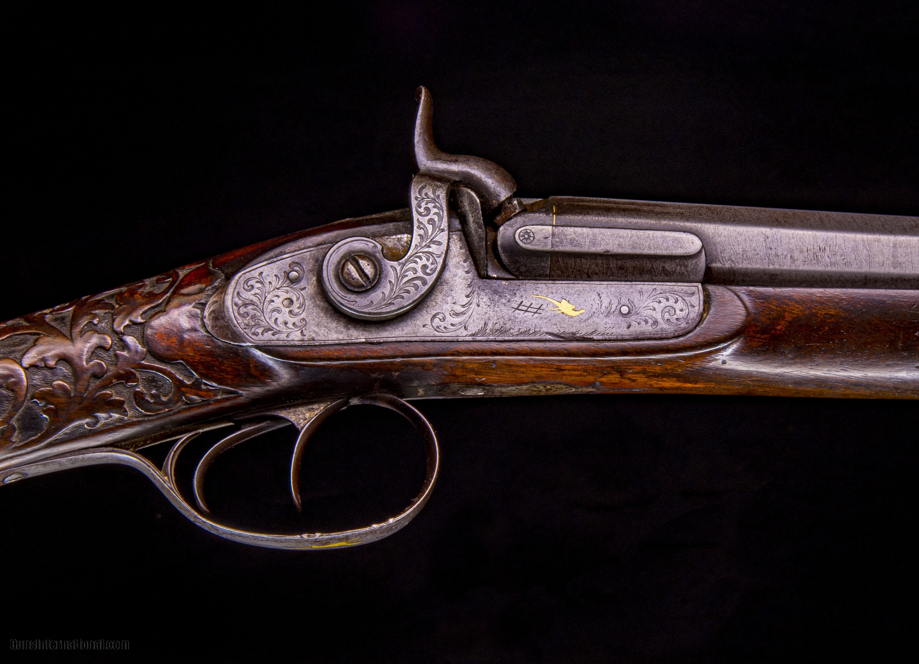 The wood carving is excellent. *** Note: To see this gun with high resolution photos and a zoom-in feature, go to the vintagedoubles main site and search for the gun ID: 5564 or browse the main site to see our full gun collection.
