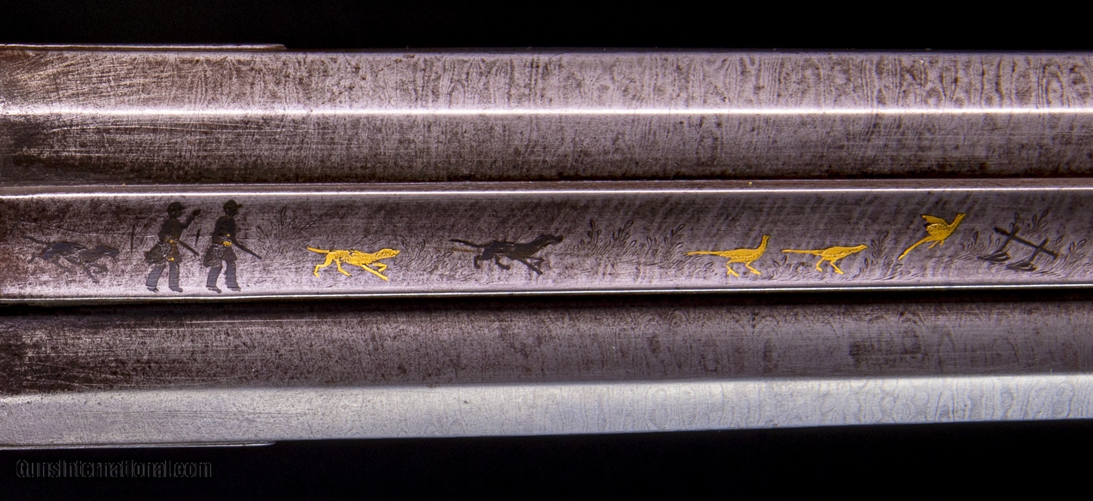 The barrel has this great little scene of two hunters with dogs chasing gold birds that is rather endearing.