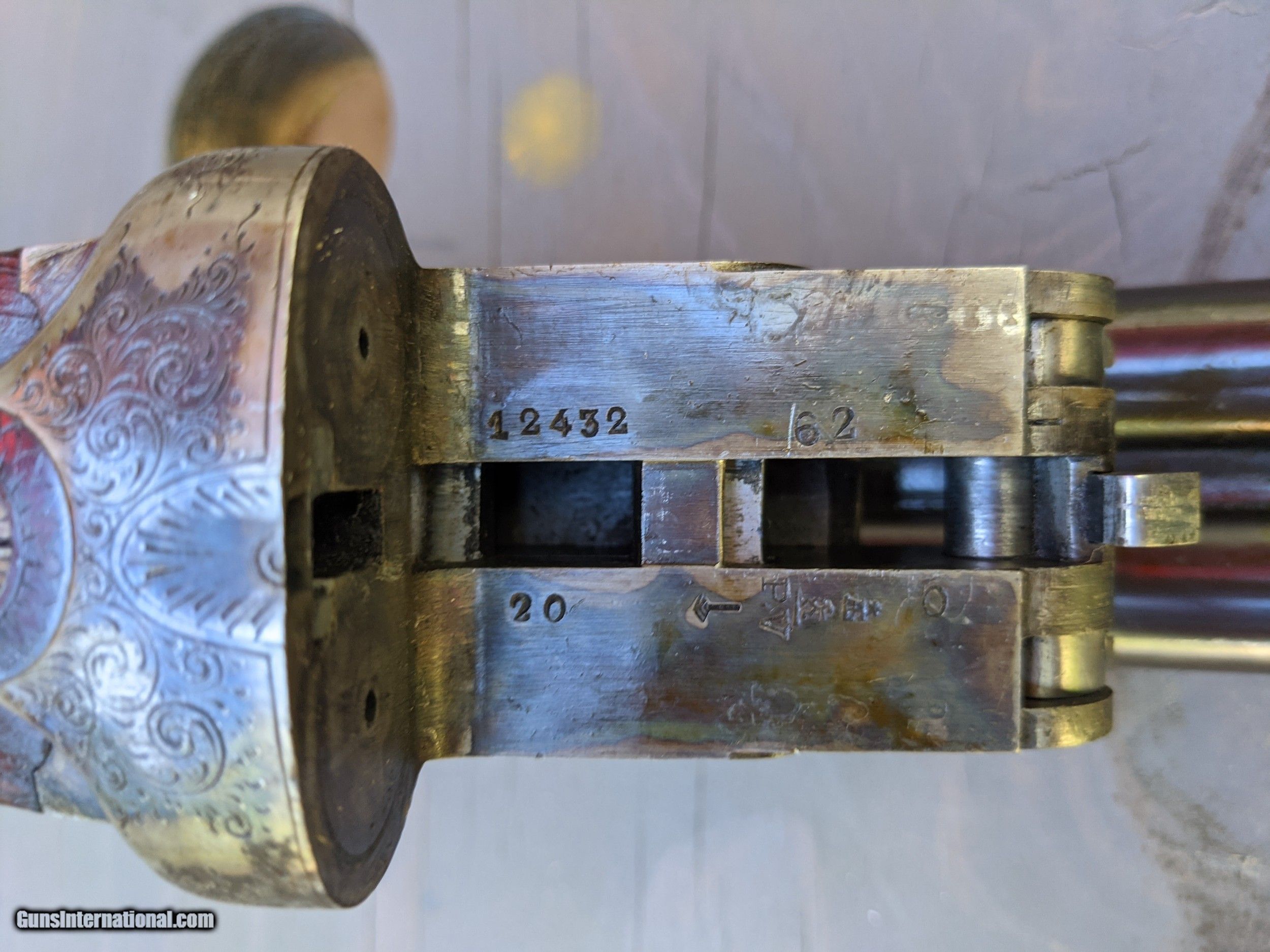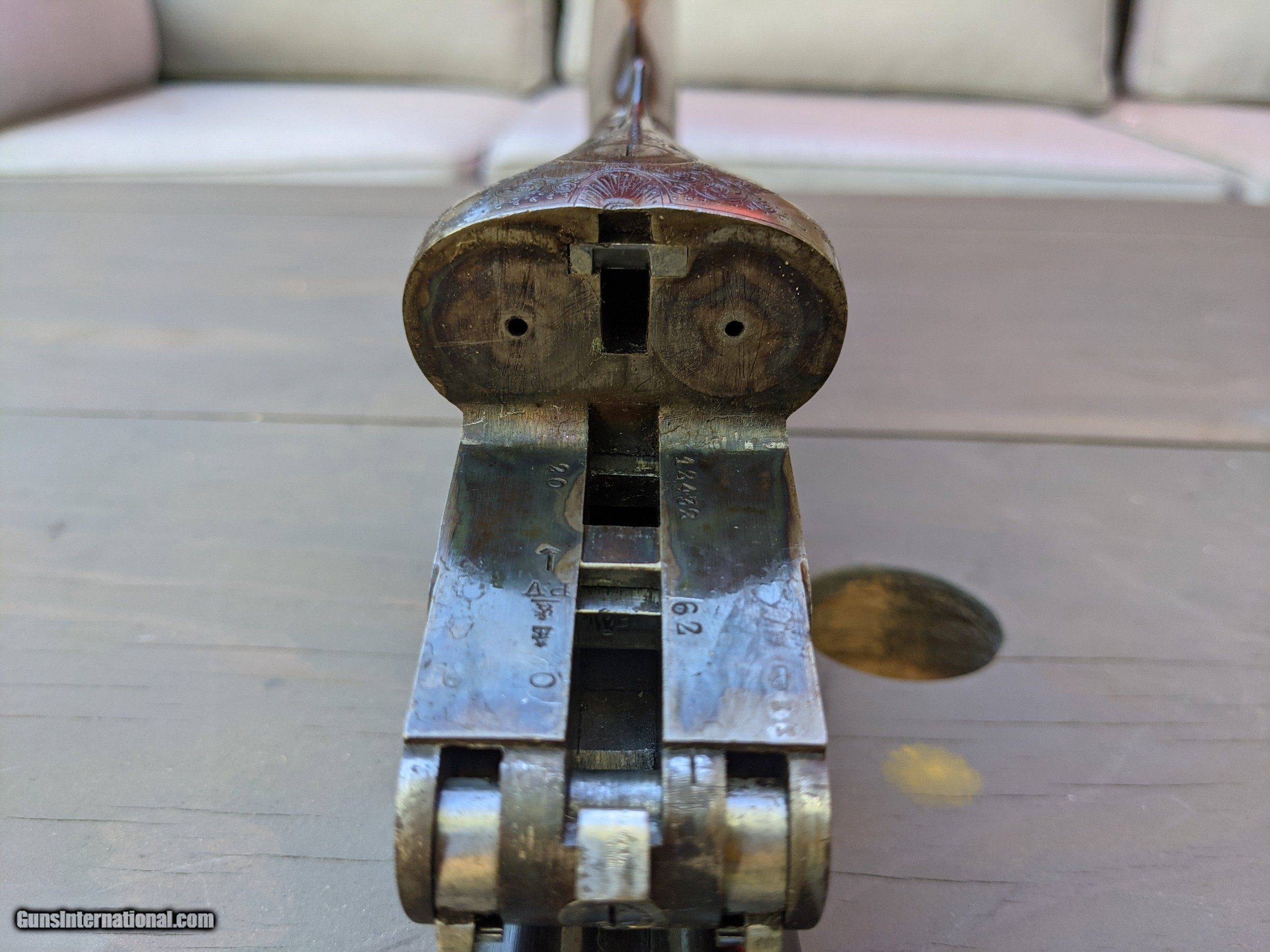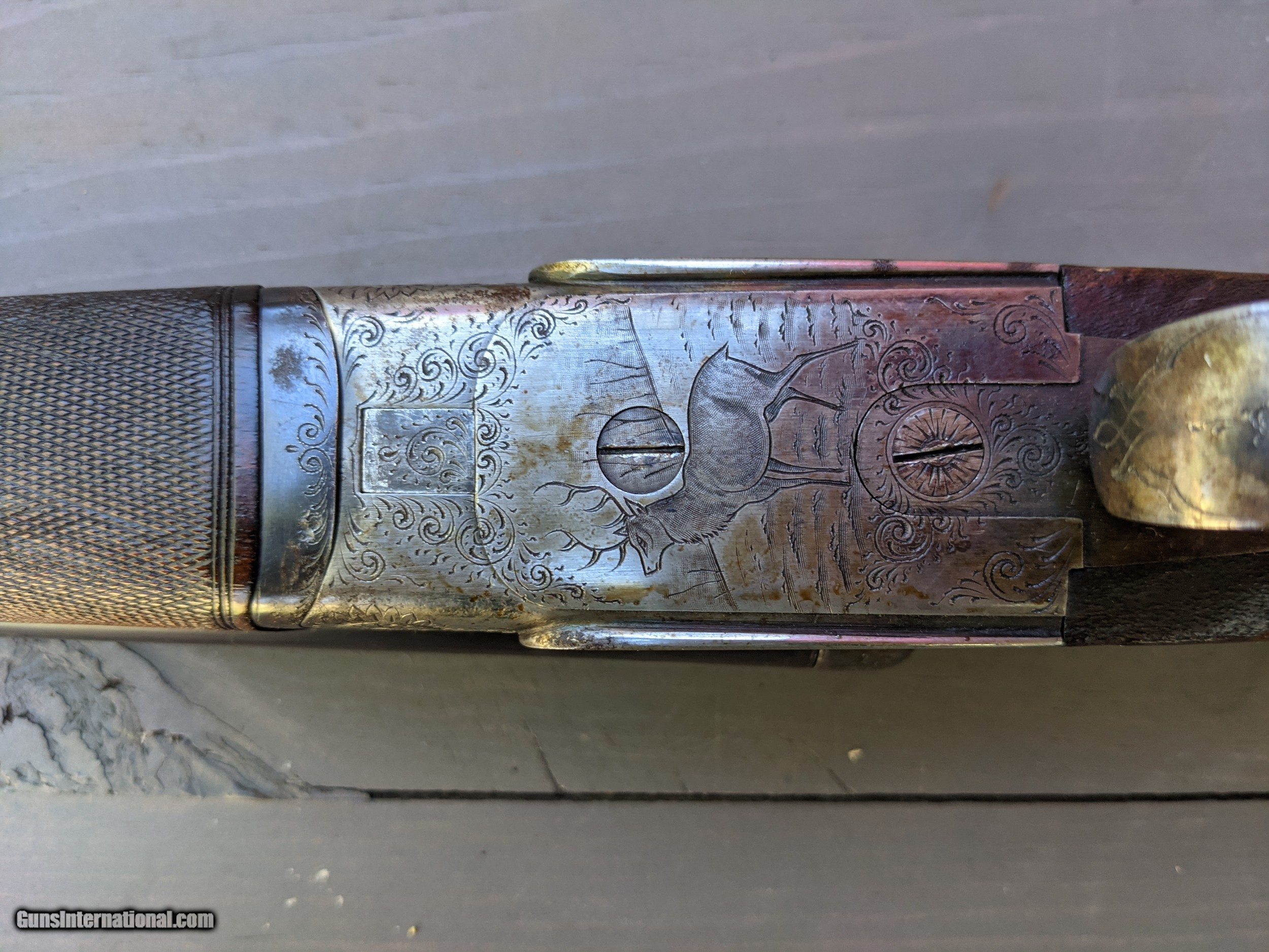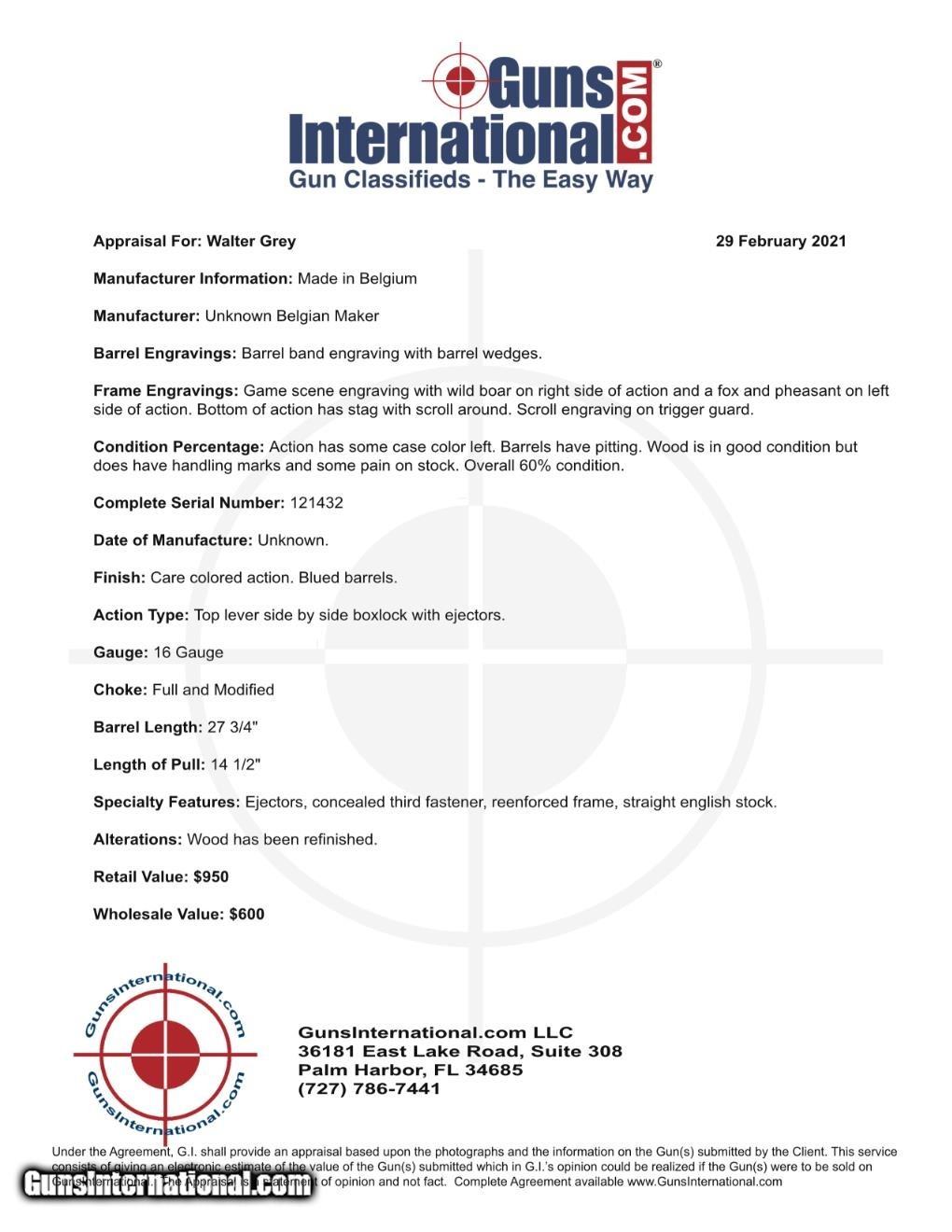 Description: Belgium Made, 16 Guage, Top Lever Side by Side Boxlock with Ejectors. Choke: Full and Modified Finish: Care Colored Action, Blued Barrels Barrel Engravings: Barrel band engraving with barrel wedges. Frame Engravings: Game scene engraving with wild boar on the right side of action and a fox and pheasant on the left side of action. The bottom of the action has stags with scrollwork around the bottom. scroll engraving on the trigger guard. Condition Percentage: action has some case color left. barrels have pitting. Wood is in good condition, but it does have handling marks and some pain on the stock. Overall 60% condition. Specialty Features: Ejectors, concealed third fastener, reinforced frame, straight English stock. Alterations: wood has been refinished. SOLD Shotgun Gauge: 16 Gauge Manufacturer: Unknown Belgium Maker (Guild) Model: Top Lever Side by Side Boxlock Serial Number: 121432 Condition: Good Metal Condition: Good, some pitting Wood Condition: Medium, Wood has been refinished Bore Condition: Good Finish: Blued Chokes: Full and Modified Engraving: Game scenes Item Location: CA |
