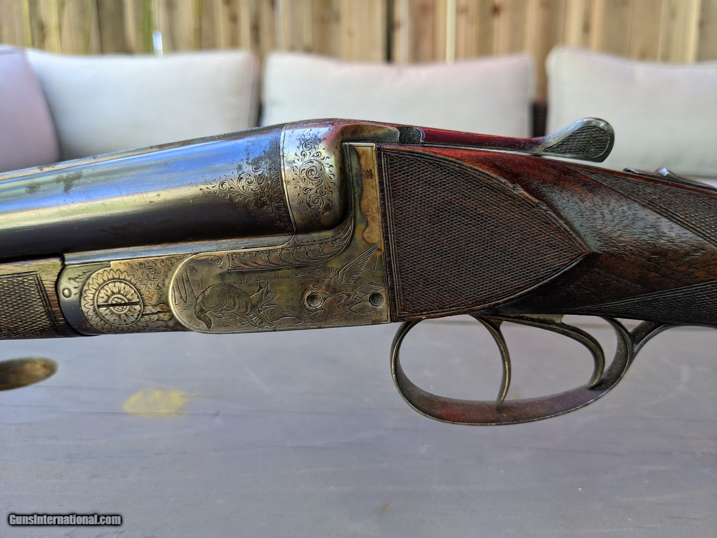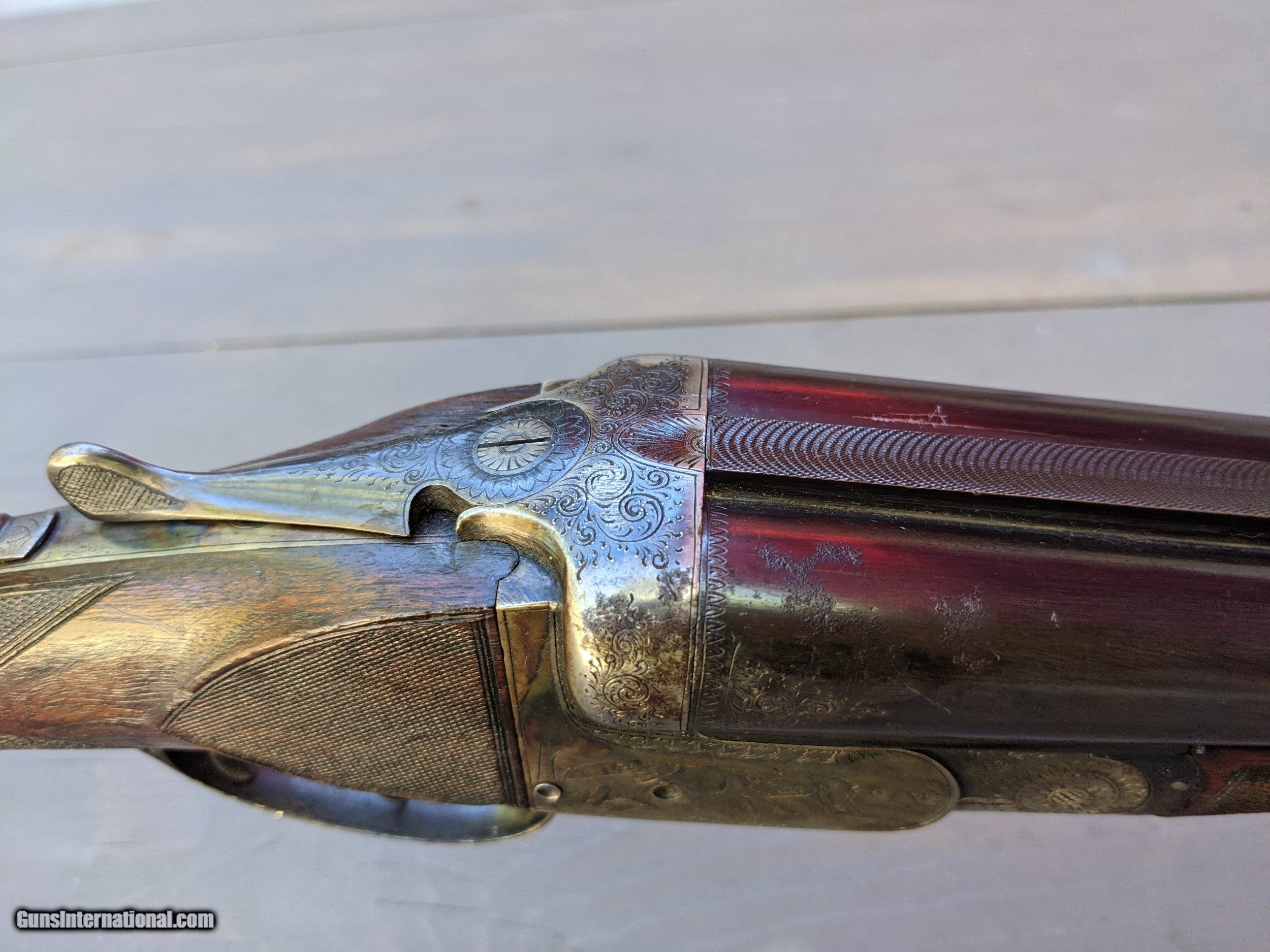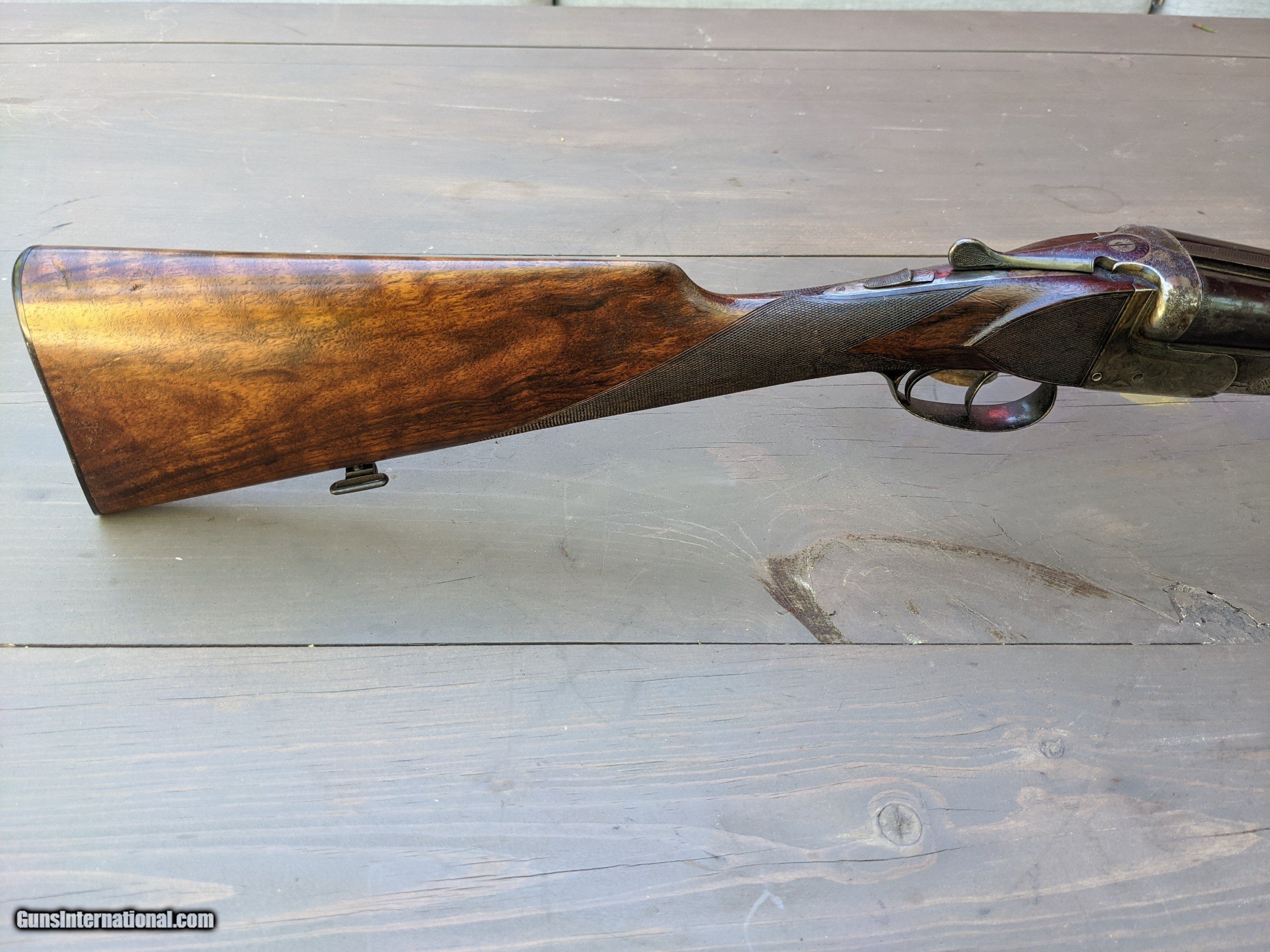 Description: Belgium Made, 16 Guage, Top Lever Side by Side Boxlock with Ejectors. Choke: Full and Modified Finish: Care Colored Action, Blued Barrels Barrel Engravings: Barrel band engraving with barrel wedges. Frame Engravings: Game scene engraving with wild boar on the right side of action and a fox and pheasant on the left side of action. The bottom of the action has stags with scrollwork around the bottom. scroll engraving on the trigger guard. Condition Percentage: action has some case color left. barrels have pitting. Wood is in good condition, but it does have handling marks and some pain on the stock. Overall 60% condition. Specialty Features: Ejectors, concealed third fastener, reinforced frame, straight English stock. Alterations: wood has been refinished. SOLD Shotgun Gauge: 16 Gauge Manufacturer: Unknown Belgium Maker (Guild) Model: Top Lever Side by Side Boxlock Serial Number: 121432 Condition: Good Metal Condition: Good, some pitting Wood Condition: Medium, Wood has been refinished Bore Condition: Good Finish: Blued Chokes: Full and Modified Engraving: Game scenes Item Location: CA |