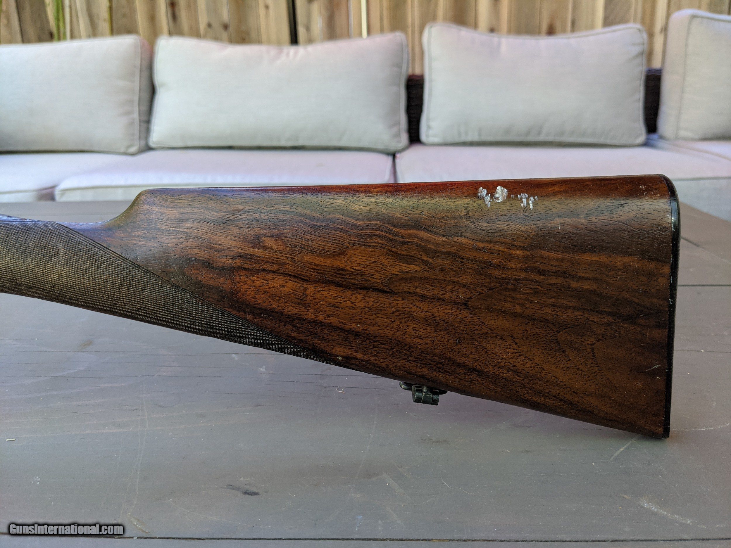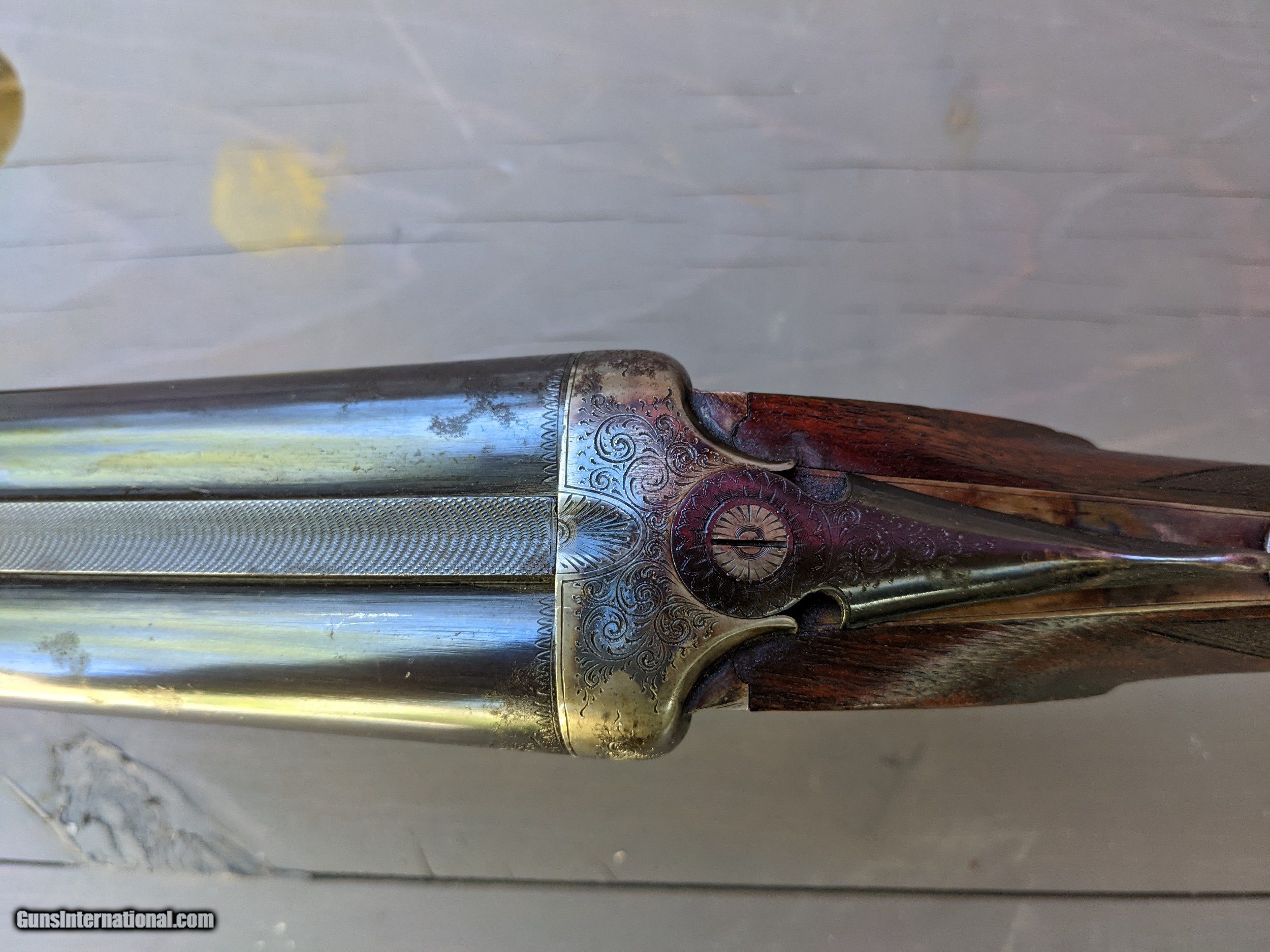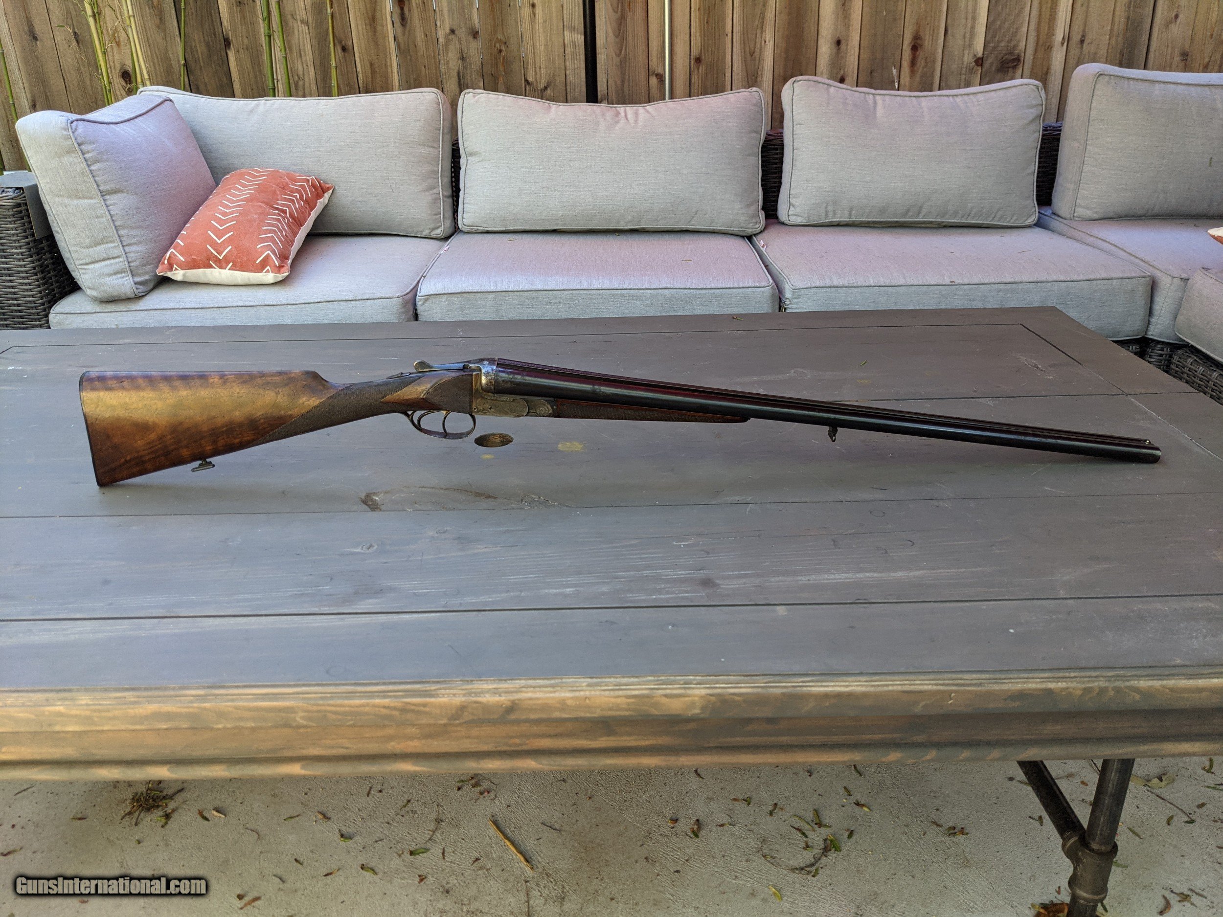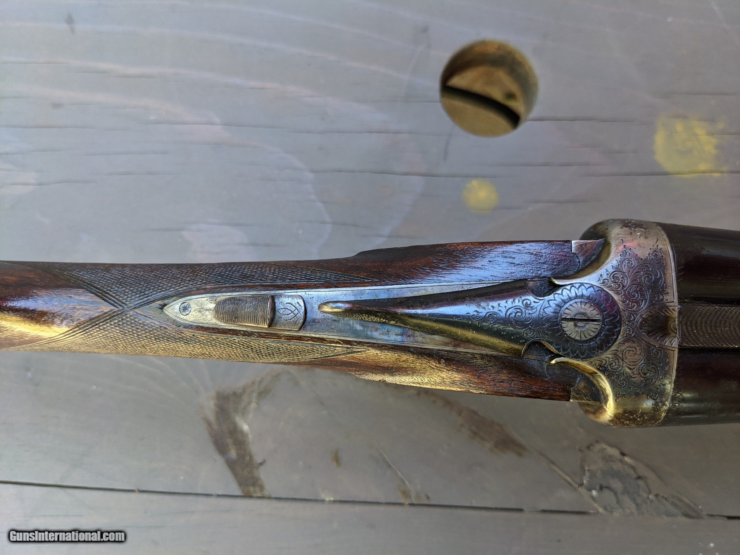 Description: Belgium Made, 16 Guage, Top Lever Side by Side Boxlock with Ejectors. Choke: Full and Modified Finish: Care Colored Action, Blued Barrels Barrel Engravings: Barrel band engraving with barrel wedges. Frame Engravings: Game scene engraving with wild boar on the right side of action and a fox and pheasant on the left side of action. The bottom of the action has stags with scrollwork around the bottom. scroll engraving on the trigger guard. Condition Percentage: action has some case color left. barrels have pitting. Wood is in good condition, but it does have handling marks and some pain on the stock. Overall 60% condition. Specialty Features: Ejectors, concealed third fastener, reinforced frame, straight English stock. Alterations: wood has been refinished. SOLD Shotgun Gauge: 16 Gauge Manufacturer: Unknown Belgium Maker (Guild) Model: Top Lever Side by Side Boxlock Serial Number: 121432 Condition: Good Metal Condition: Good, some pitting Wood Condition: Medium, Wood has been refinished Bore Condition: Good Finish: Blued Chokes: Full and Modified Engraving: Game scenes Item Location: CA |