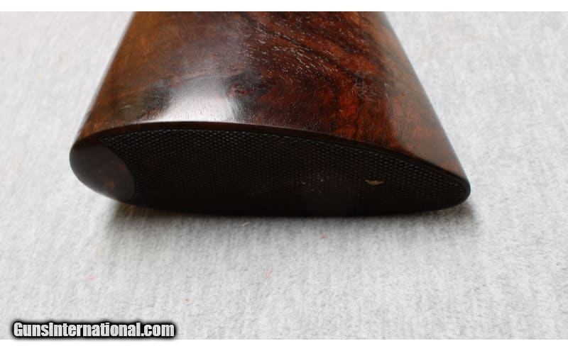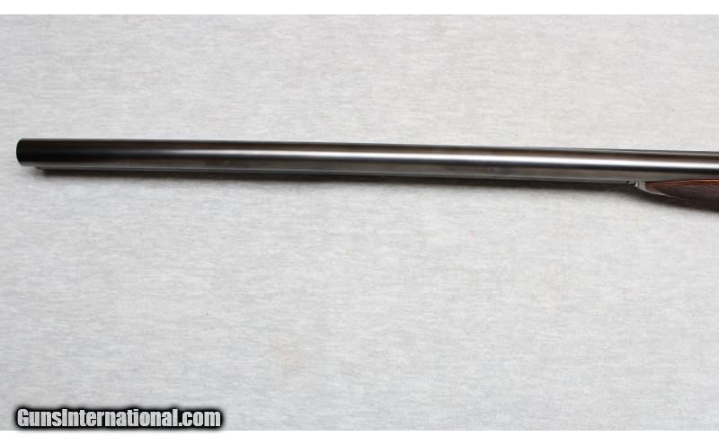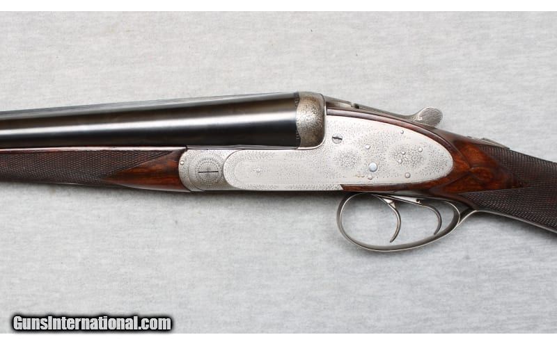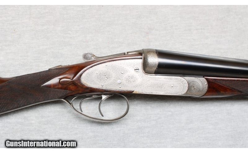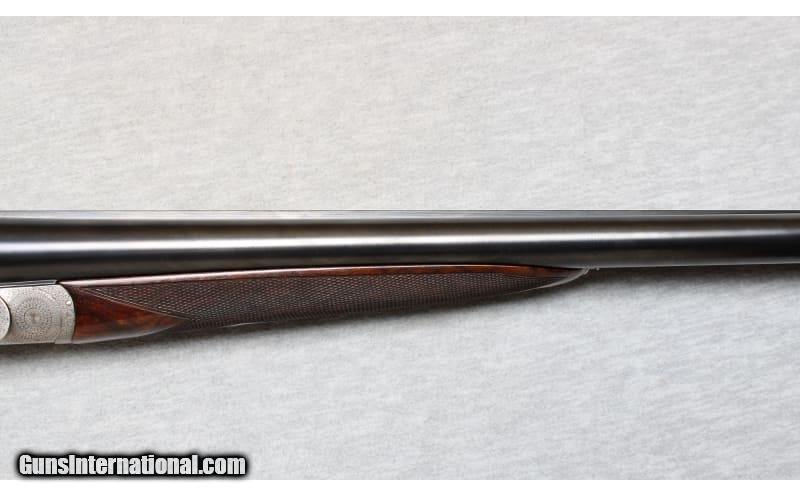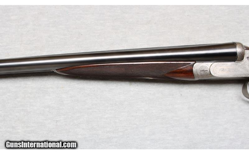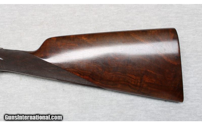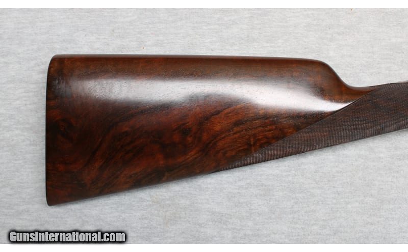Description: Niquet with Purdey Type Action in 12 Gauge. Coin finished self opening sidelock action has safety button deactived, hidden third fastener, bushed strikers, side clips, and double triggers (front articulated). Action is engraved with 80% coverage well cut rose and scroll. Bottom of action is engraved "J. Niquet" " a Liege". Newer straight grip buttstock of well figured dark European walnut measures 14 1/4" over checkered wood butt. Stock features drop points and point pattern checkering. Matching splinter Defourney ejector forend as Anson release, central escutcheon is gold inlaid with a count's crown. The 27 5/8" dovetailed barrels are engraved "Julien Niquet 12 Bore Self-Opening Sidelock" on slightly raised game rib. Barrel flats are stamped with pre-1927 Belgian Nitro proofs for 2 1/2" chambers. STOCK: DAH: 2 1/2". DAC: 1 1/2". LOP: 14 1/4". CAST: approx. 1/4" on. 12 Gauge SOLD Chambers: 2 1/2 Inches Metal Condition: Excellent Wood Condition: Excellent Bore Condition: Bright Barrels: 27 5/8 Inches Triggers: Double triggers Stock Dimensions: 14 1/4 inches Fore End: Anson release splinter fore end Butt Pad: Checkered wood Sights: Silver bead on full rib Chokes: Modified/Full Item Location: La Vista, NE |