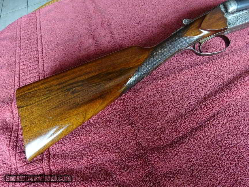 Description: J. PIRE & CO., BELGIUM, 12 GAUGE, 27 1/2" BARRELS, IC AND MODIFIED. EXCELLENT BLUE, PERFECT BORES, 2 1/2" CHAMBERS. BREECH ENDS ENGRAVED, AUTOMATIC EJECTORS, MILLER SINGLE TRIGGER. SCALLOPED FRAME, GORGEOUS DEEP CUT ENGRAVING, 100% COVERAGE, SIDE CLIPS, FENCES, TOP LEVER, TRIGGER GUARD TOTALLY ENGRAVED. STRAIGHT GRIP STOCK, SPLINTER FOREARM WITH FRONT BUTTON RELEASE, ENGLISH WALNUT WITH BLACK STREAKS, VERY FINE CHECKERING, CHECKERED BUTT. GREAT DIMENSIONS, 1 1/2" X 2 1/2" X 13 3/4", 6 POUNDS 2 OUNCES. VERY HIGH QUALITY DOUBLE IN EXCELLENT ORIGINAL CONDITION. CIRCA PRE-WWII, A LOT OF GUN FOR THE MONEY. $2750.00 + $50.00 Insured shipping to an FFL address. See all Pats listings We also have hundreds of pieces of ORIGINAL gun company advertising & memorabilia available for sale. We have no reprints or reproductions. Email for more information. SOLD Curio/Relic: Yes |