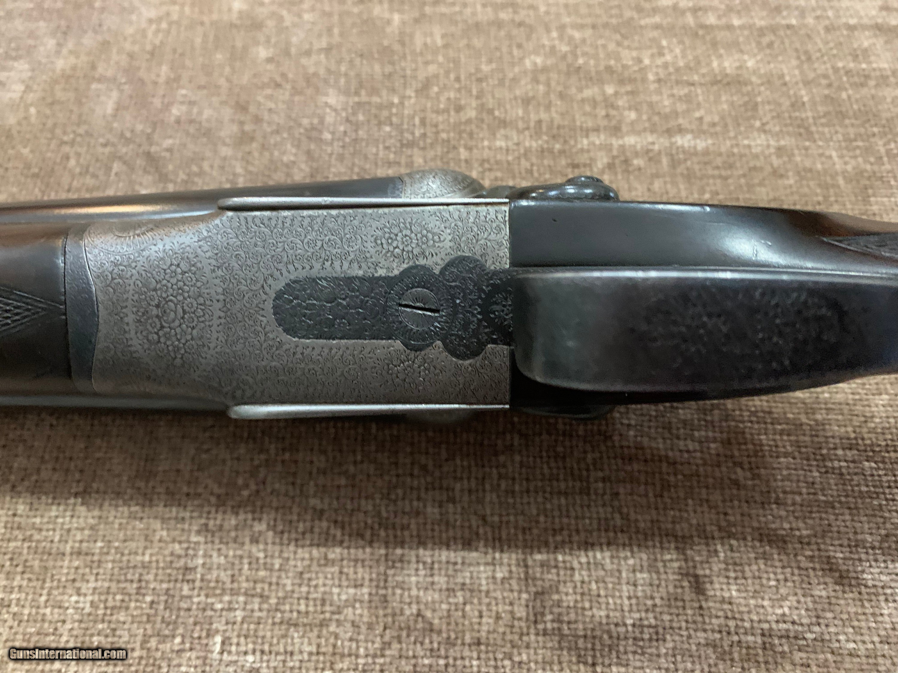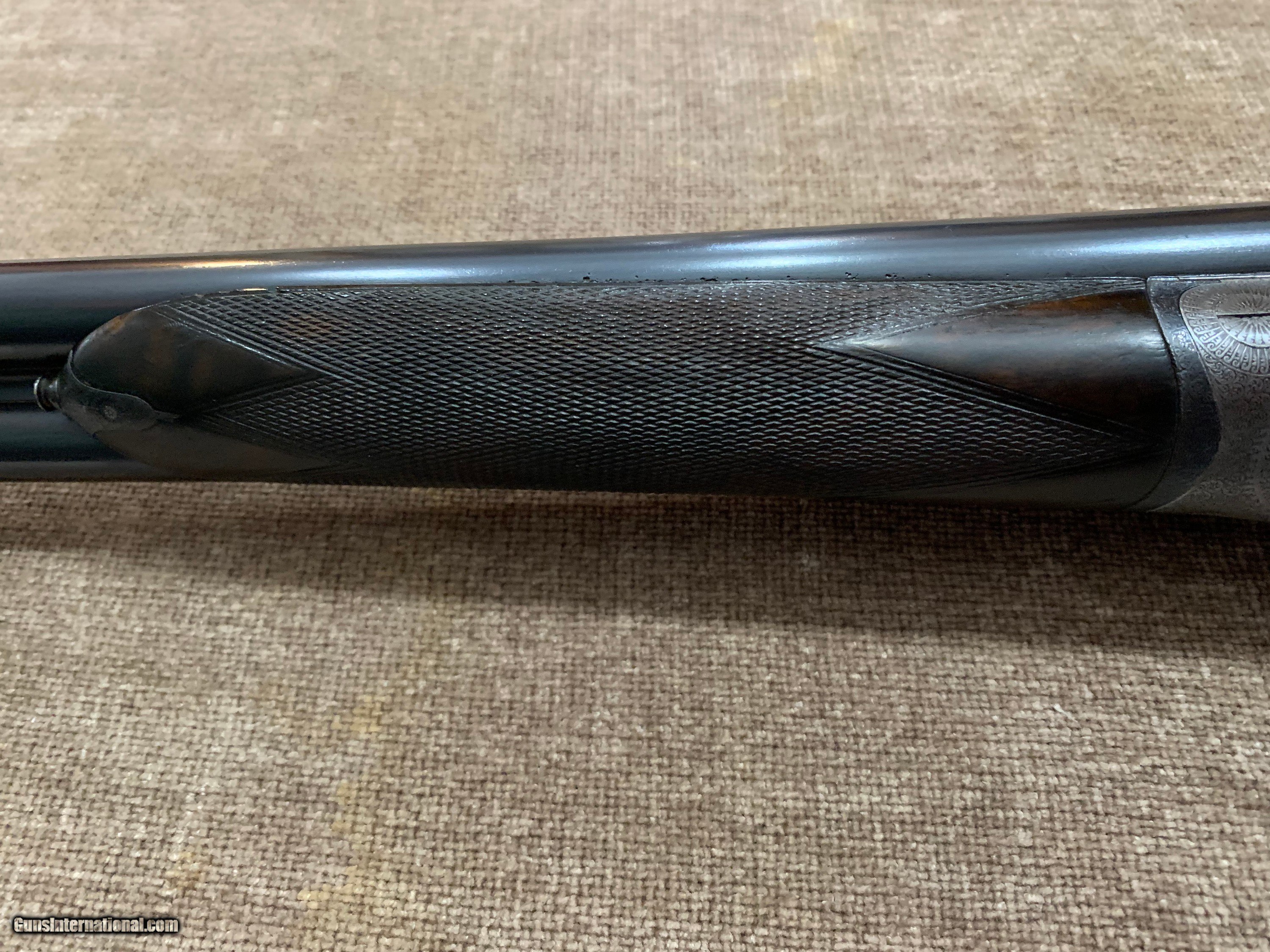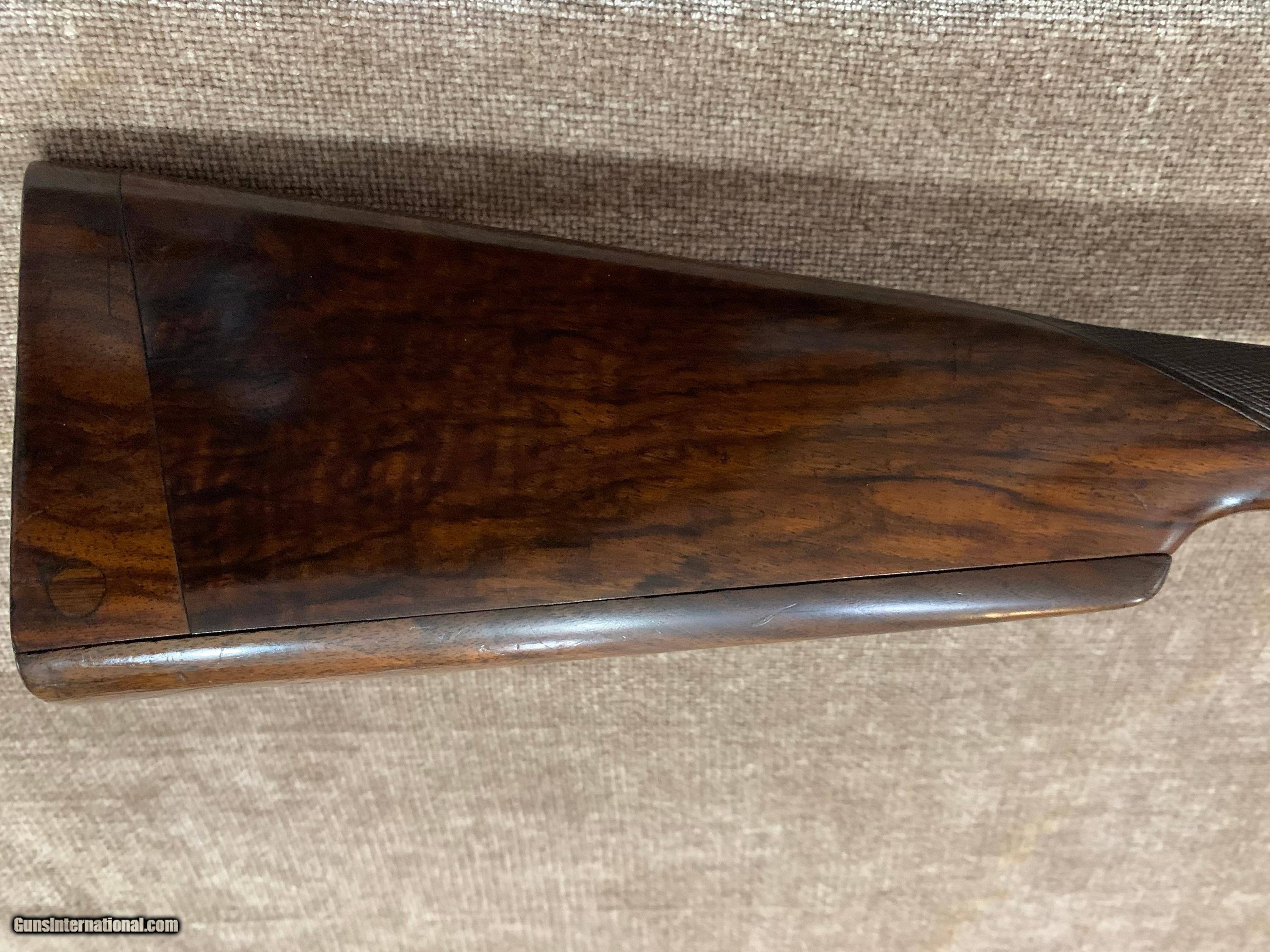 Description: L. BRANCQUAERT "BEST" 12GA REBOUNDING HAMMER GUN WITH 27 1/2" M/F CHOPPER LUMP BARRELS, ARTICULATED FRONT TRIGGER, SIDE CLIPS, PERC FENCES, CROSS BOLT 3RD FASTNER AND UNIQUE THREE REMOVABLE COMBS, #1,2 &3 IN GOLD. STRAIGHT HAND STOCK TO 14 5/8" LOP, WEIGHT 7LBS 1OZ. GUN IS IN FACTORY LEATHER CASE WITH LABEL, 2 PIECE ROD, SNAP CAPS AND NIPPLE WRENCH. GUN HAS TIGHT ACTION, PERFECT BORES AND DOUBLE CHECKERED BUTT. $5500.00 JOHN 443-952-7165. PHONE ONLY PLEASE. FREE SHIPPING. SOLD |