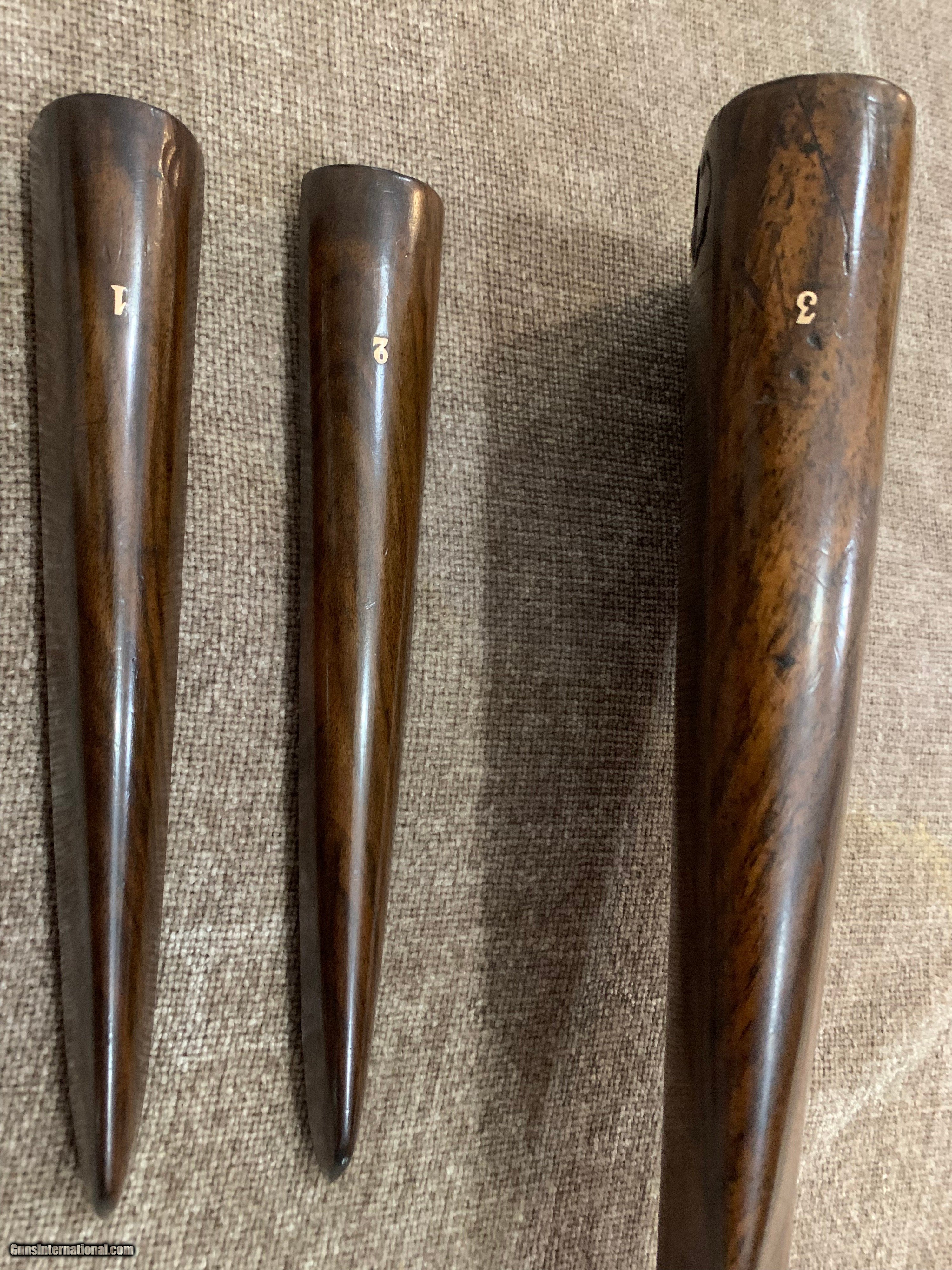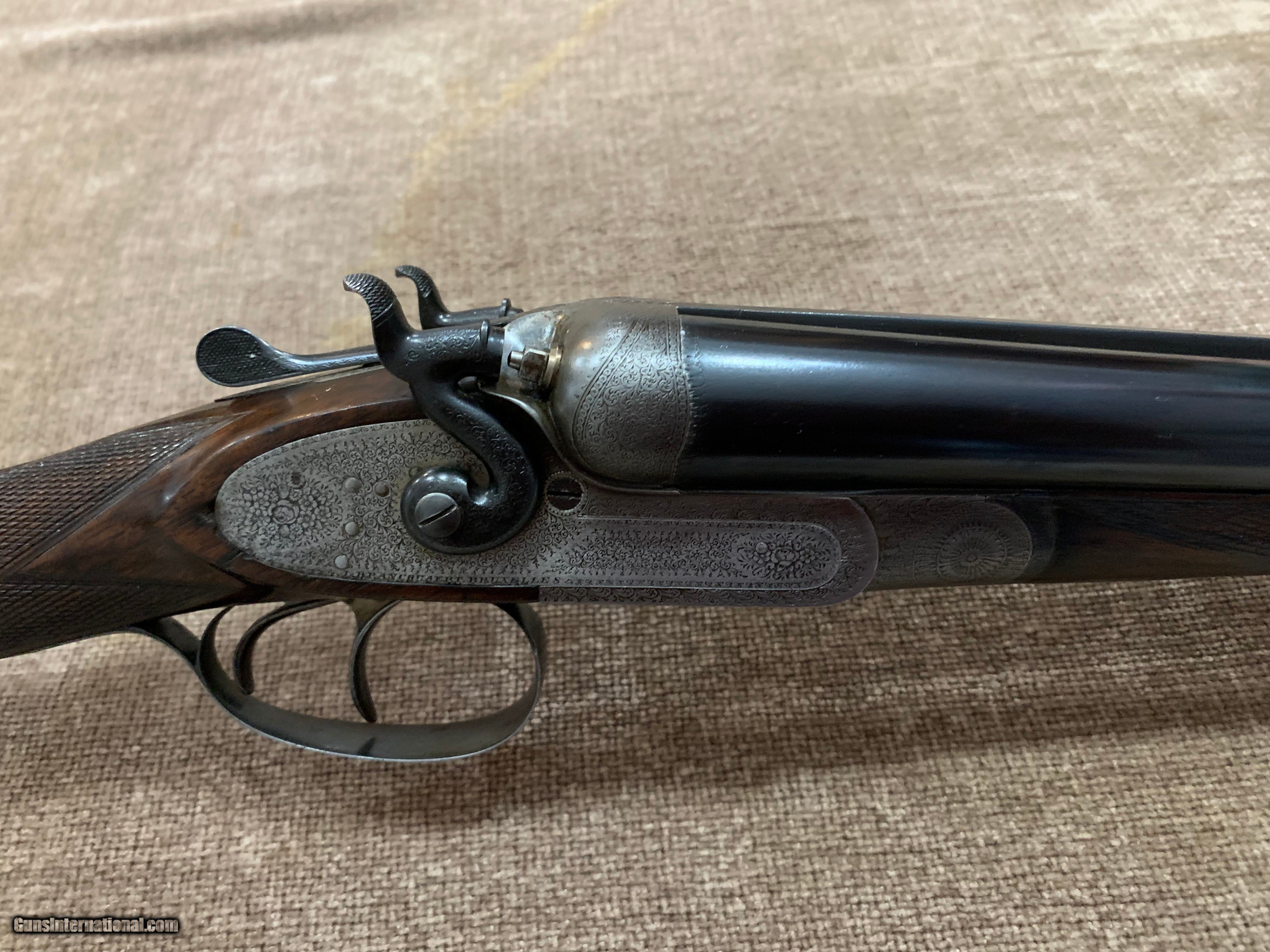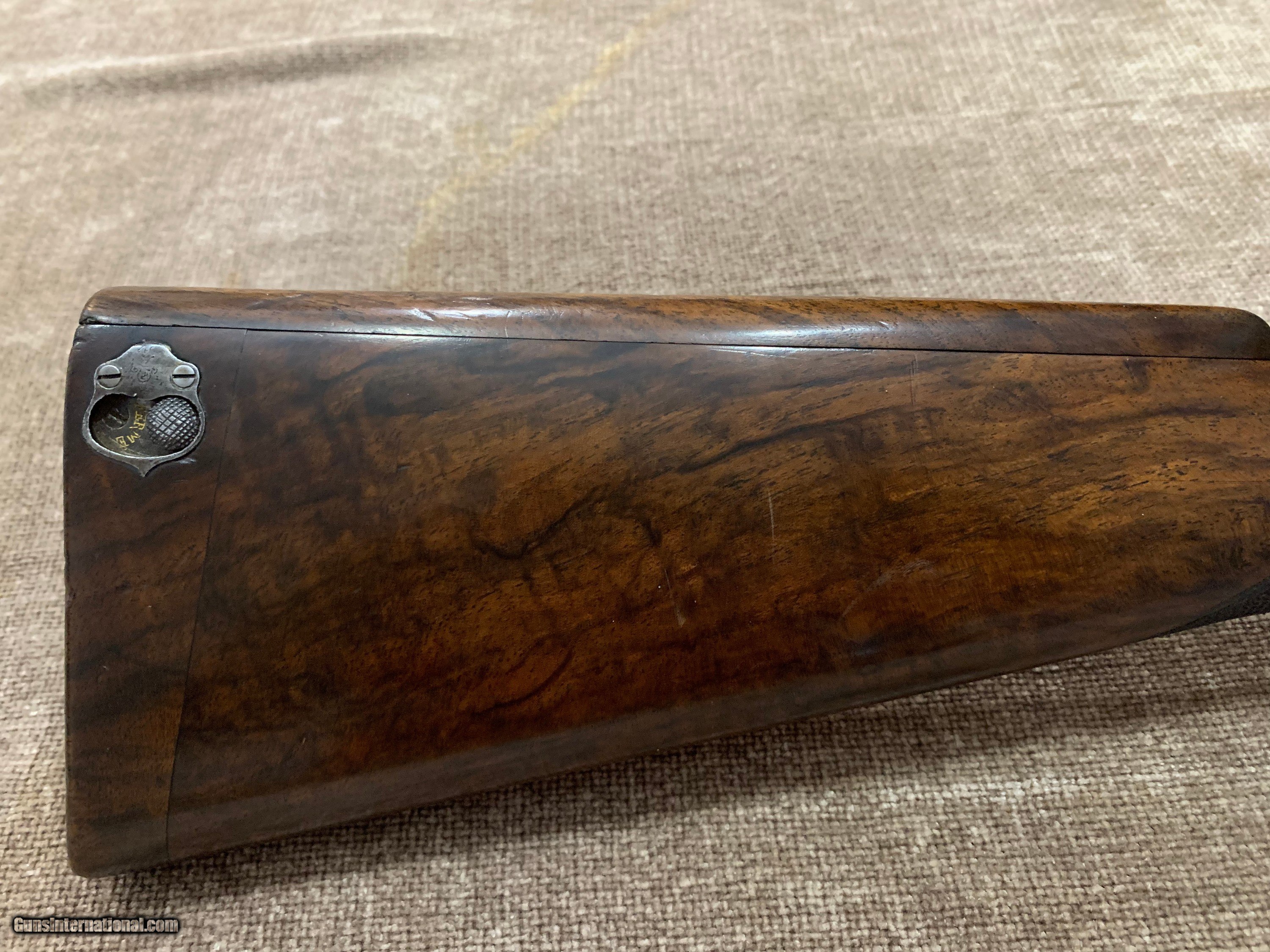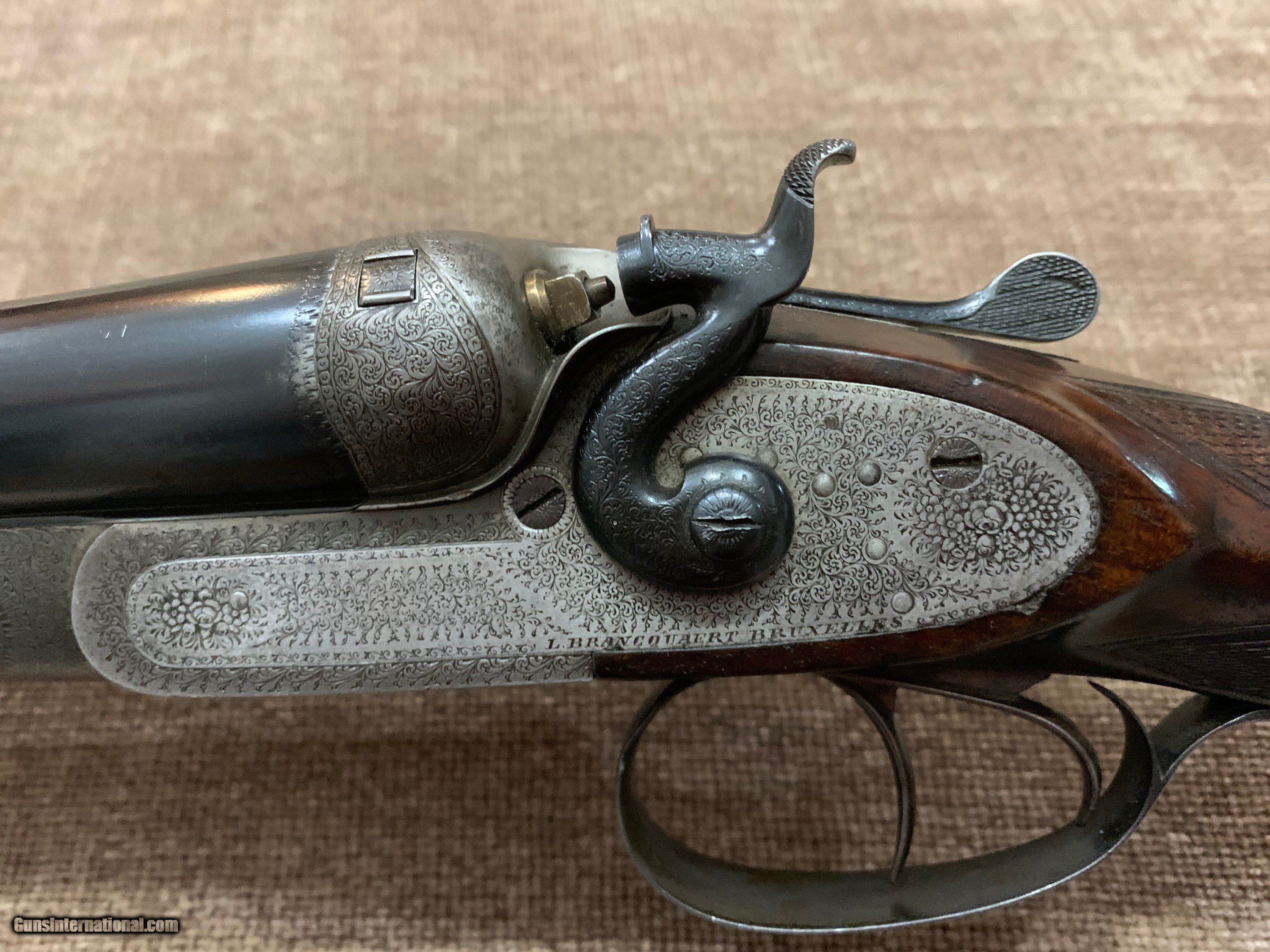 Description: L. BRANCQUAERT "BEST" 12GA REBOUNDING HAMMER GUN WITH 27 1/2" M/F CHOPPER LUMP BARRELS, ARTICULATED FRONT TRIGGER, SIDE CLIPS, PERC FENCES, CROSS BOLT 3RD FASTNER AND UNIQUE THREE REMOVABLE COMBS, #1,2 &3 IN GOLD. STRAIGHT HAND STOCK TO 14 5/8" LOP, WEIGHT 7LBS 1OZ. GUN IS IN FACTORY LEATHER CASE WITH LABEL, 2 PIECE ROD, SNAP CAPS AND NIPPLE WRENCH. GUN HAS TIGHT ACTION, PERFECT BORES AND DOUBLE CHECKERED BUTT. $5500.00 JOHN 443-952-7165. PHONE ONLY PLEASE. FREE SHIPPING. SOLD |
