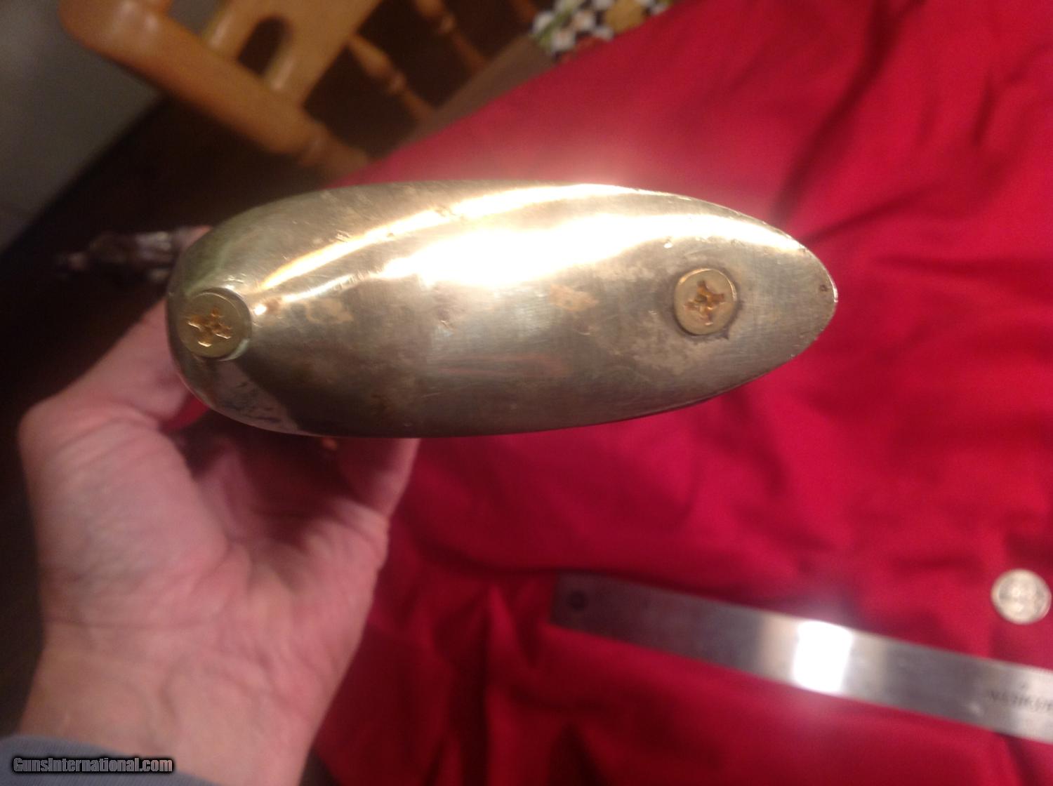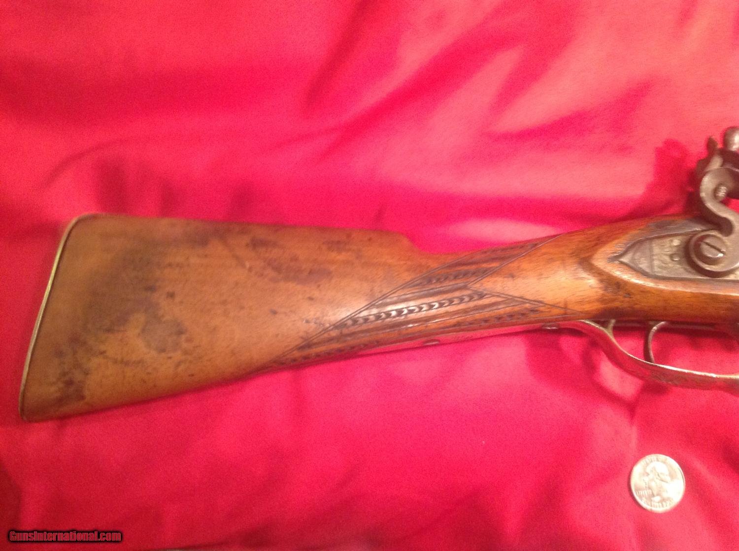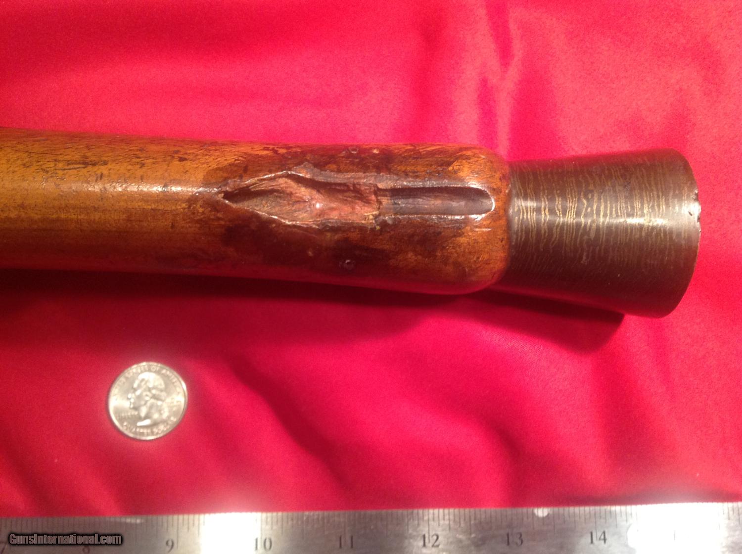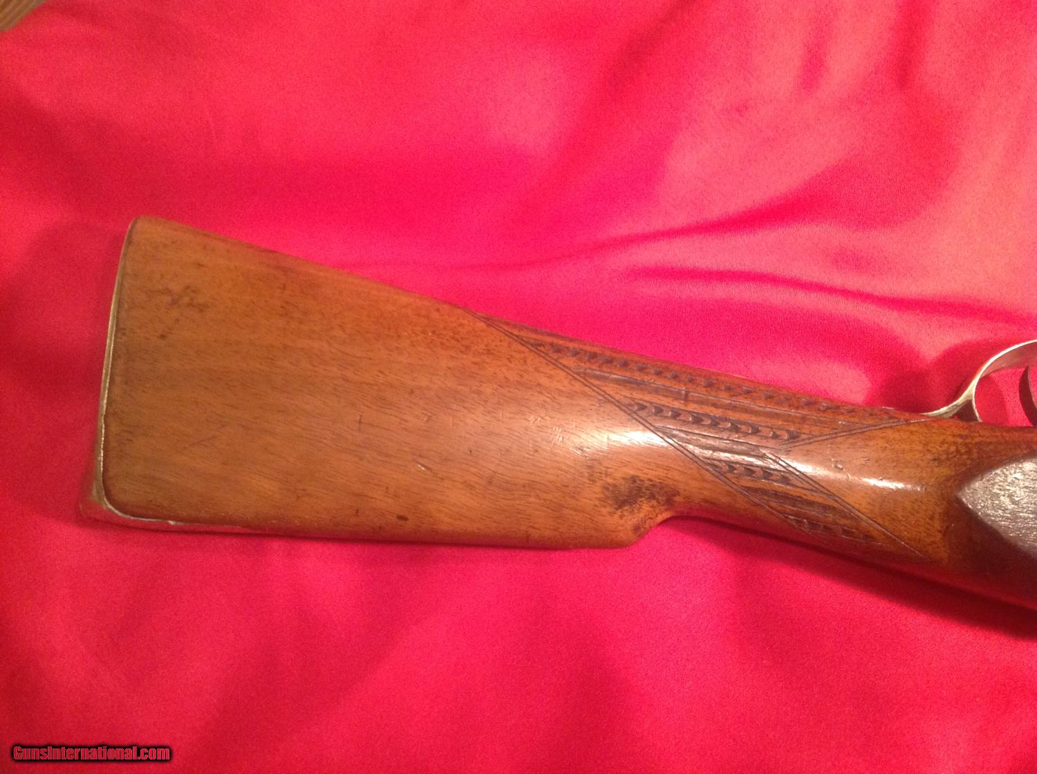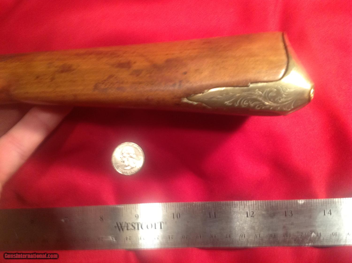 Description: This beauty has been in our family for the past 70 years. The only manufacturers mark is on the barrel and is partially hidden by the stock. Visible is the right hand Side of the circle of the Belgium mark showing a capital E on the top and a capital G on the bottom. Very nice scroll work can be seen on the trigger guard and the top of the butt plate. Also beautiful etching in the stock. The ram rod is missing and initials have been scratched inside the trigger guard...see pix. When storing this gun in my safety deposit box I had to take the butt plate off and replaced the original screws with new ones...see pix. SOLD Antique: Yes |