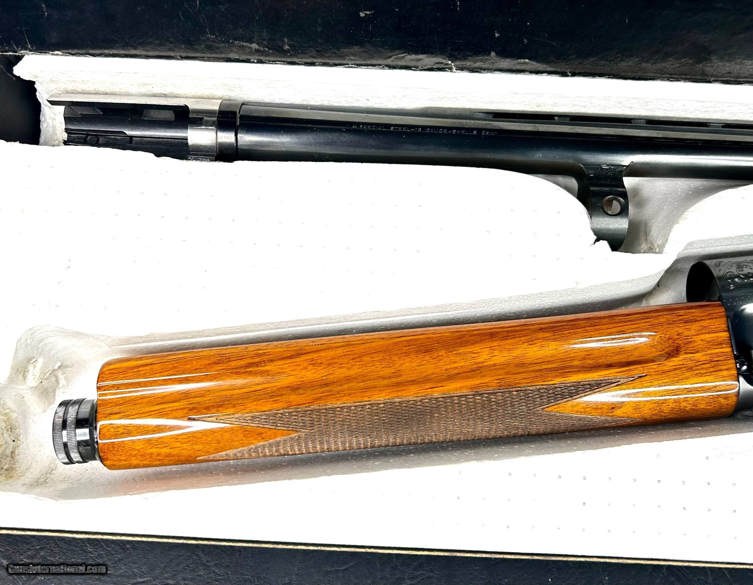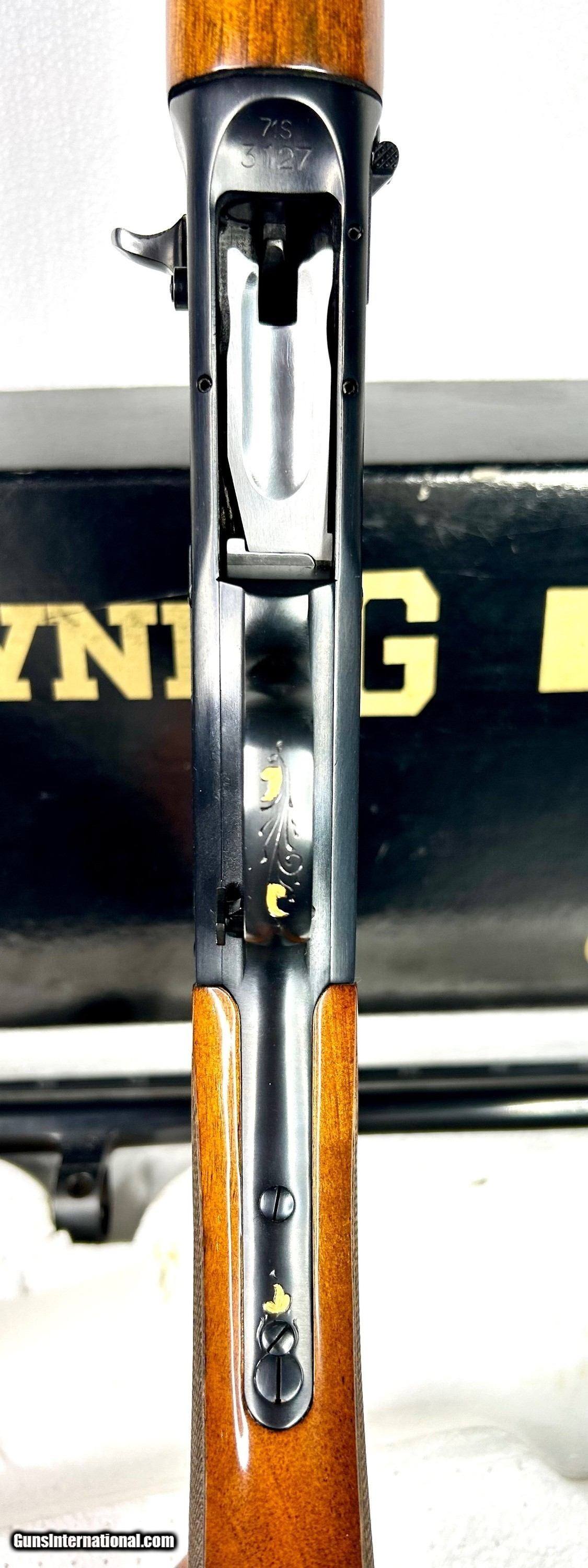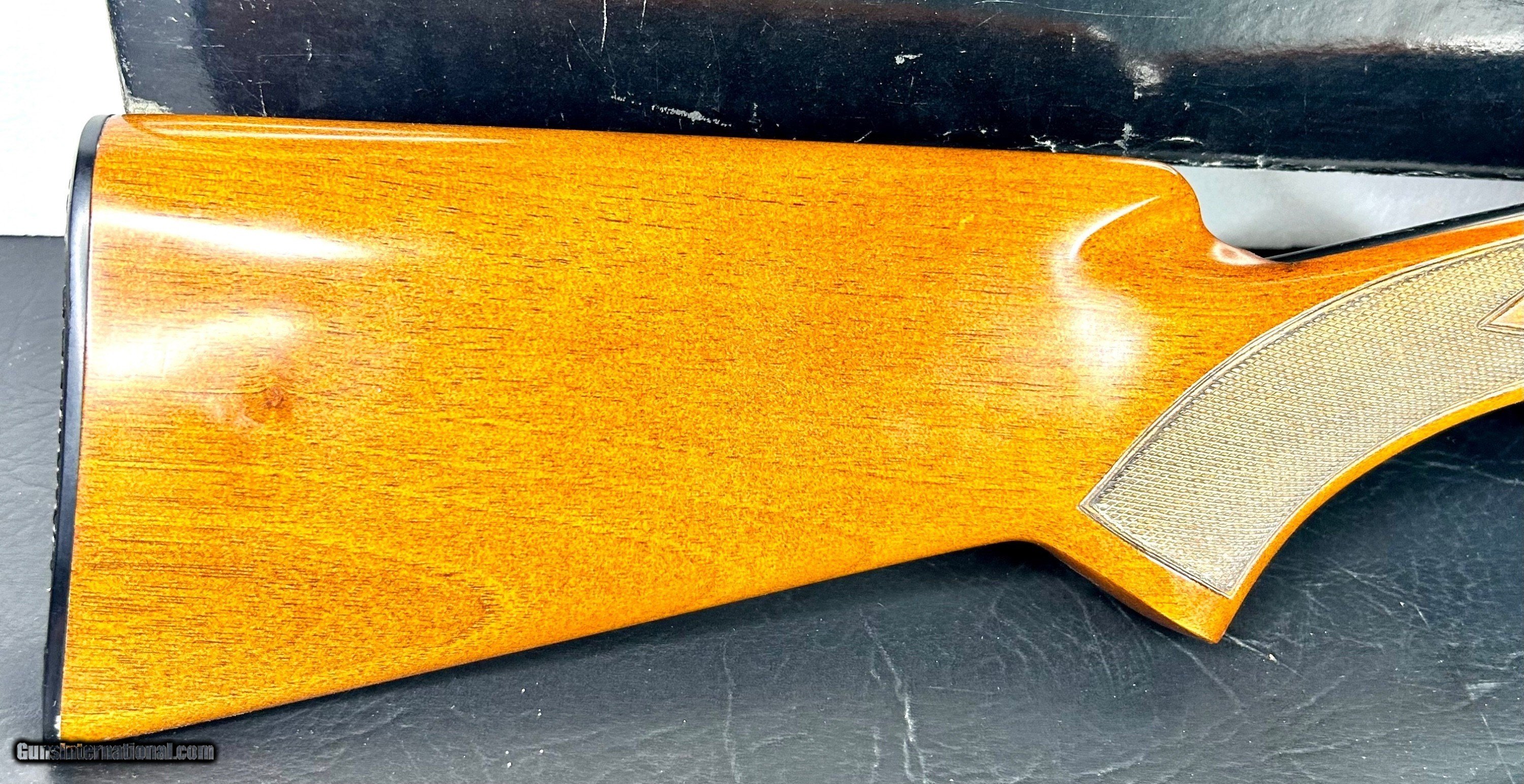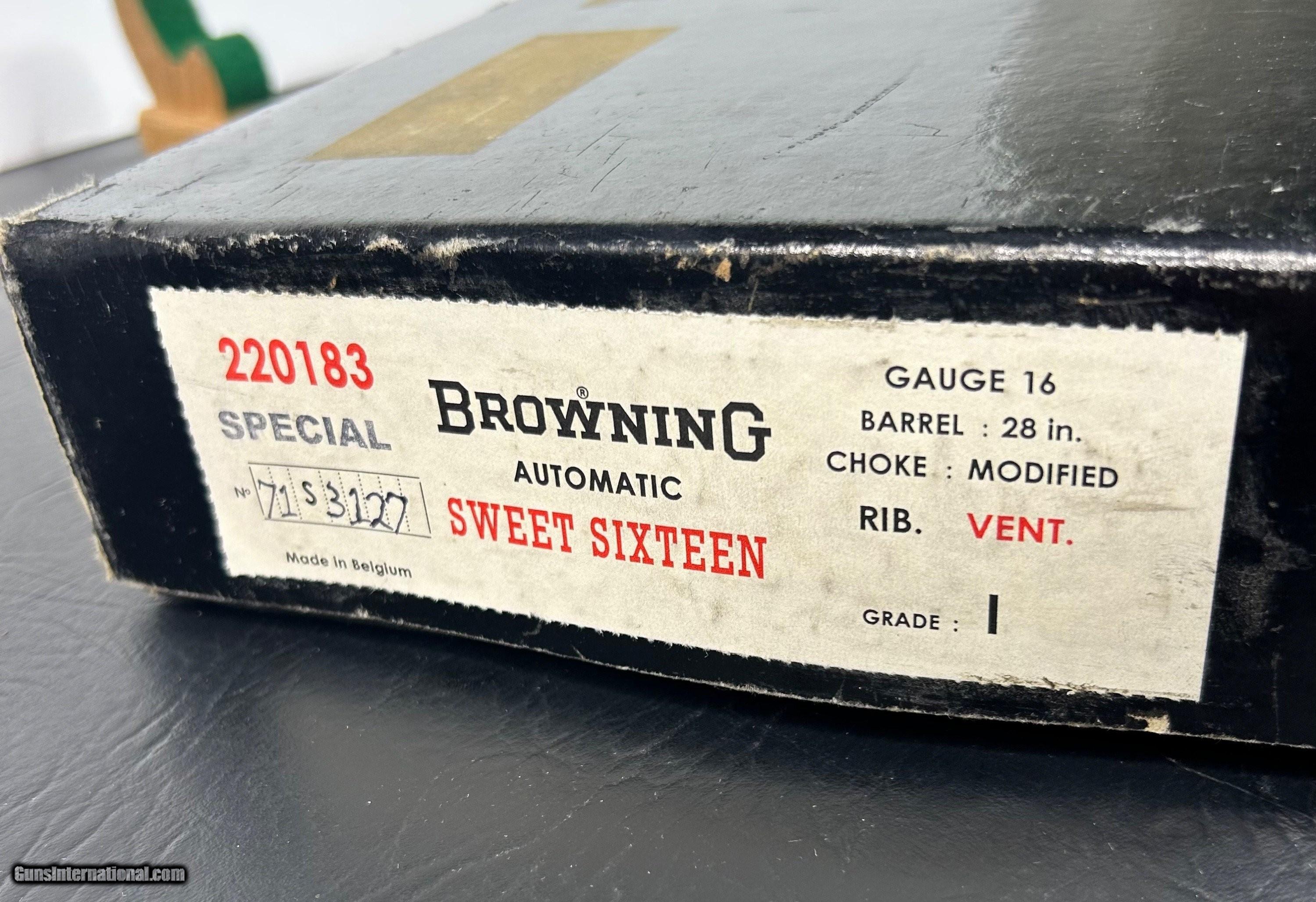 Description: A very nice Belgium Browning A5 Sweet 16 manufactured in 1971 in original labeled box. This appears to have been a Special order Sweet 16. John Browning's portrait is hi-lited with a gold border. Also, there are gold inlays on the trigger guard. One of the last Belgium Browning Sweet 16's. This gun is new old stock and it appears to have never been assembled. Curio/Relic: Yes Shotgun Gauge: 16 Gauge Manufacturer: Browning Model: A5 Serial Number: 71S3127 Barrel Length: 28 Bore Info: 16 ga Chambers: 2-3/4 Condition: New Metal Condition: New Wood Condition: New Bore Condition: New Barrels: 28 inch Barrel Type: Vented Rib Action: Semi Auto Triggers: Gold Plated Chokes: Modified Case: Original Shipping Case Item Location: PA Price: $3,900.00 Shipping: $100.00 Contact Seller |